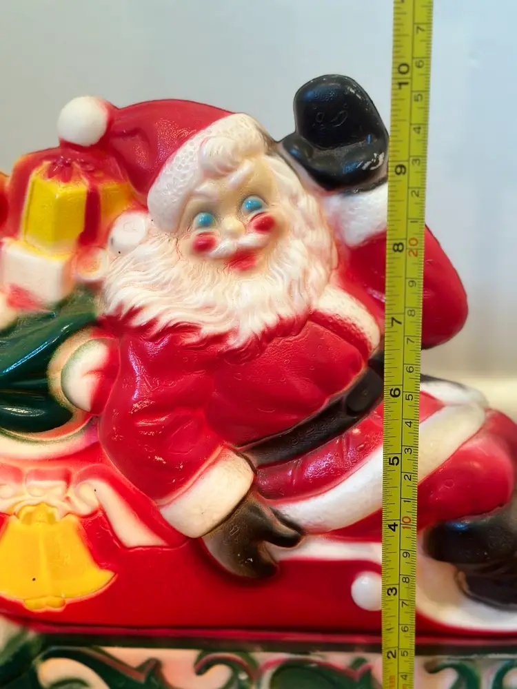 Bring some vintage charm to your Christmas decor with this Empire tabletop Santa Sleigh and 2 reindeer. Made of lighted blow mold, this collectible figurine is perfect for the holiday season. The multicolor Santa Claus is depicted driving his sleigh, accompanied by two reindeer, and is sure to add a touch of festive cheer to your home.