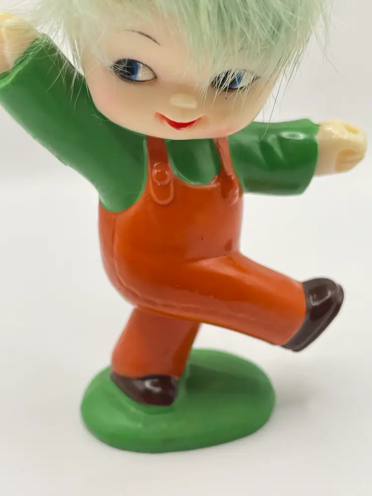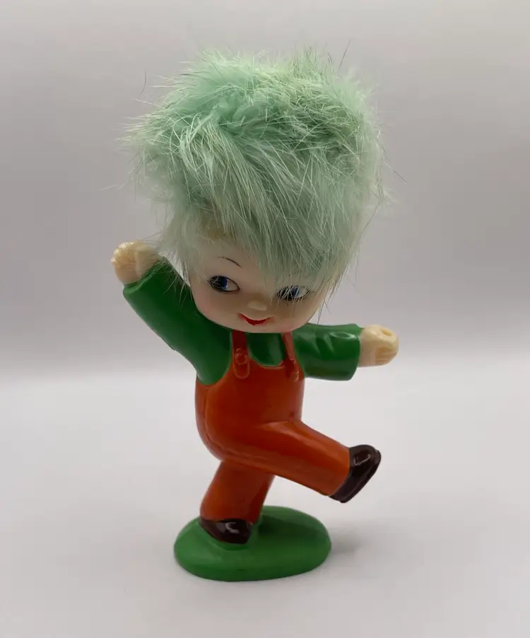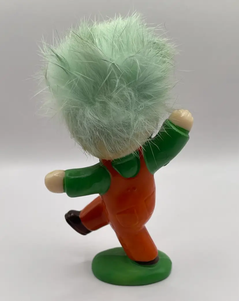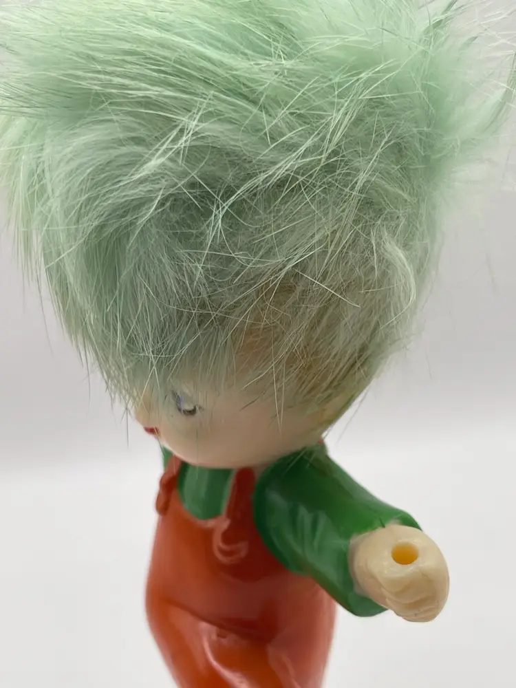 Adorable “It’s the Berries” plastic figurine. It is wearing a green shirt with orange overalls and has fuzzy hair. I’d describe it as a mint green color. It’s mainly green with a hint of blue. 5 inches tall. In good vintage condition. There is some hair loss on the back and side of head (please see pictures for details). These figurines would often hold signs that said things like “Happy Birthday”, but this one does not have a sign.