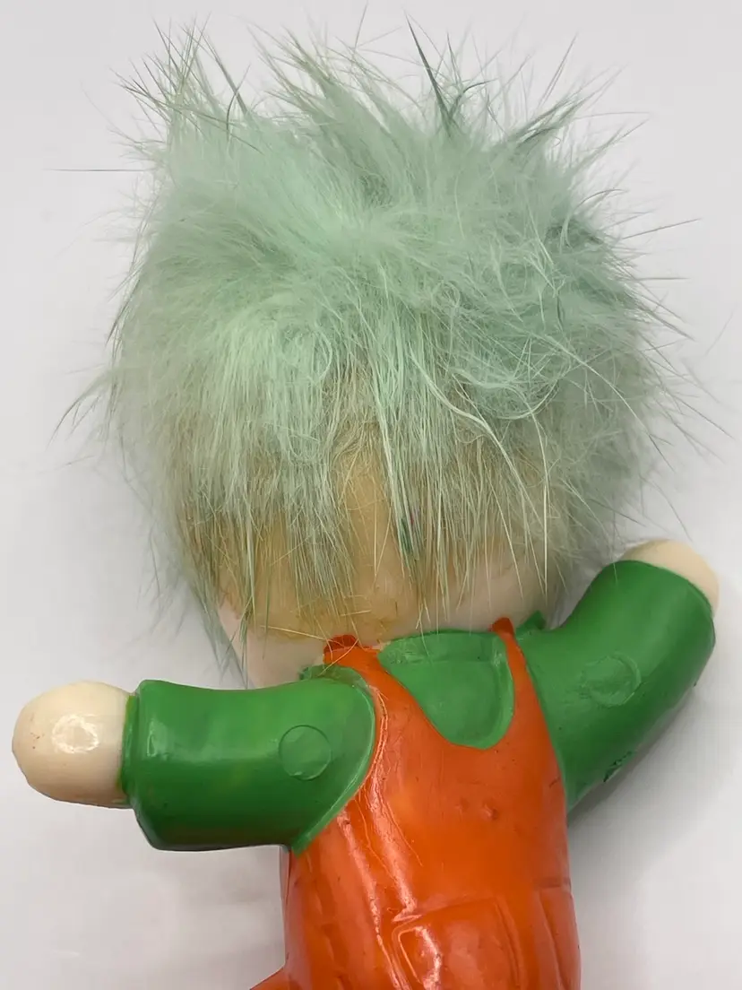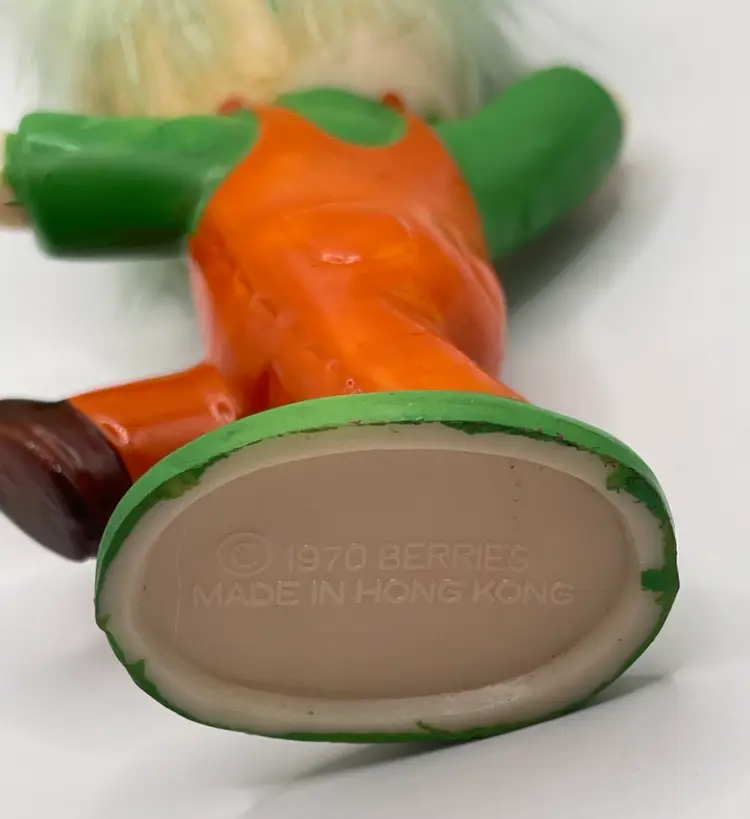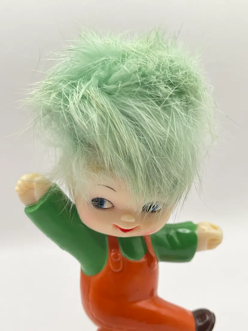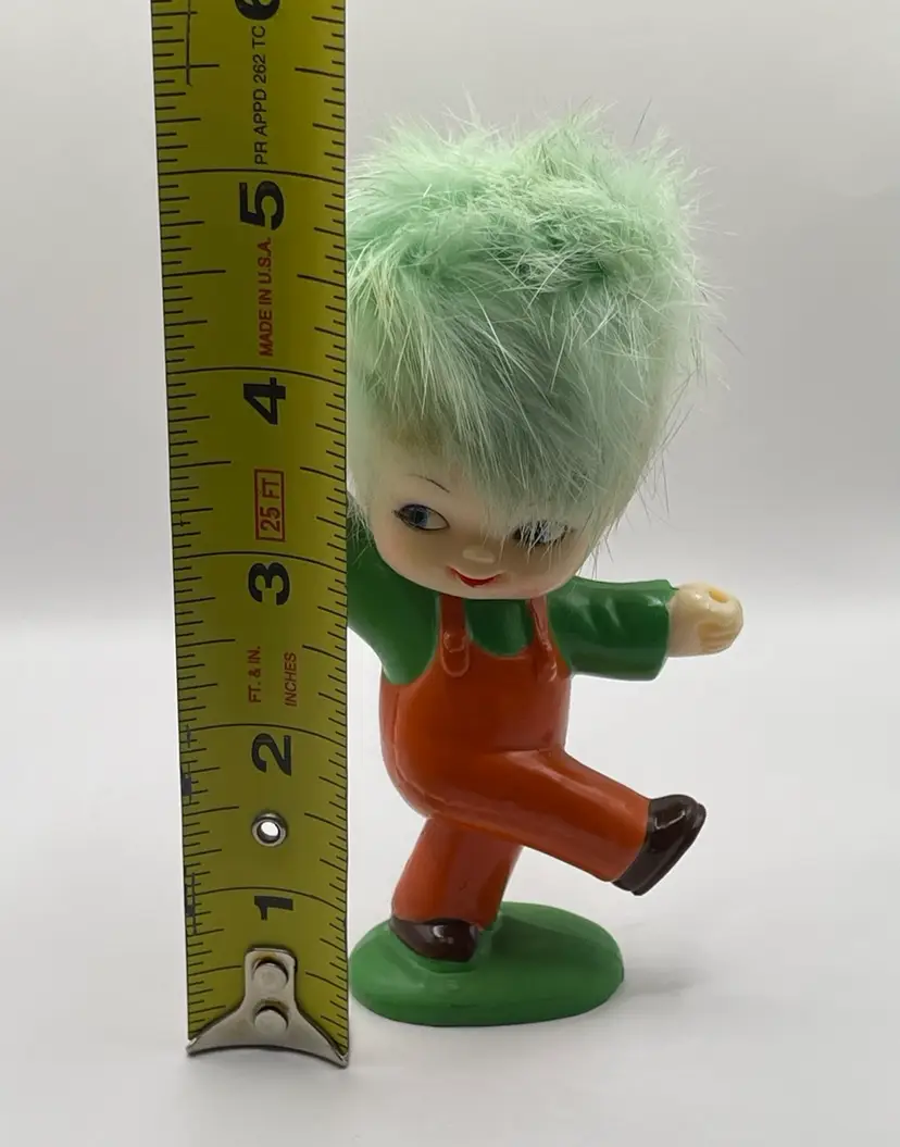 Adorable “It’s the Berries” plastic figurine. It is wearing a green shirt with orange overalls and has fuzzy hair. I’d describe it as a mint green color. It’s mainly green with a hint of blue. 5 inches tall. In good vintage condition. There is some hair loss on the back and side of head (please see pictures for details). These figurines would often hold signs that said things like “Happy Birthday”, but this one does not have a sign.