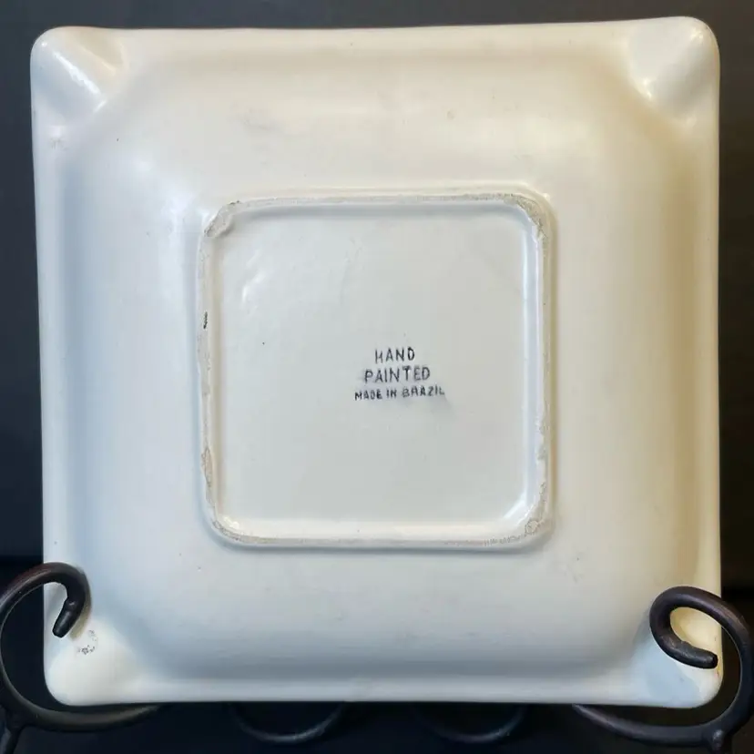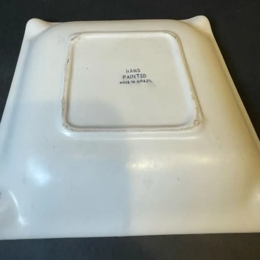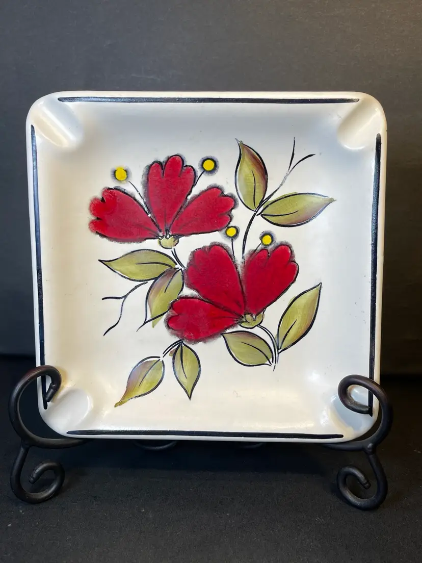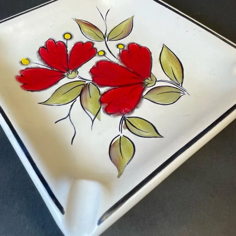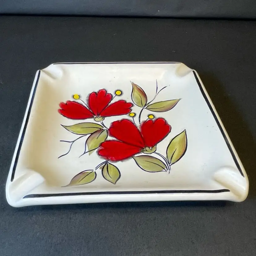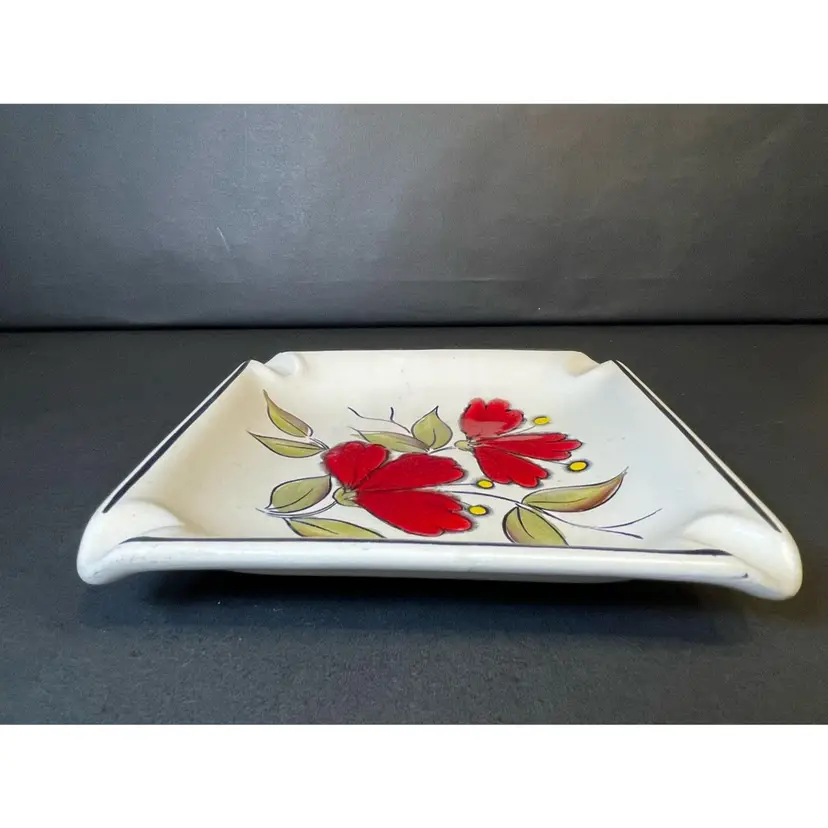 Vintage ashtray hand-painted with red floral design. This piece measures 7.25 inches square and is made from a heavy ceramic. It’s in great condition and stamped on back as made in Brazil. This would make a great trinket dish!