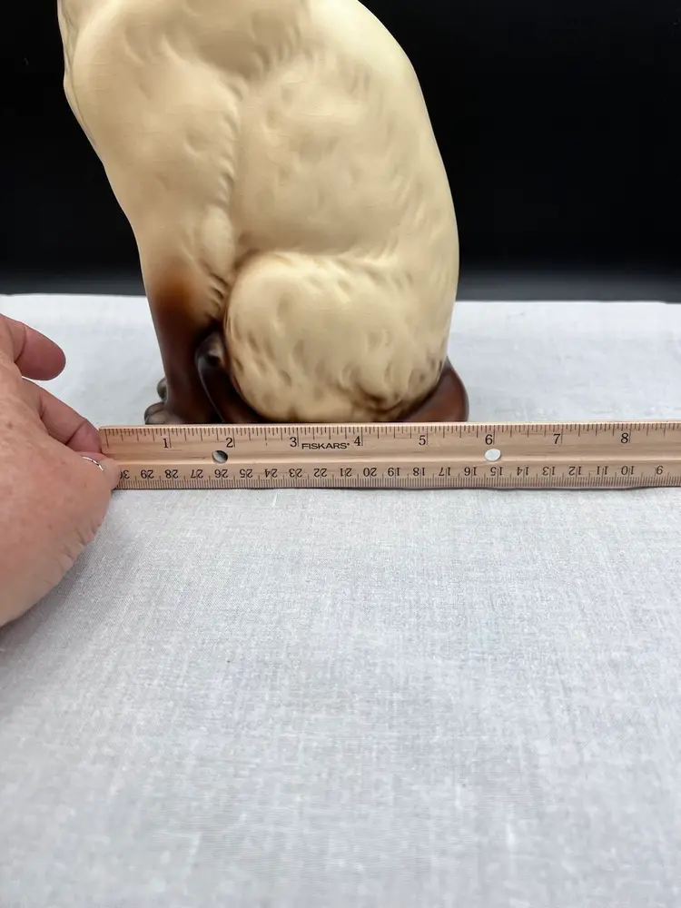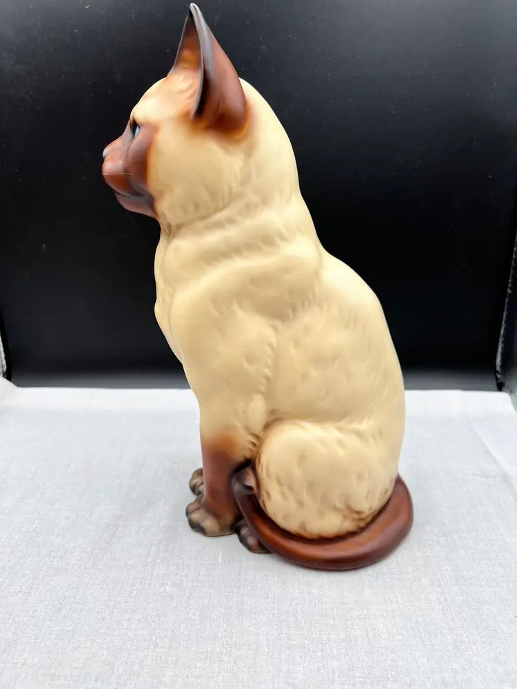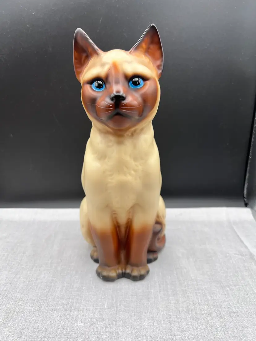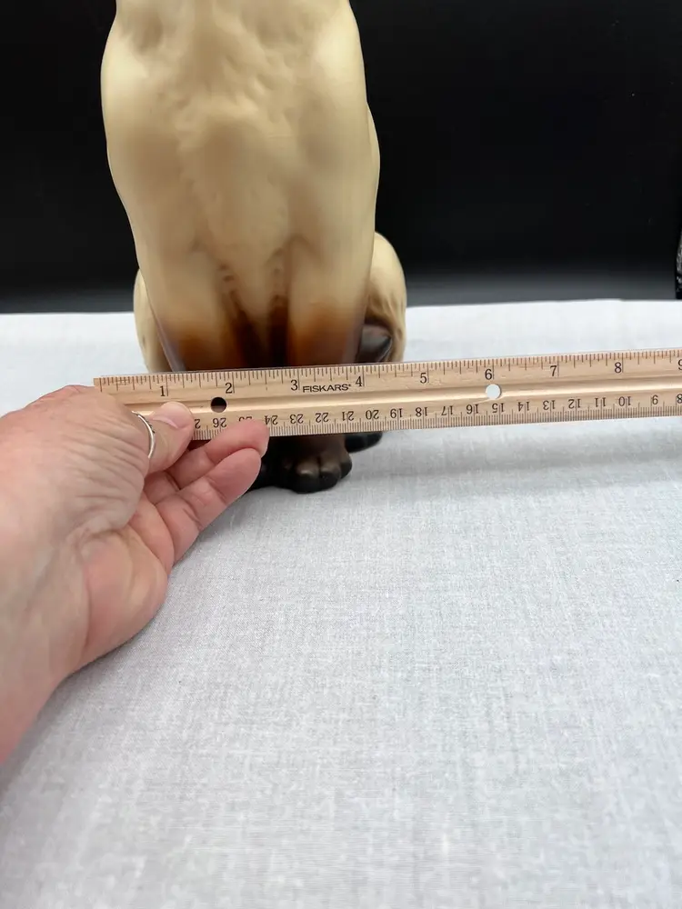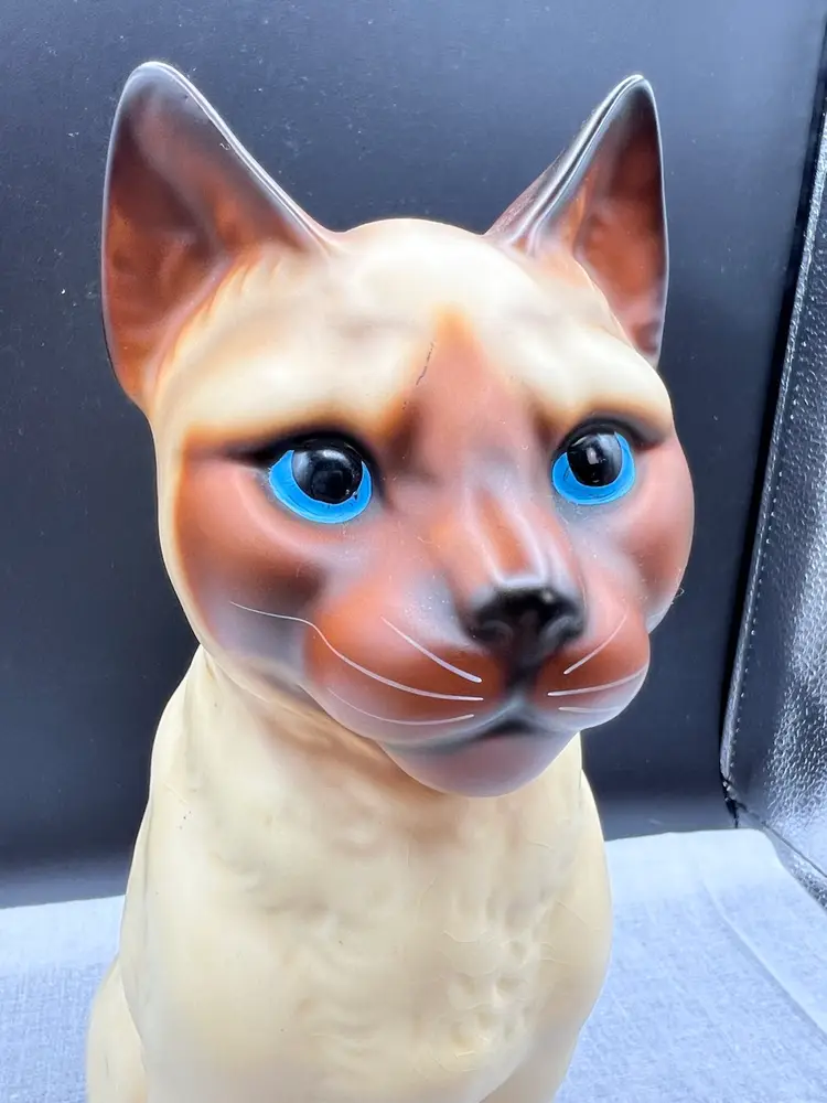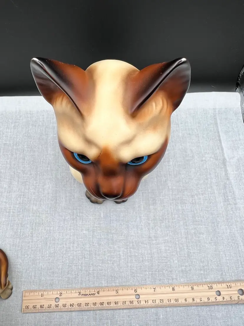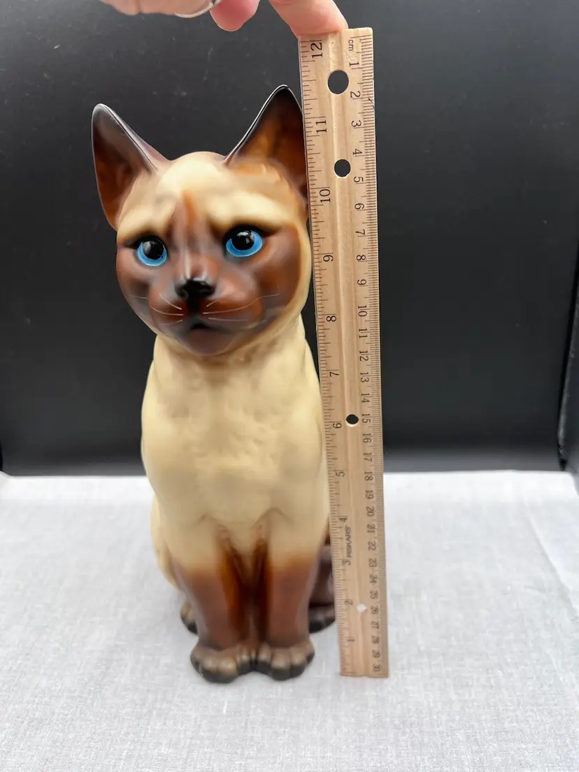 Vintage 1970's large tan and brown cat with bright blue eyes. This statue/figurine was sold in K-Mart stores and was made in Japan. 11” tall x 5” wide In very good vintage condition. No cracks, but there are a few tiny glaze chips - see pics for details. It is starting to show signs of crazing