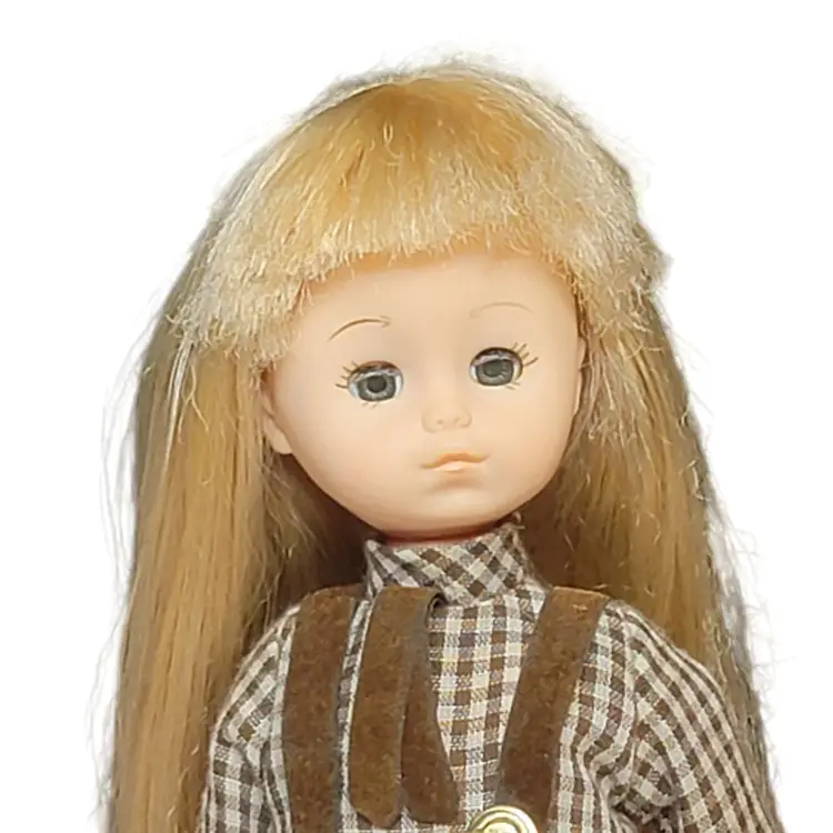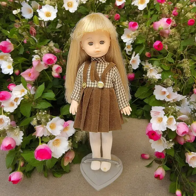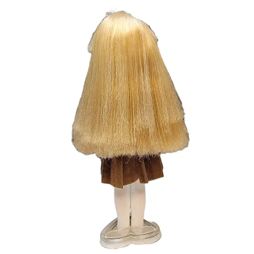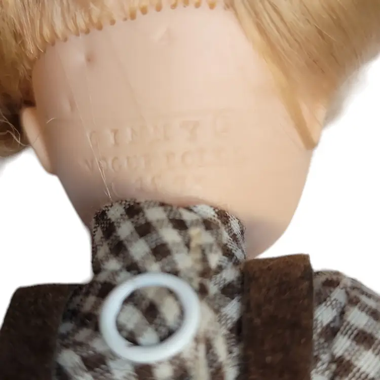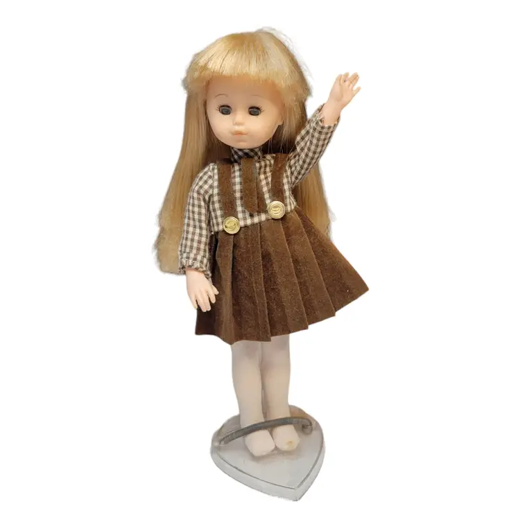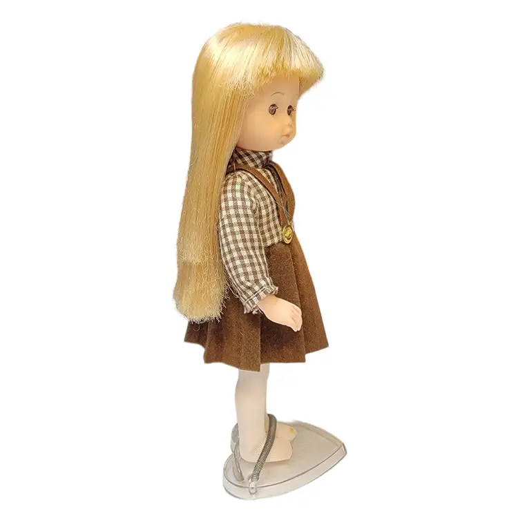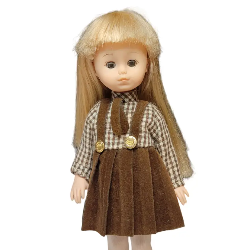 Adorable vintage 1970's blonde doll dressed in a charming brown plaid dress with pleated skirt and button details. Perfect for collectors or as a nostalgic gift. Comes with a clear stand for display. No shoes