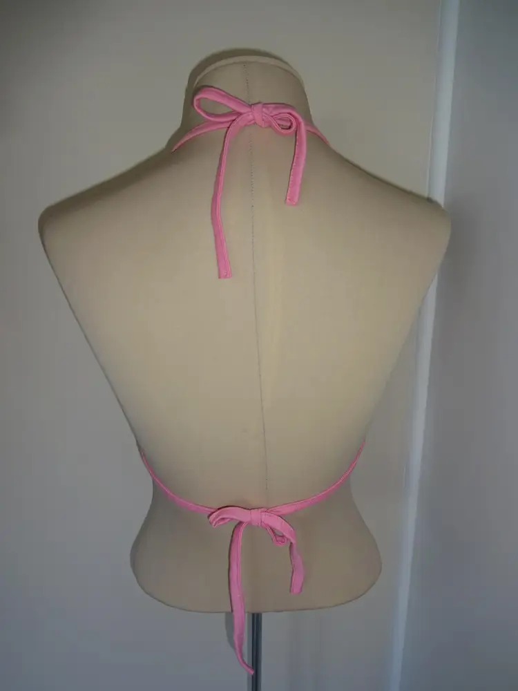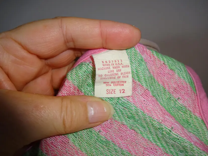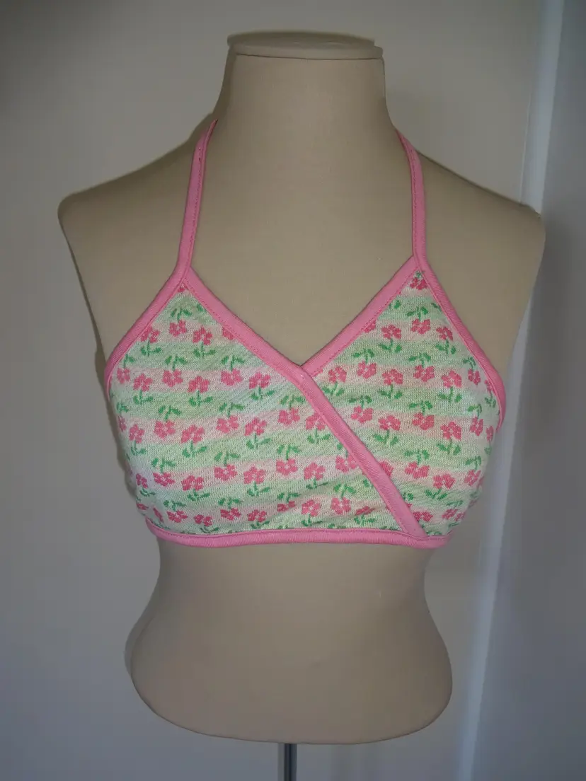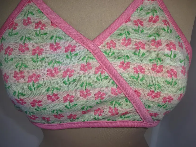 Very good pre-owned condition. A pink and green striped, triangle top with pink flowers throughout and pink trim/ties. Unlined. 50% Cotton and 50% Polyester. Made in the USA. Approximate measurements (not body measurements): bust 29" (dress form bust is 35" so there is obvious stretch and of course the ties); bottom, without ties, 17-1/4", and including ties, 47-1/2"; top of triangle to hem 7". No rips, tears or stains.