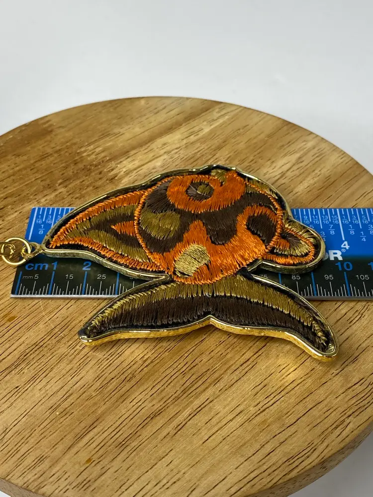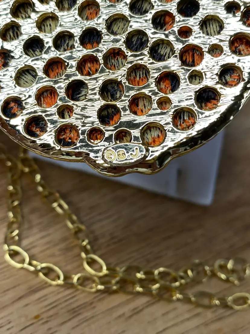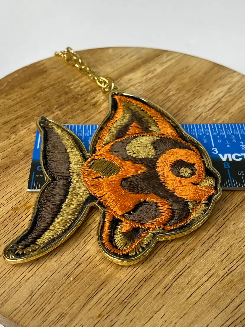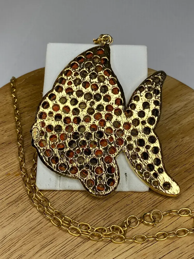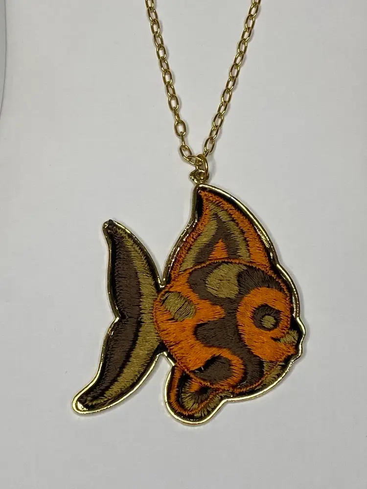 This vintage 1970's Beatrix Jewelry necklace features an embroidered fish pendant in gold tone. The pendant hangs from a 24" spring ring closure and is signed by the designer. The mid century modern colored fish is a beautiful representation of nature, beach, and sea life themes.