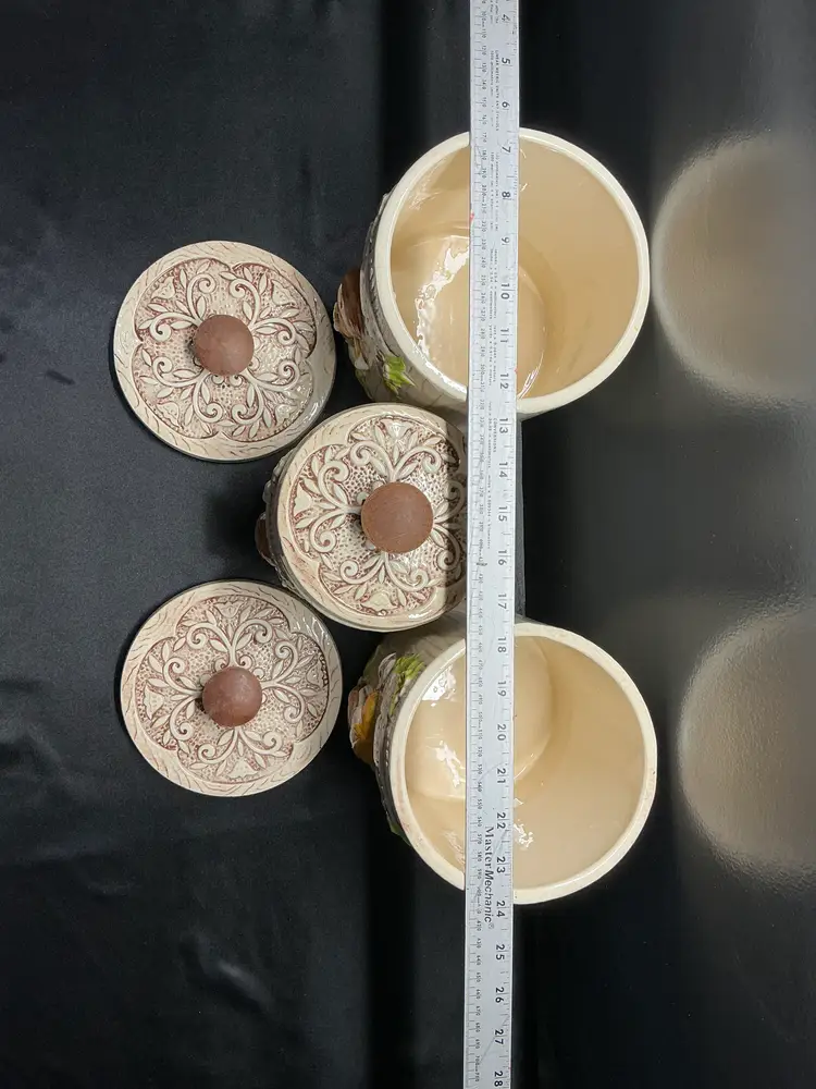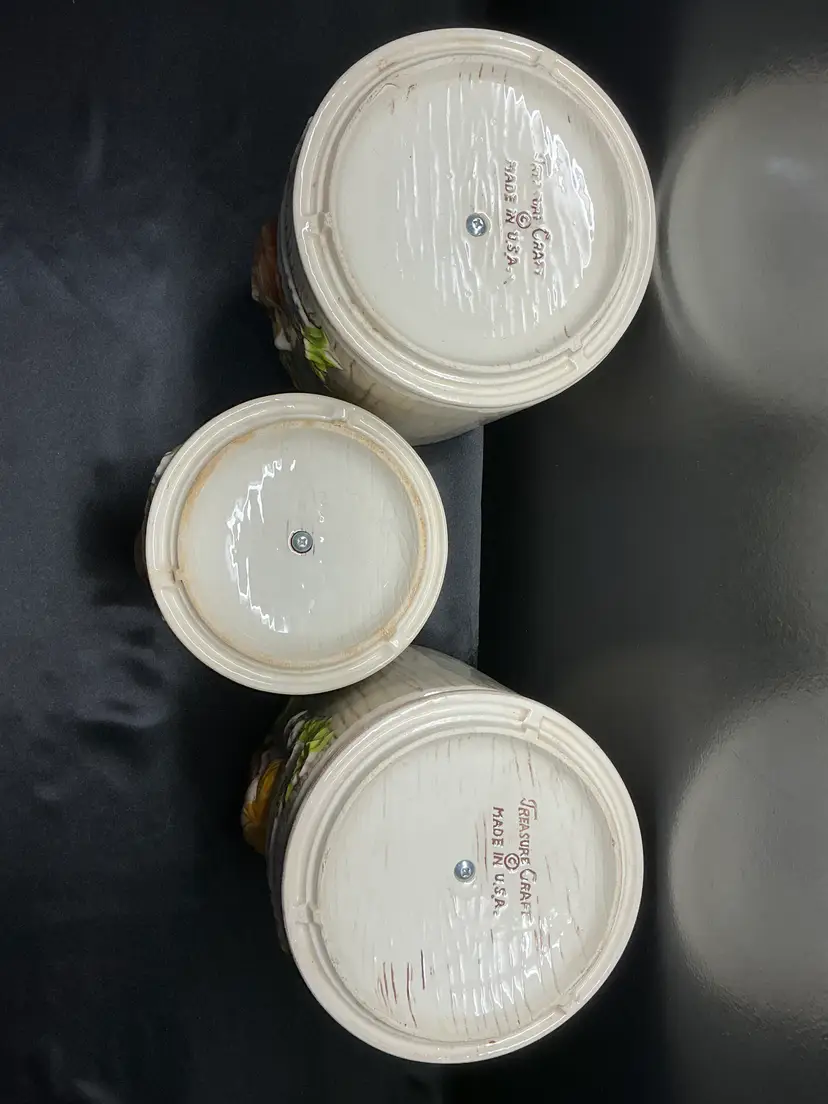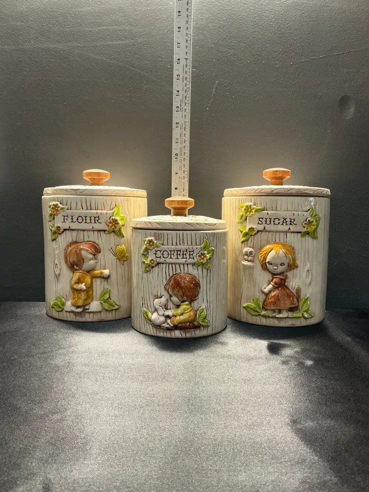 Charming vintage ceramic kitchen canister set featuring delightful raised relief designs of a boy, girl, and playful animals. Each canister is labeled for Flour, Sugar, and Coffee. The pieces have a rustic woodgrain texture with hand-painted details in earthy tones, giving them that perfect 1970s farmhouse charm.