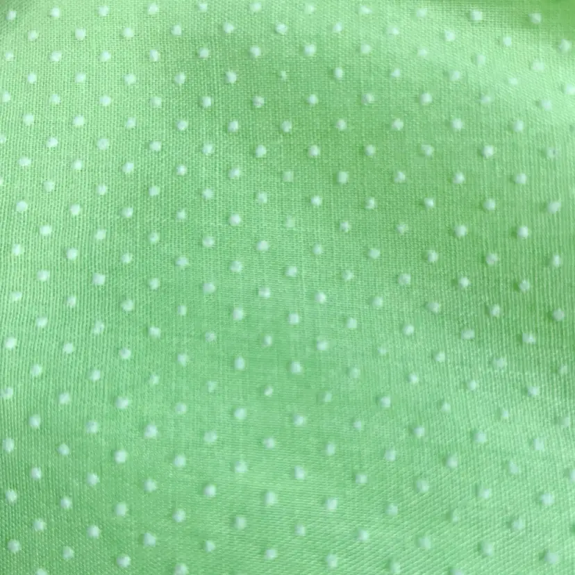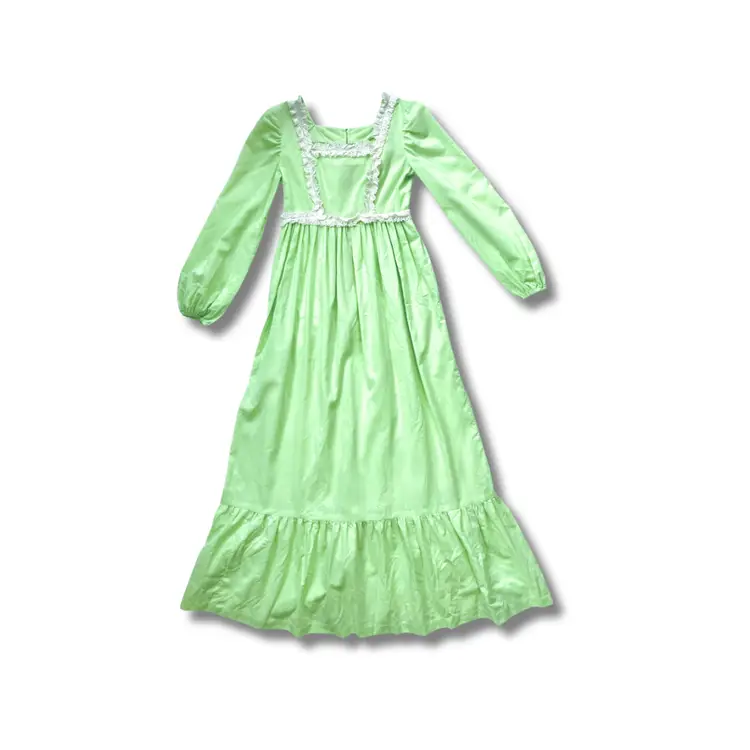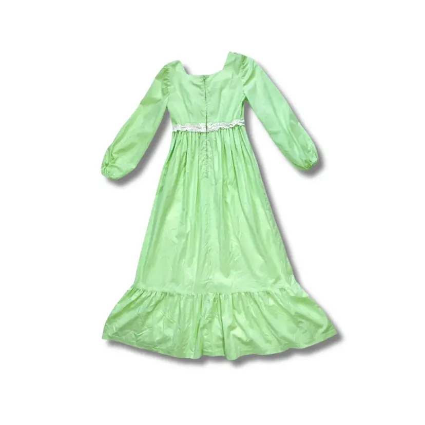 Handmade 1970s lime sherbet cotton Swiss dot prairie maxi dress. Trimmed in white lace and features elastic blouson sleeves, nylon back zipper, a ruffle hem. Excellent condition with no flaws to note.