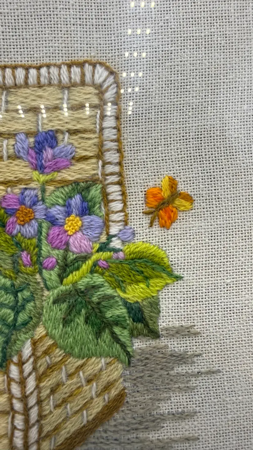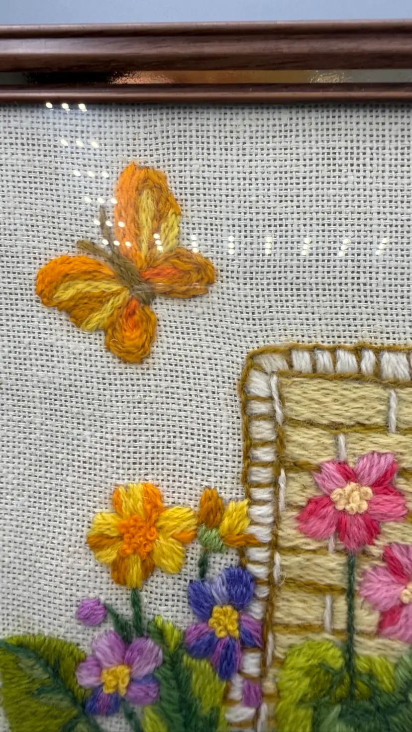 Whimsical charm of a 1970s spring garden with this exquisite, hand-stitched crewel embroidery piece. Featuring a textured wicker basket overflowing with a bouquet of colorful wildflowers and fluttering butterflies, this artwork showcases master-level needlework with beautifully raised wool yarn on a natural linen ground.