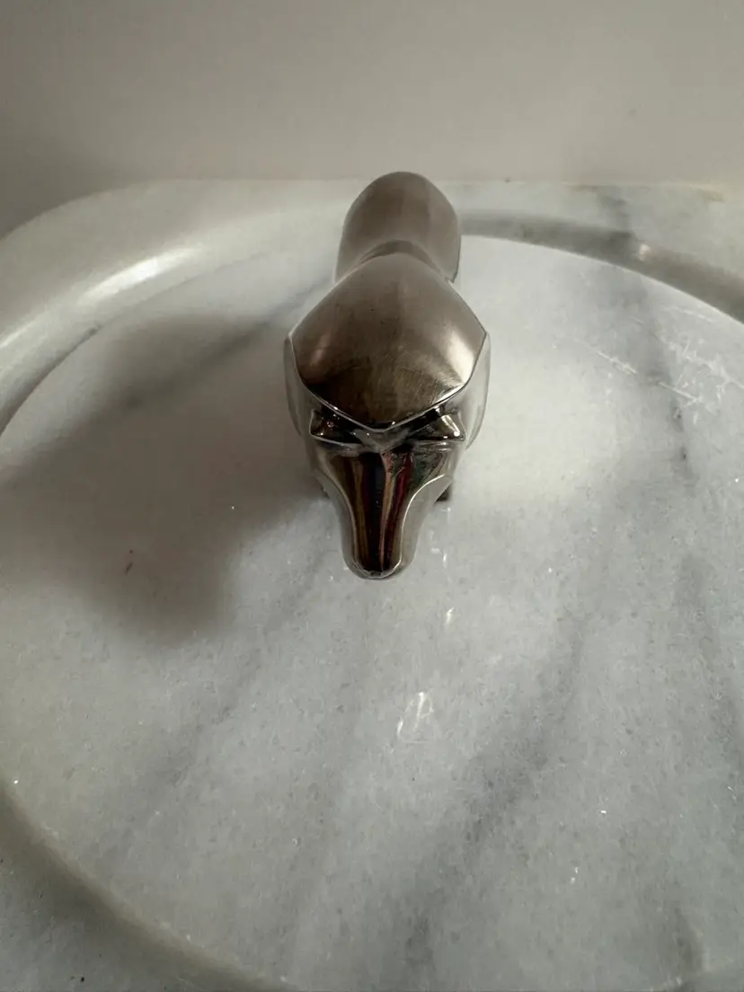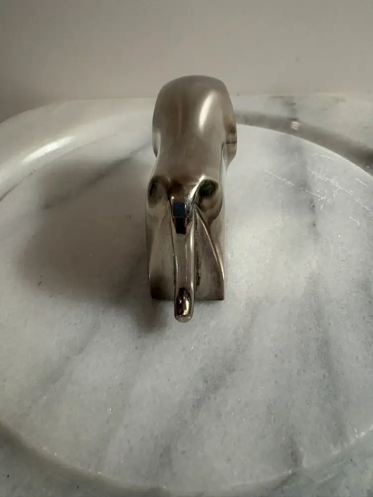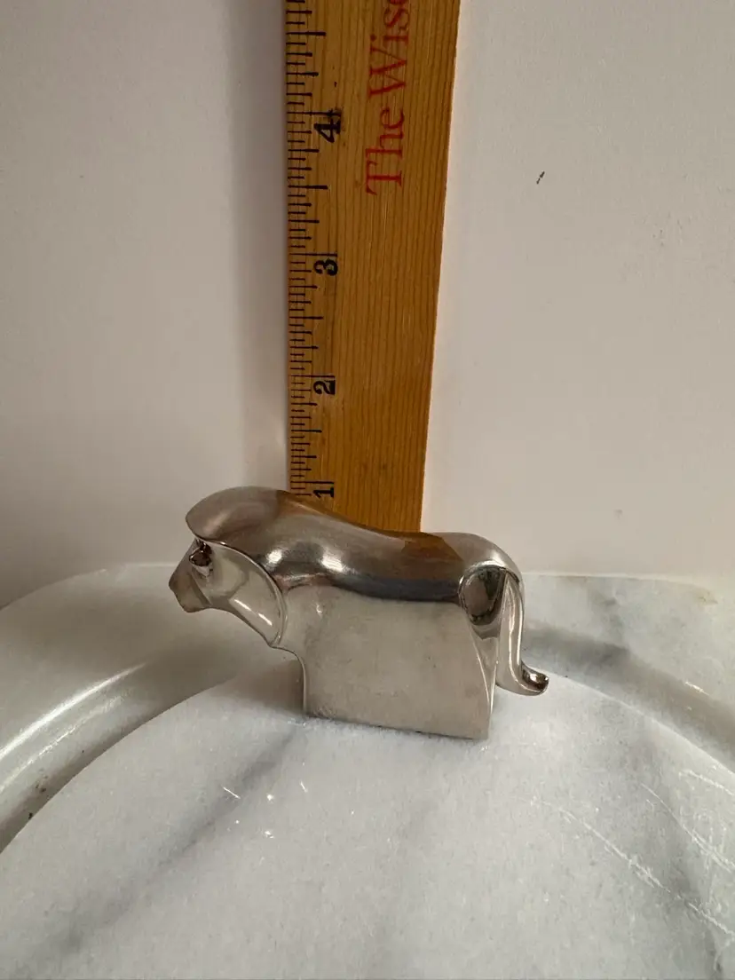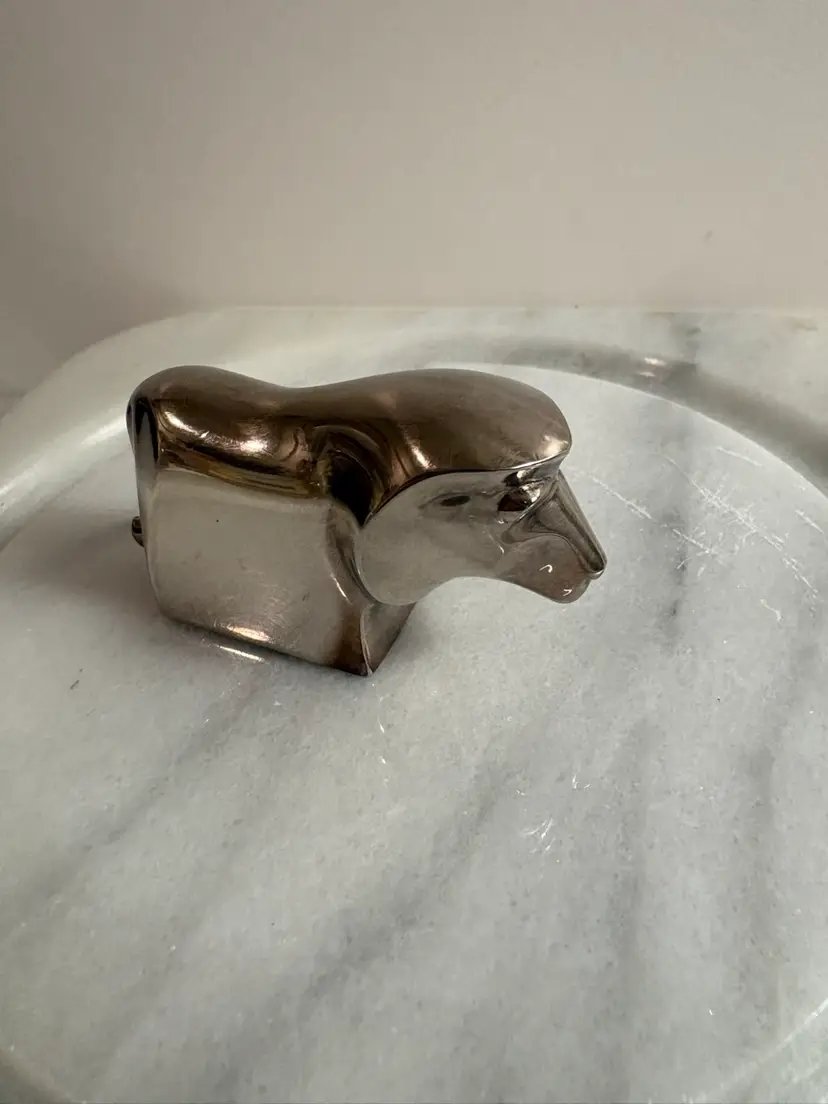 The product is a vintage 1970s DANSK Gunnar Cyren silver plated lion. This collectible decorative piece showcases a playful and unique design, making it a charming addition to any collection or as a statement piece in a home decor setting. The silver color adds a touch of elegance to the piece, making it a versatile and eye-catching item for collectors of vintage decor.