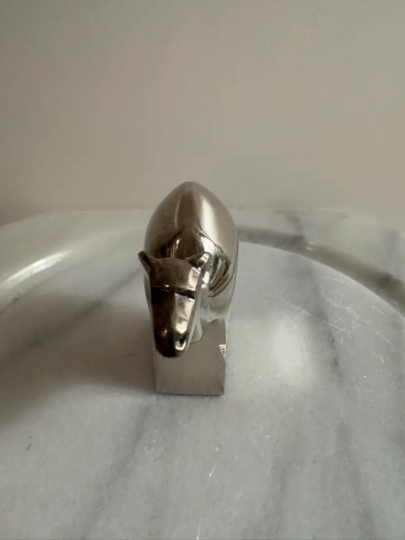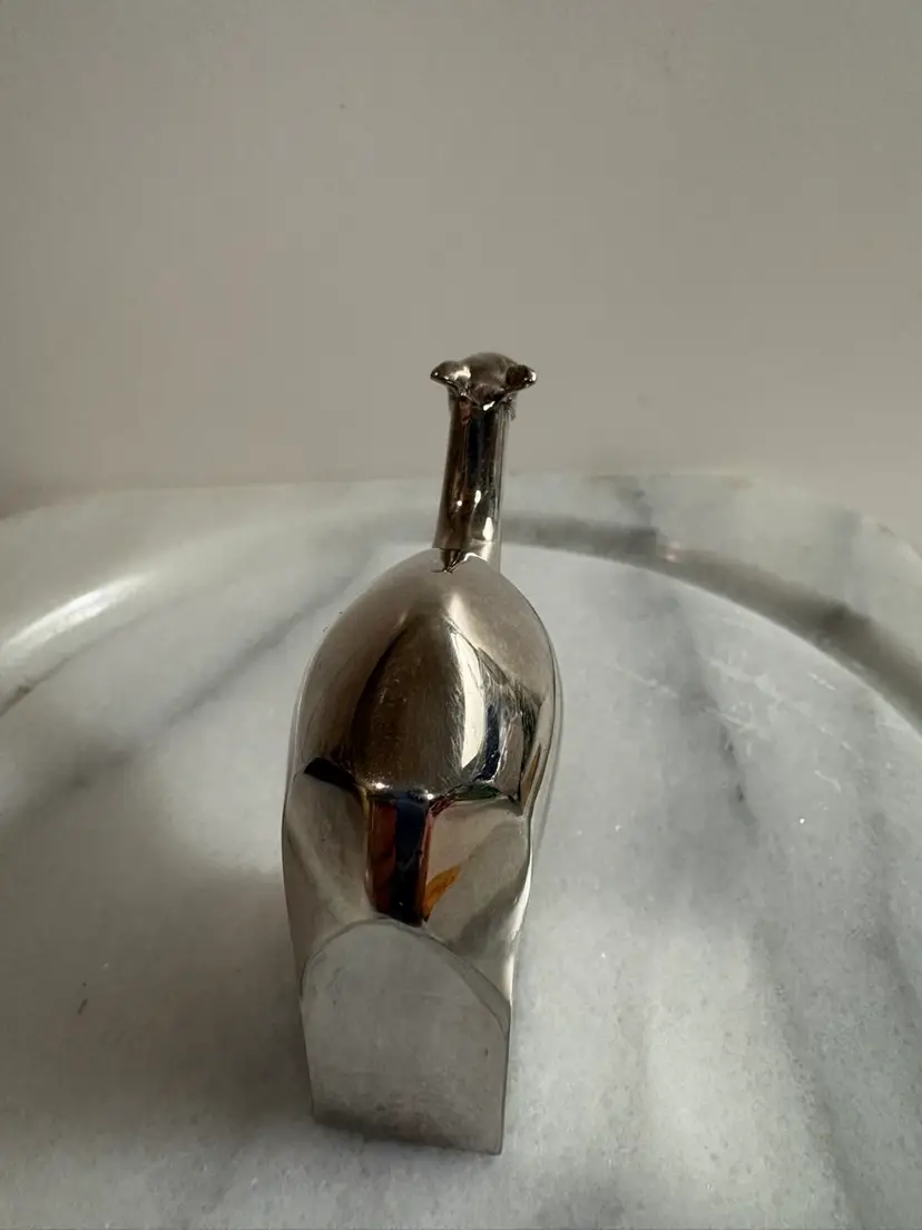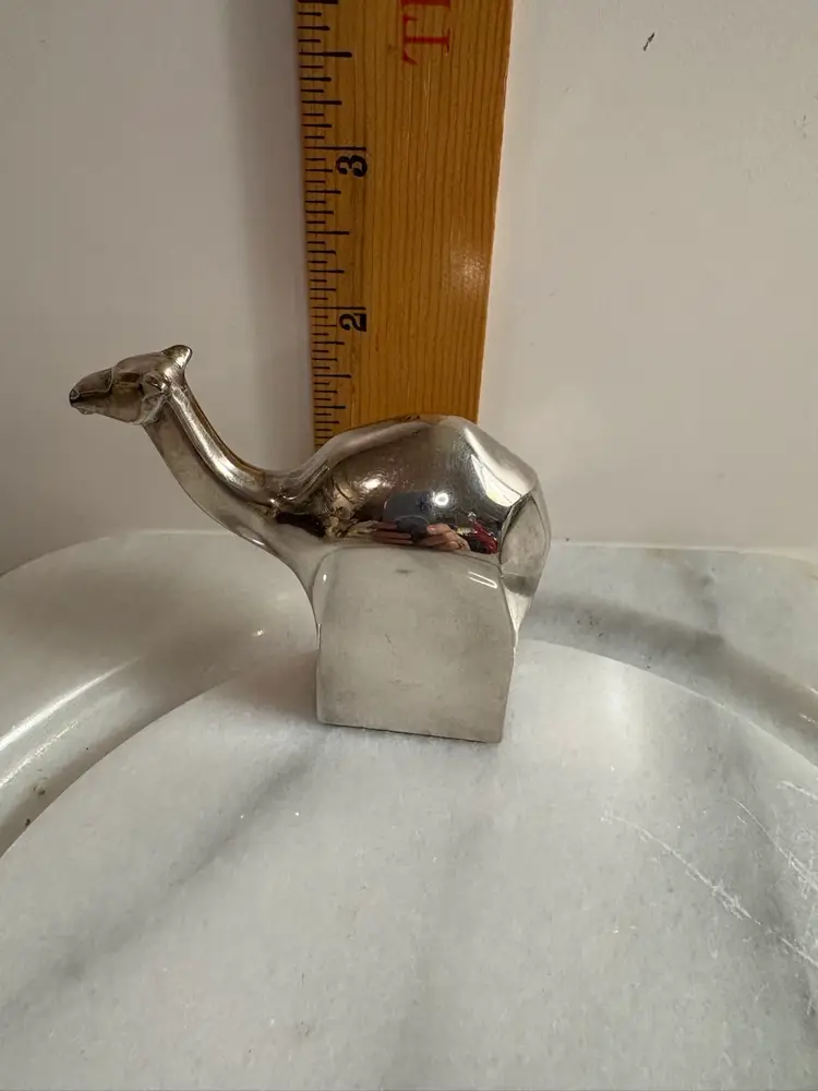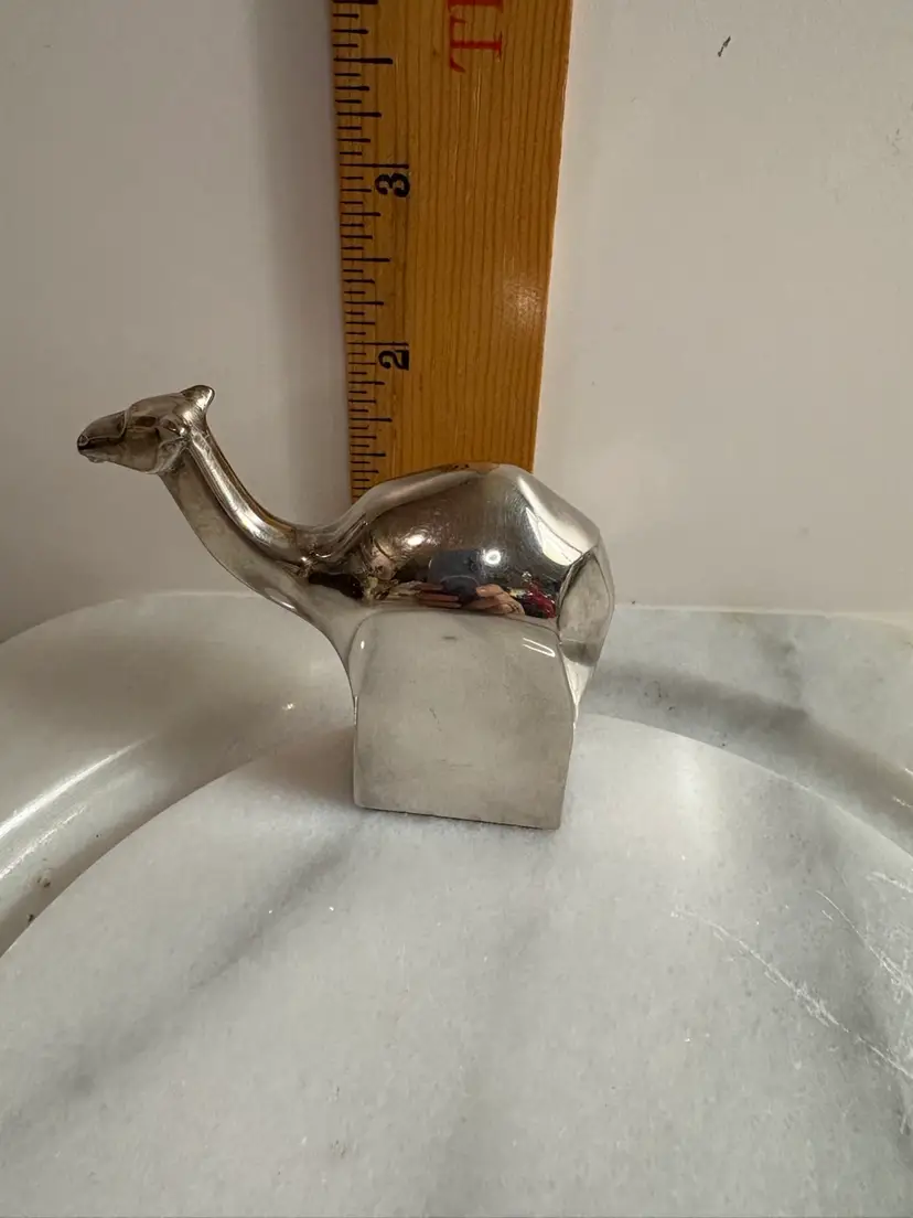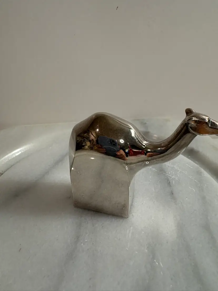 The product is a vintage 1970s DANSK Gunnar Cyren silver plated camel. This collectible decorative piece showcases a playful and unique design, making it a charming addition to any collection or as a statement piece in a home decor setting. The silver color adds a touch of elegance to the piece, making it a versatile and eye-catching item for collectors of vintage decor.