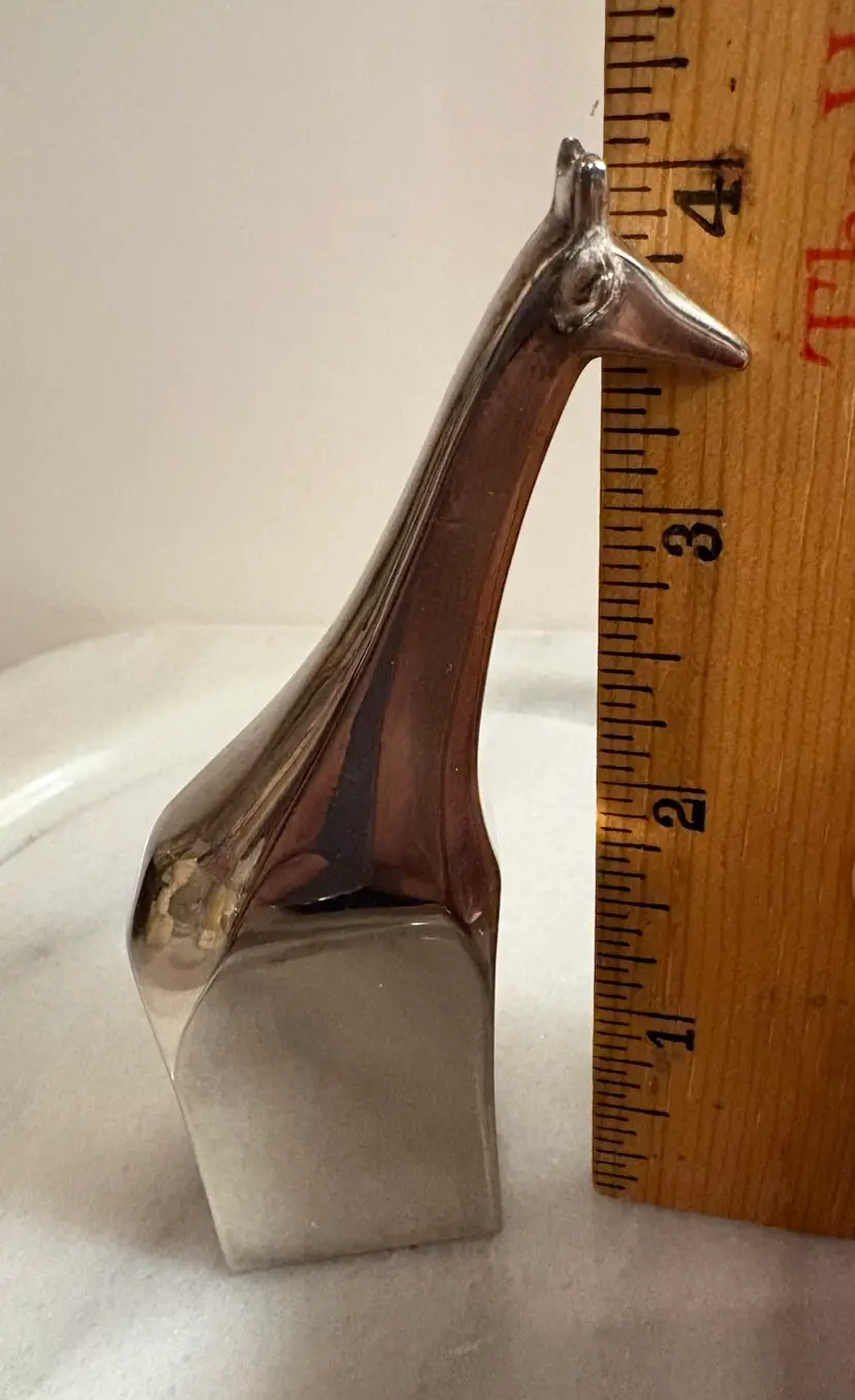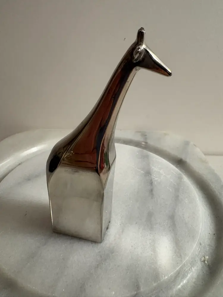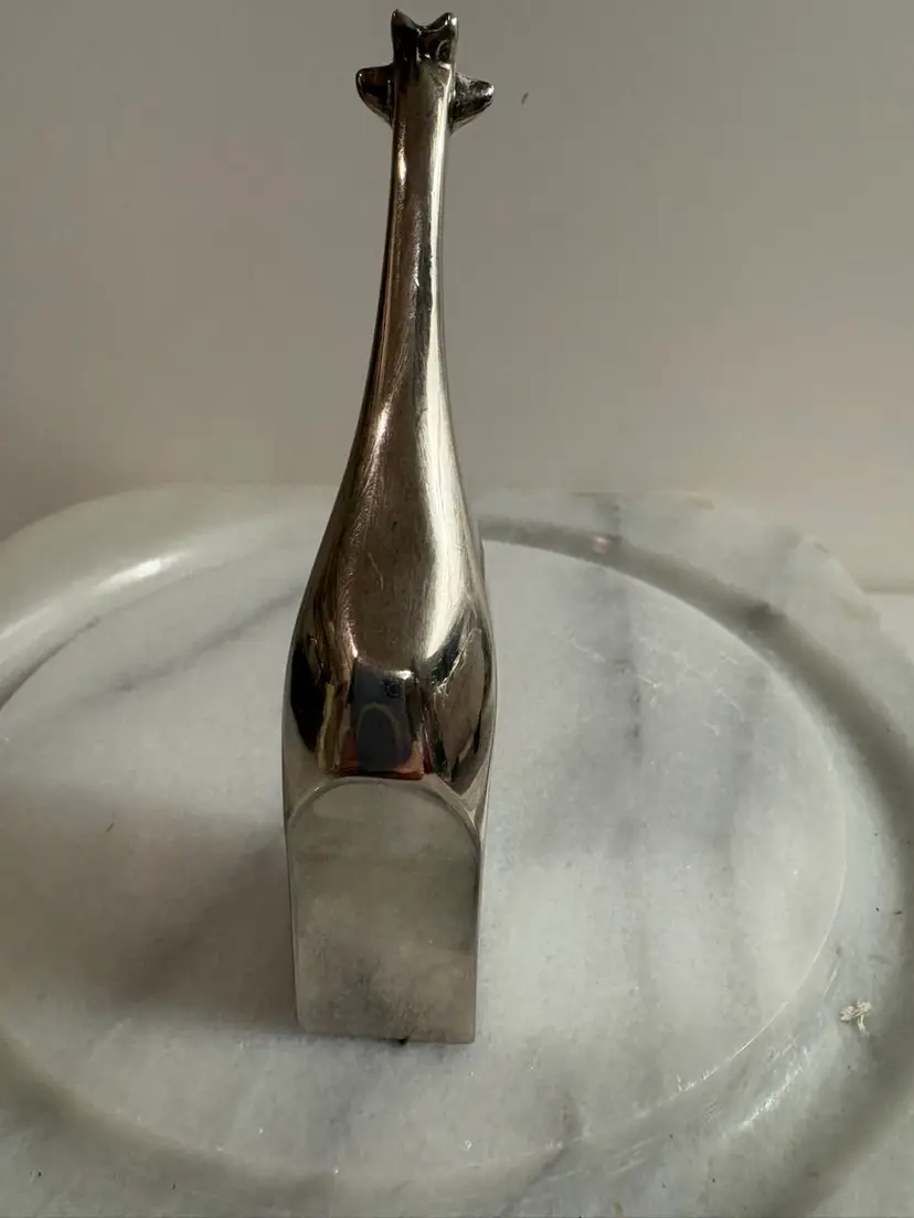 The product is a vintage 1970s DANSK Gunnar Cyren silver plated giraffe. This collectible decorative piece showcases a playful and unique design, making it a charming addition to any collection or as a statement piece in a home decor setting. The silver color adds a touch of elegance to the piece, making it a versatile and eye-catching item for collectors of vintage decor.