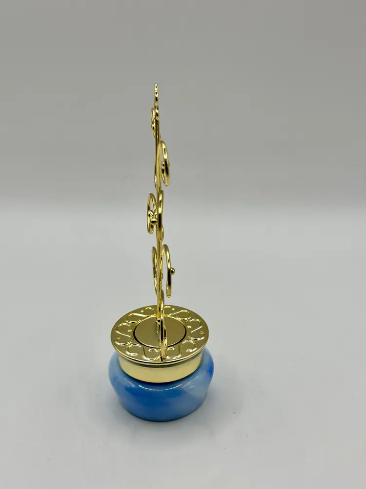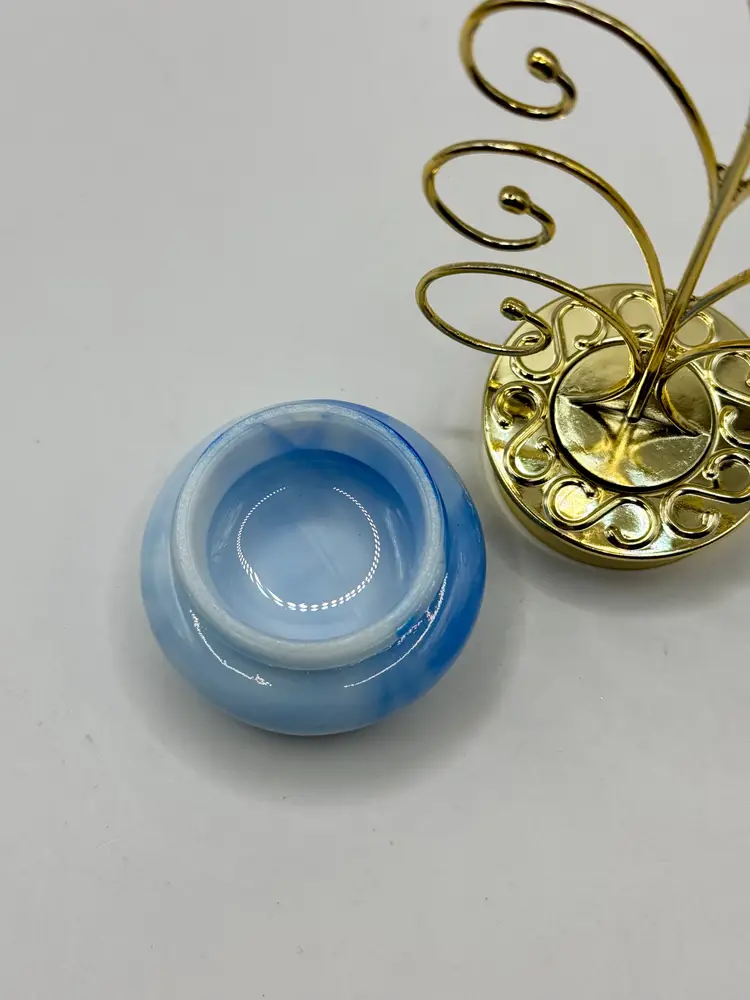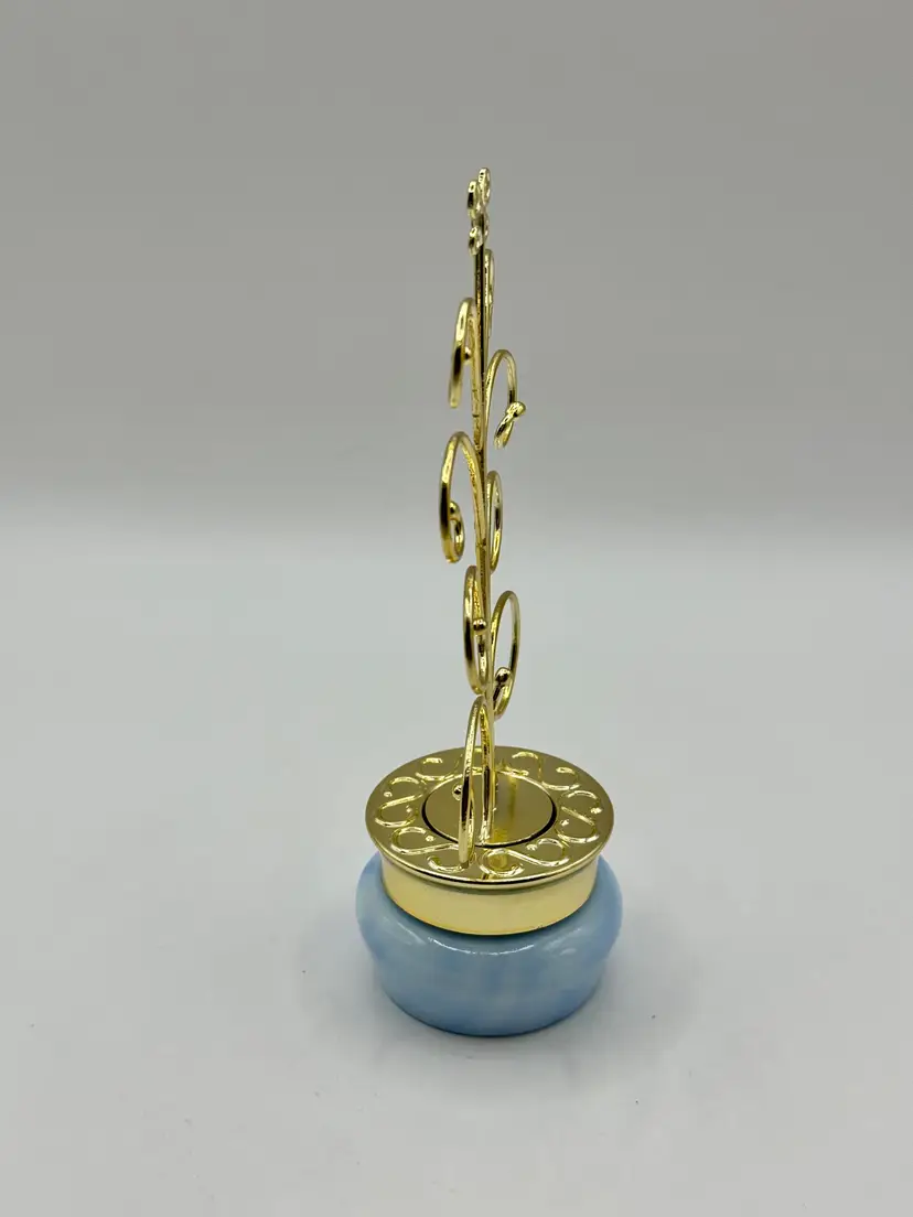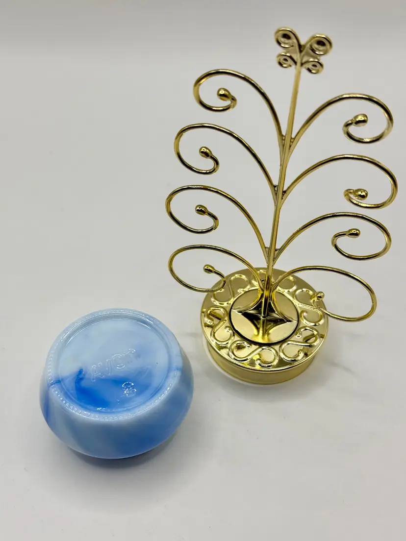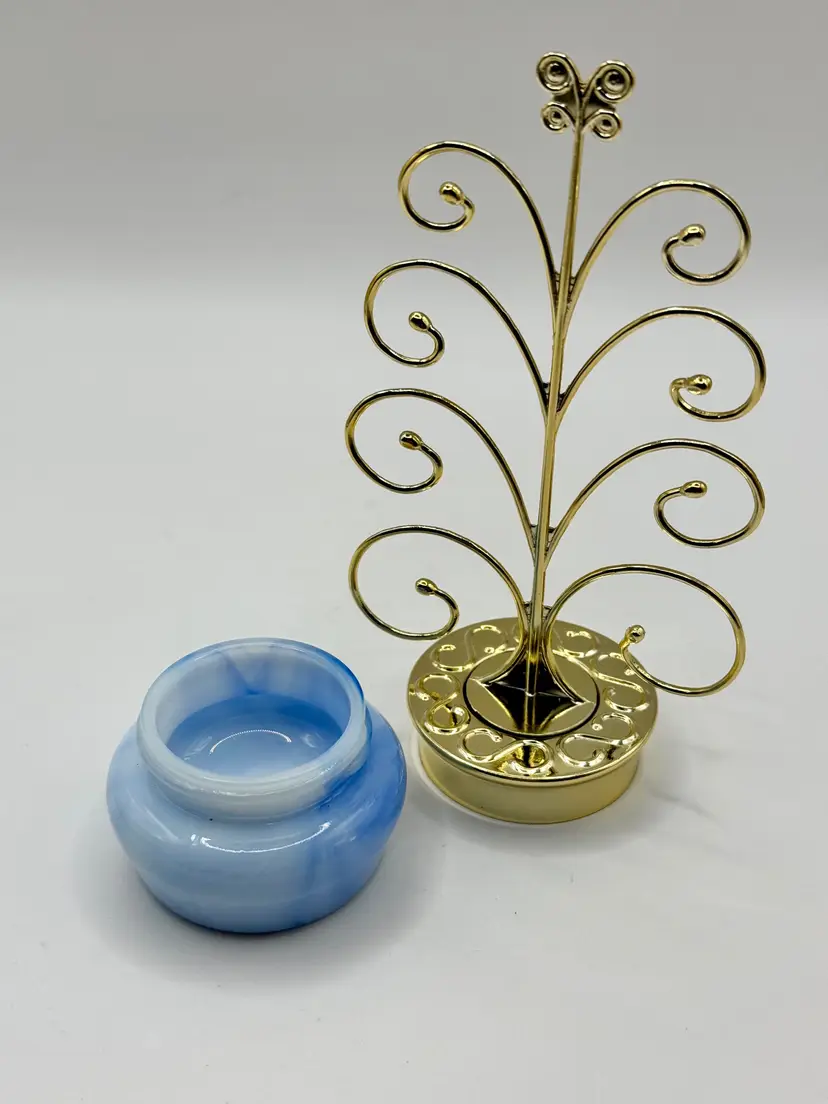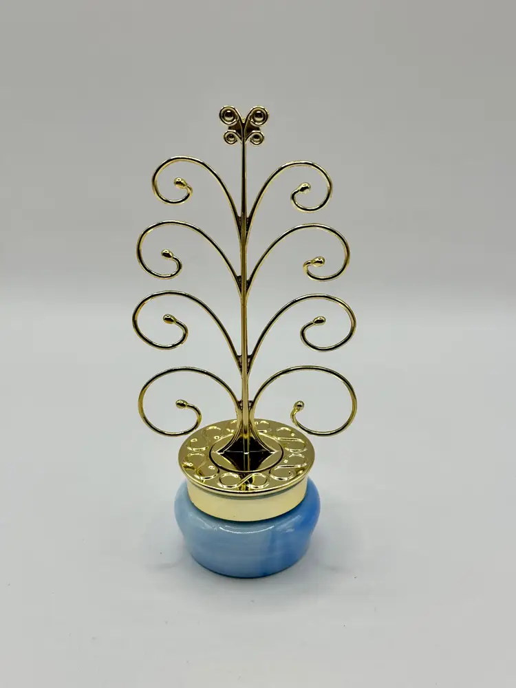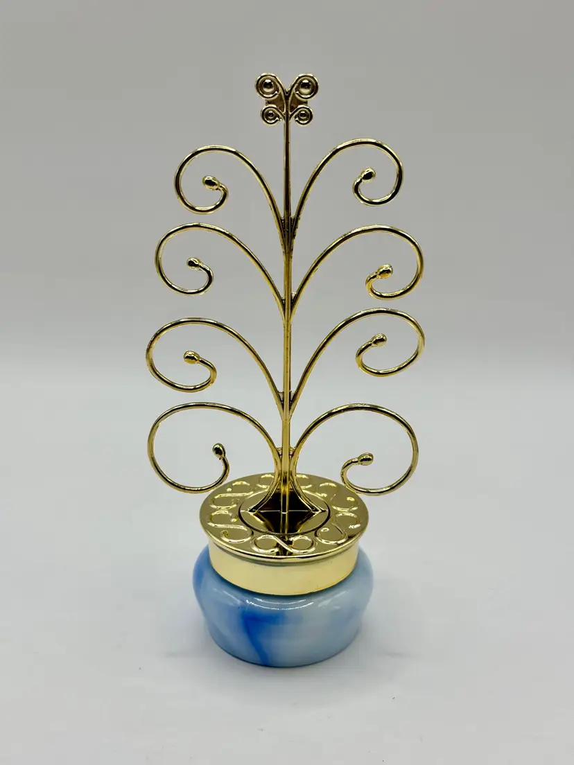 Graceful metal jewelry tree stand featuring a charming swirl design with a sturdy blue swirl ceramic base. Ideal for organizing and displaying your favorite necklaces, bracelets, and earrings. Adds a touch of elegance to your vanity or dresser. In great condition, ready to hold your cherished pieces. Measures 3x6.5x1.75. Weighs 8oz.