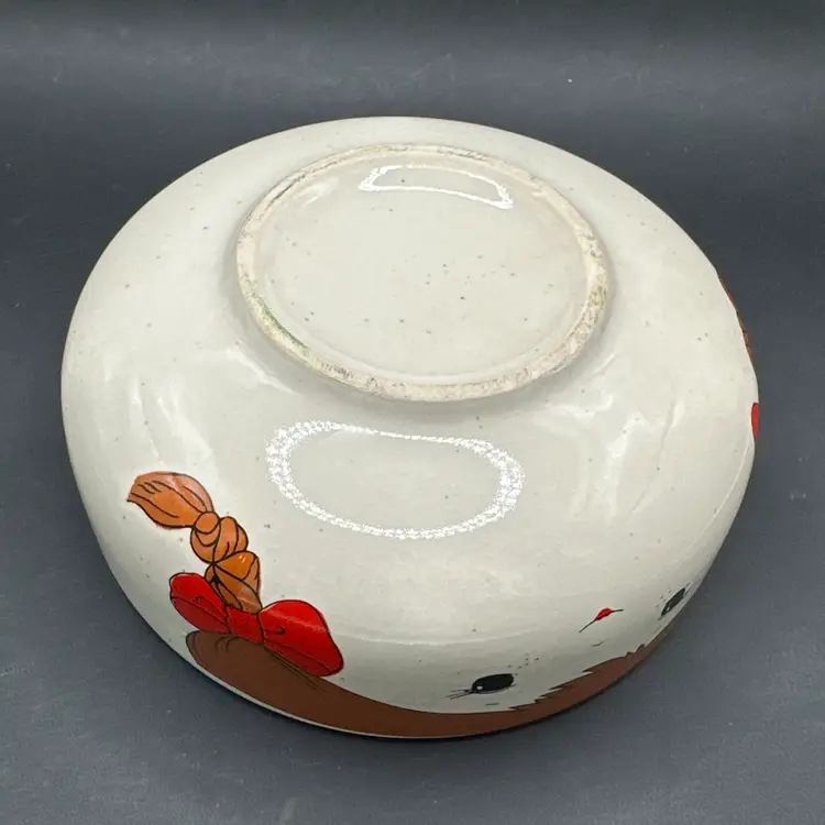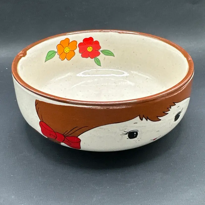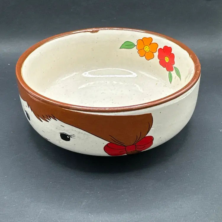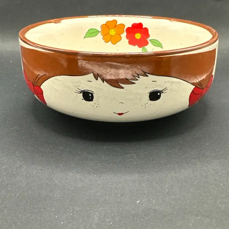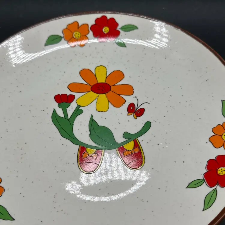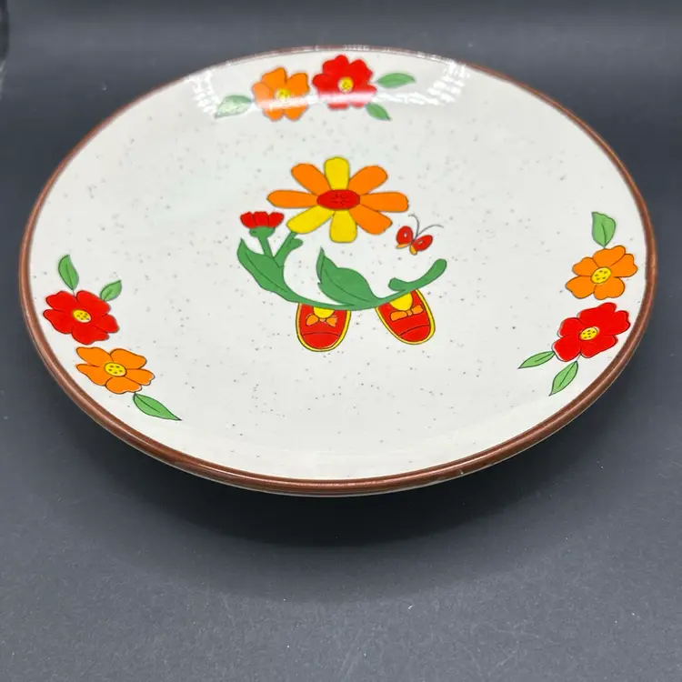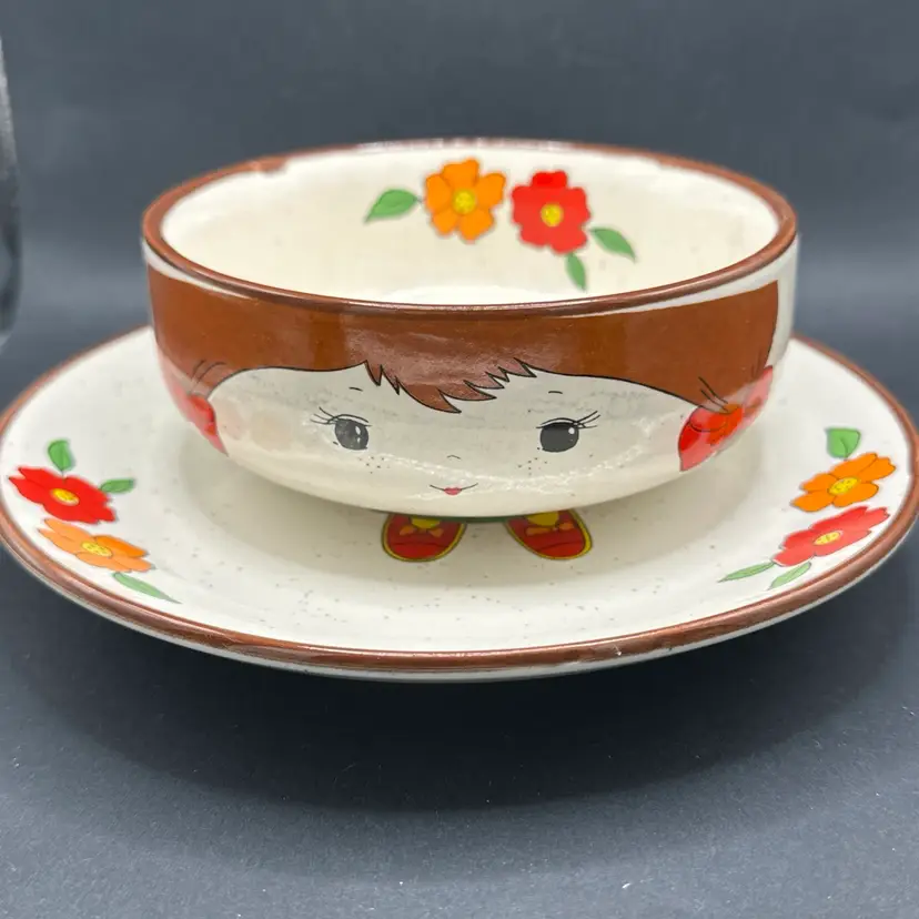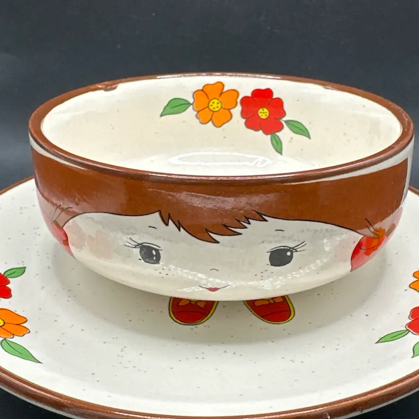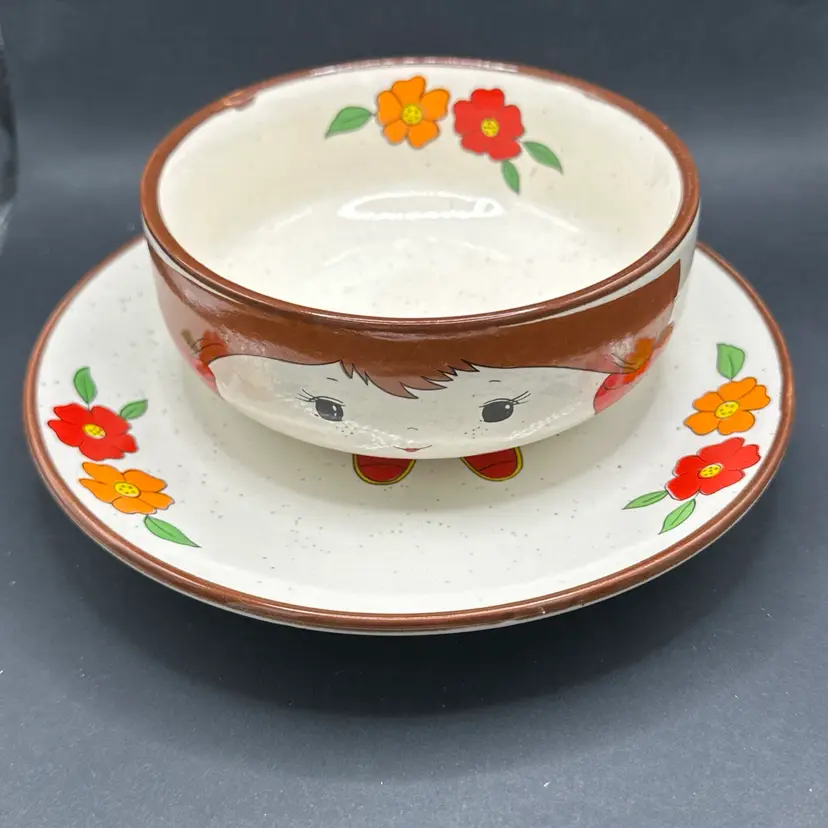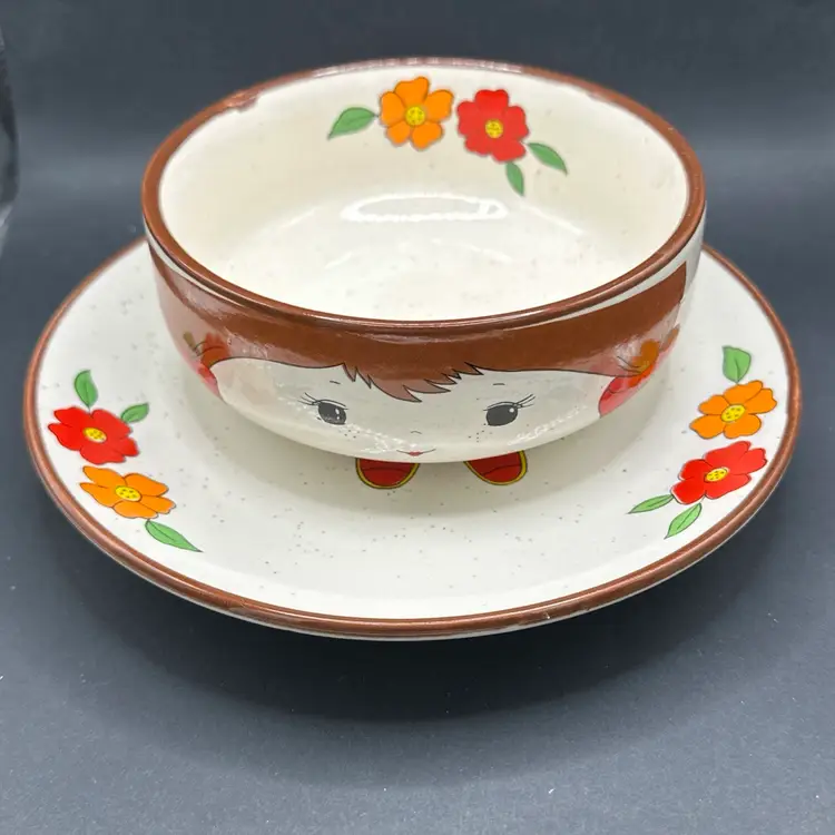 This vintage 1970's Fred Roberts Girl Cereal Soup Bowl and Plate set is a charming addition to any child's table setting. The round ceramic pieces feature a cheerful orange color with a floral pattern, typical of the late 20th-century era. The set includes a 5.5" bowl and 7.5" plate, both with a glossy finish. Made by an unmarked brand, these decorative pieces should be hand washed to maintain their vintage charm. This original set captures the nostalgia of the 1970s era and adds a touch of retro style to mealtime.