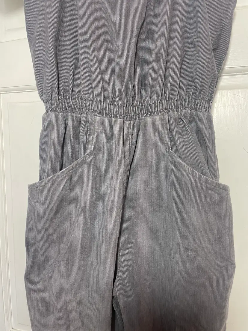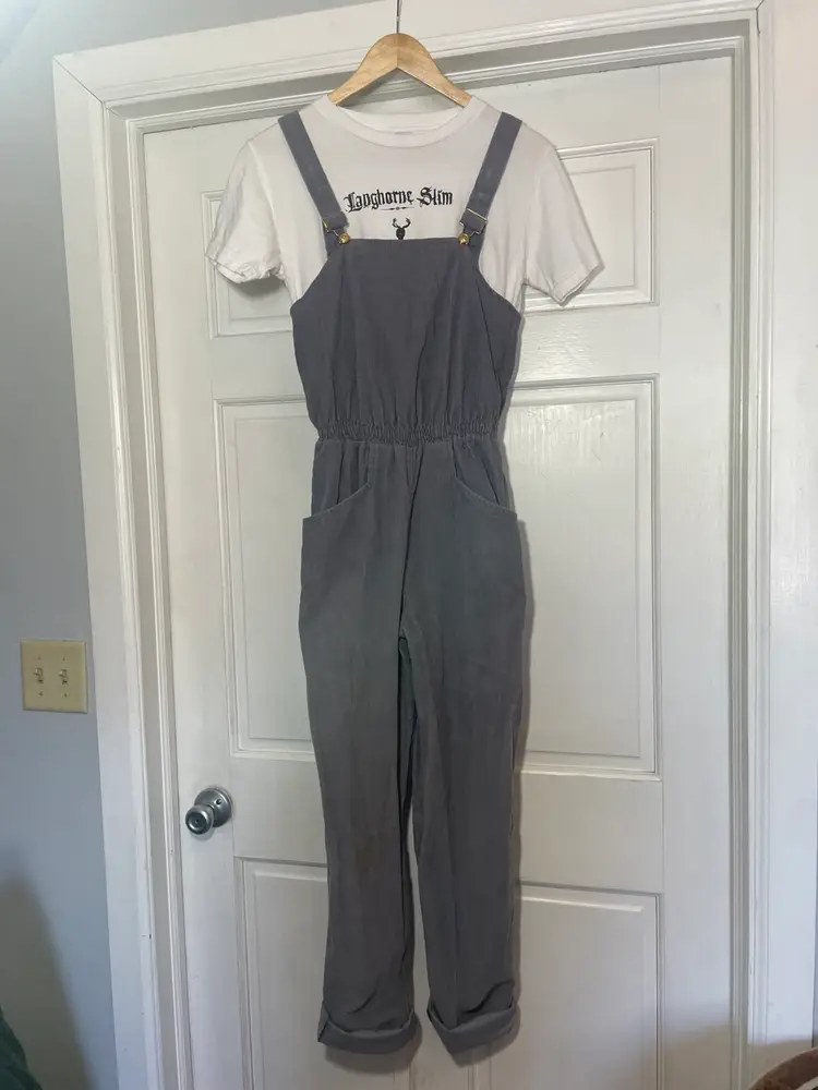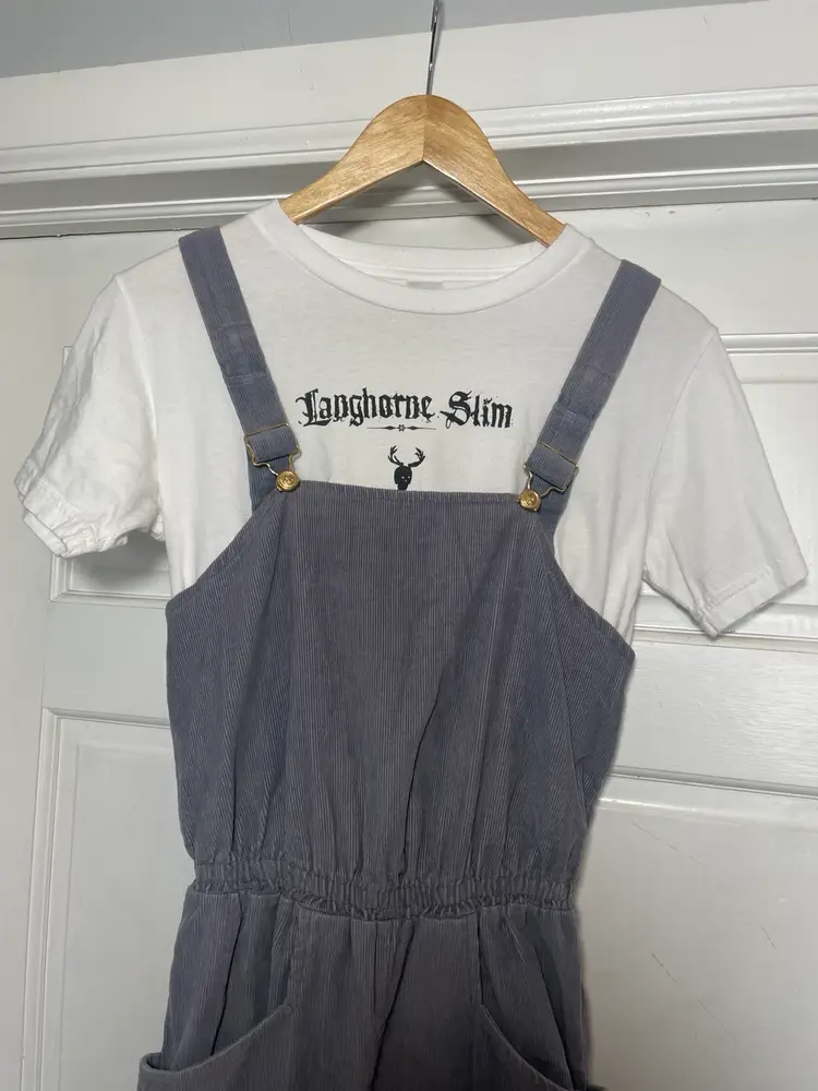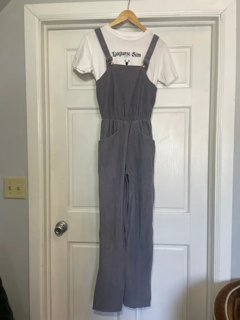 Vintage periwinkle blue corduroy w/ cinched waist, two overall strap clasps for fastening at top. (White tee NOT included. For staging purposes only!)