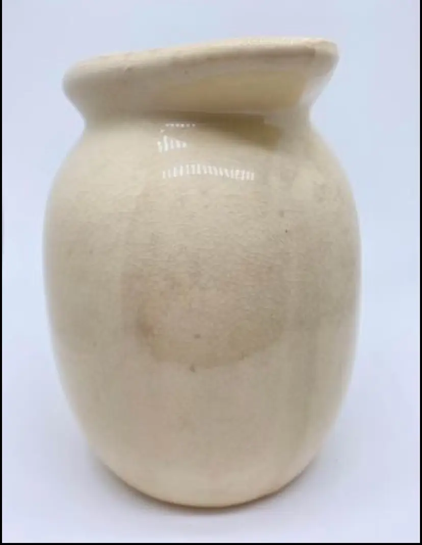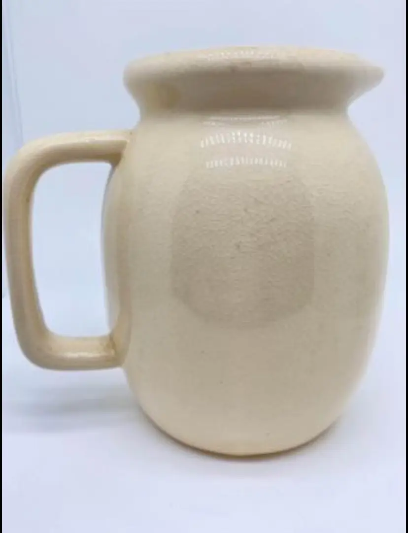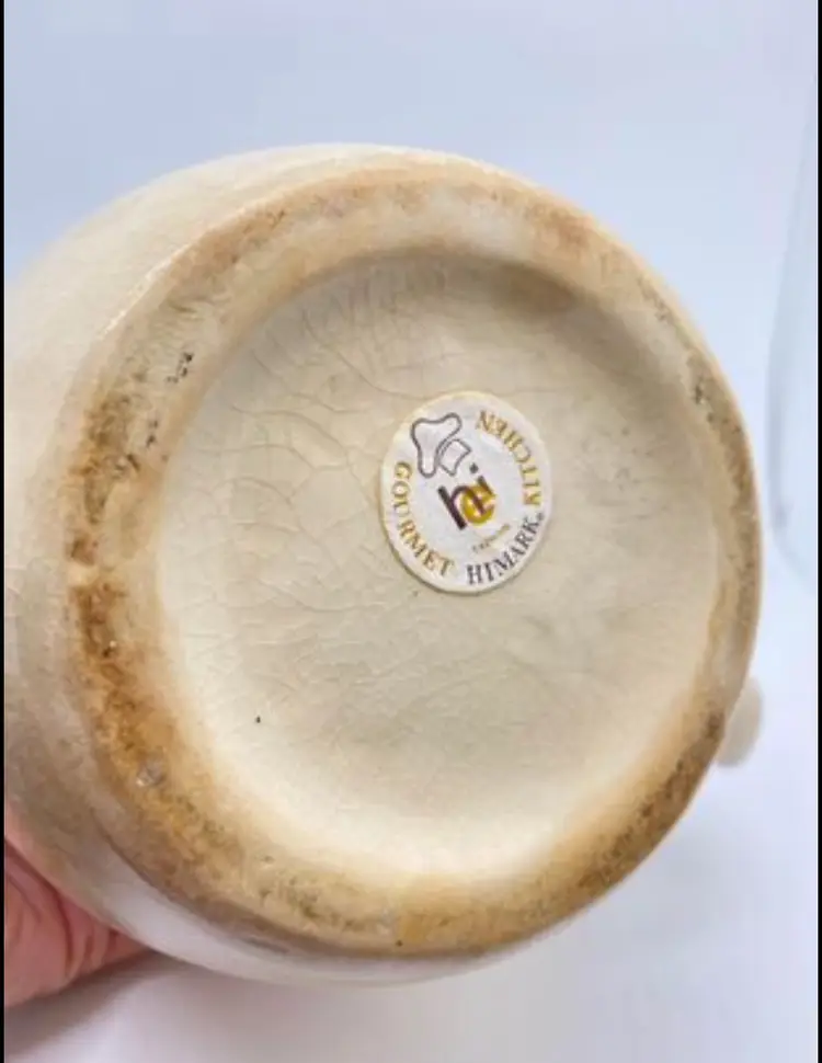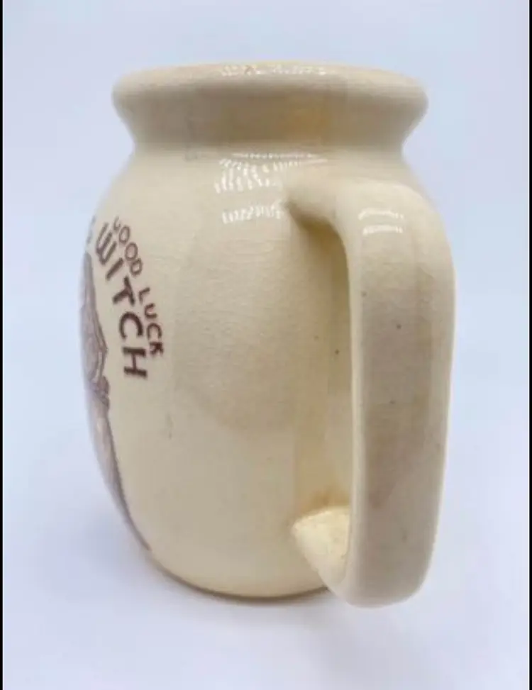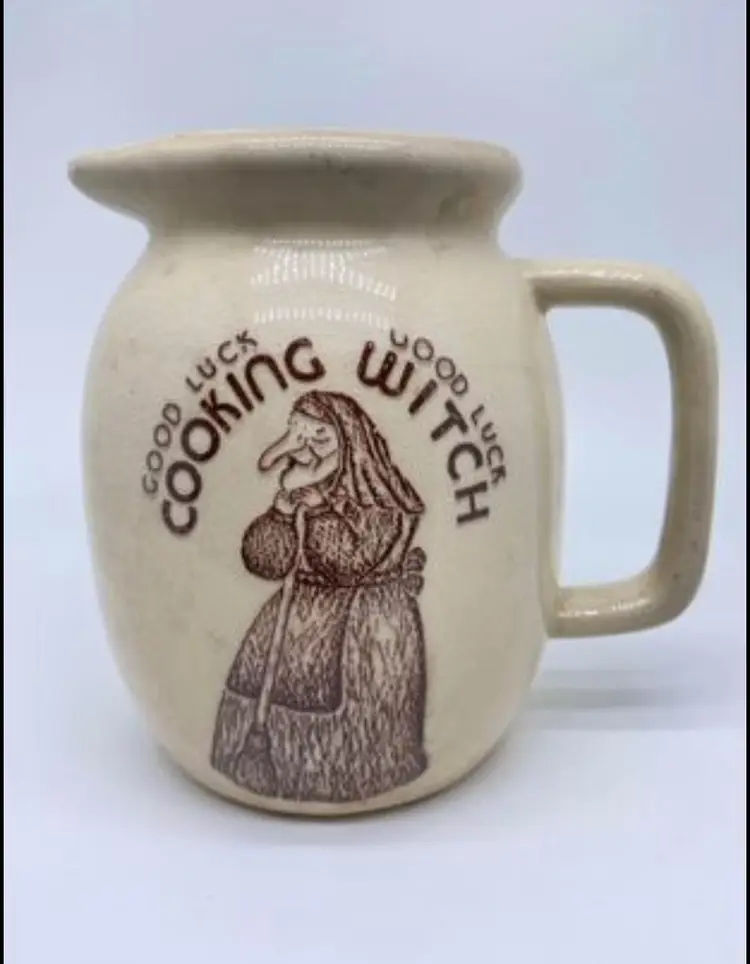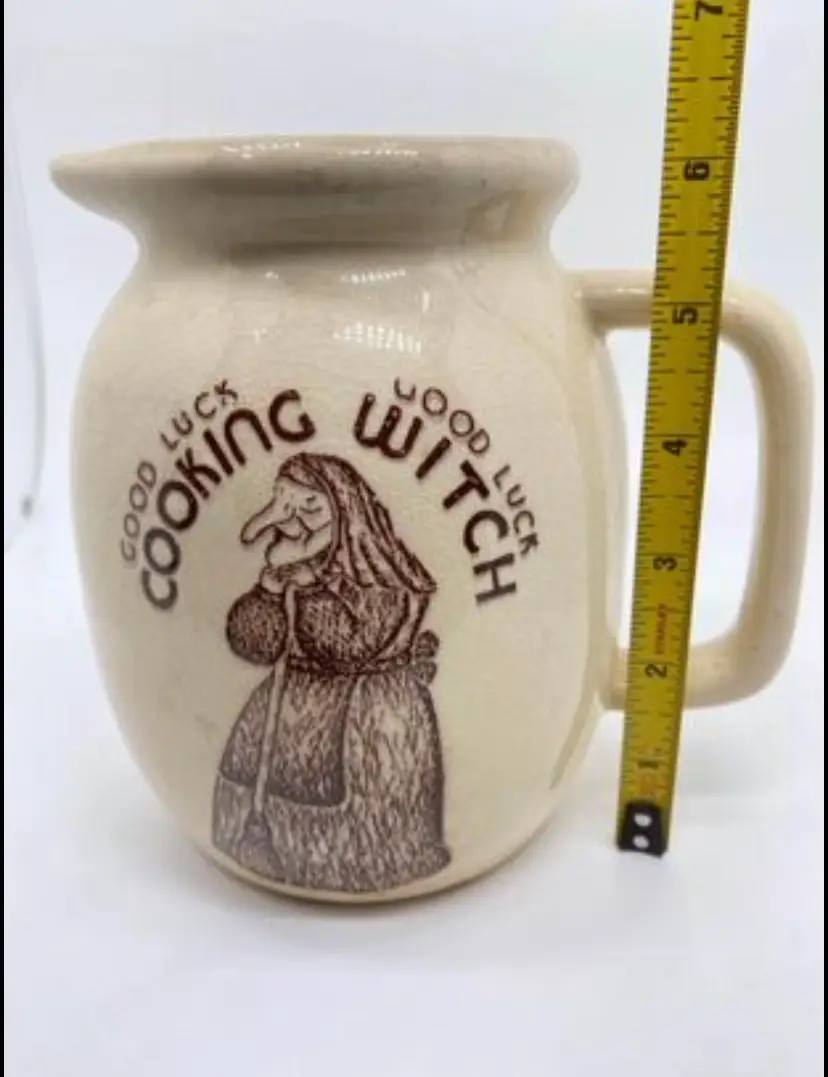 1970s Vintage Good Luck Kitchen Witch Pitcher-Himark- Taiwan. Ceramic crock- Scandinavian rustic kitchen decor. Has some crazing and discoloration due to age. Original sticker on bottom. Small chip near edge. See all photos.