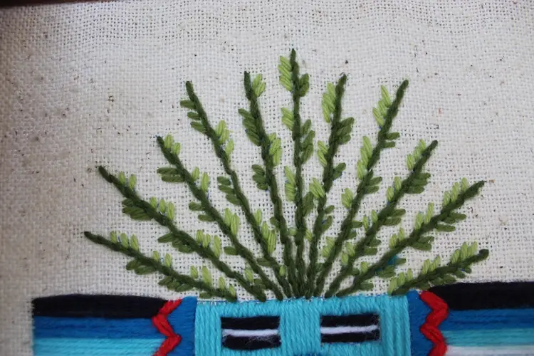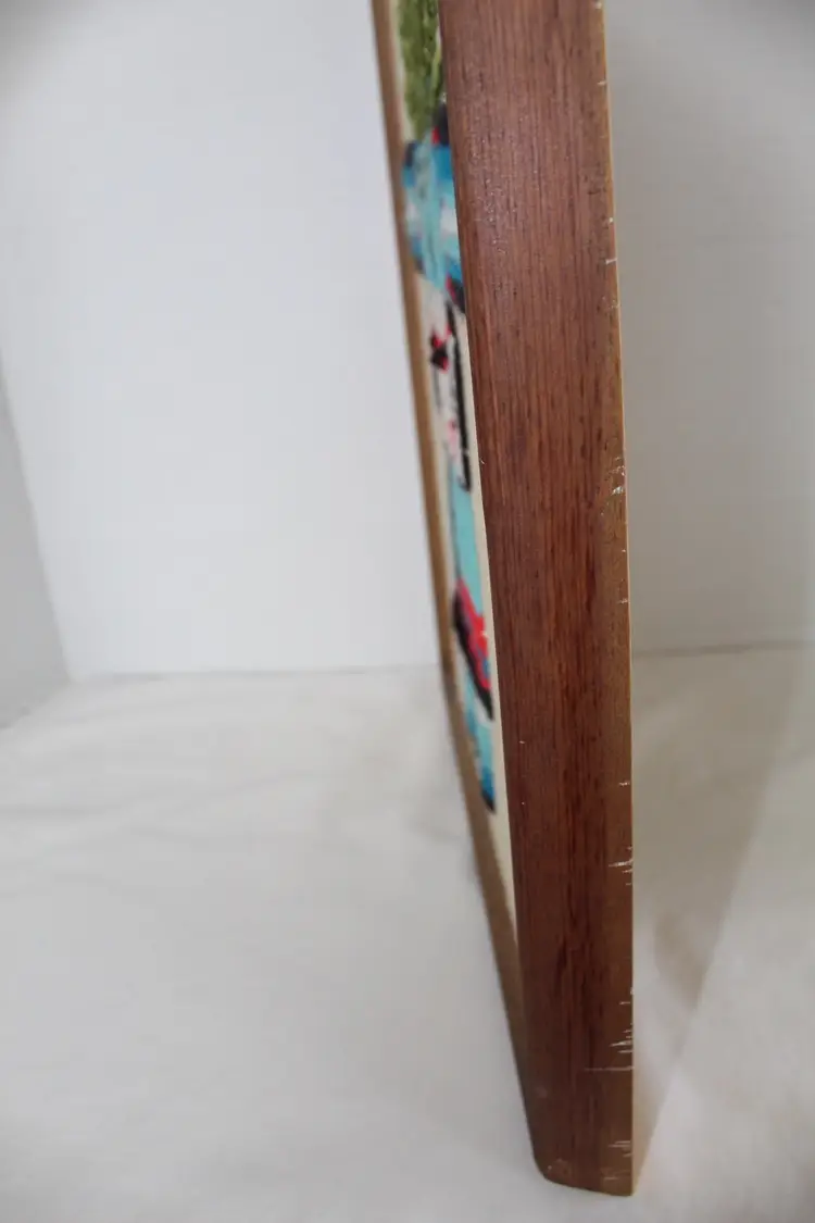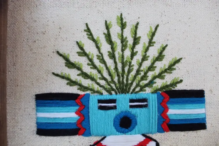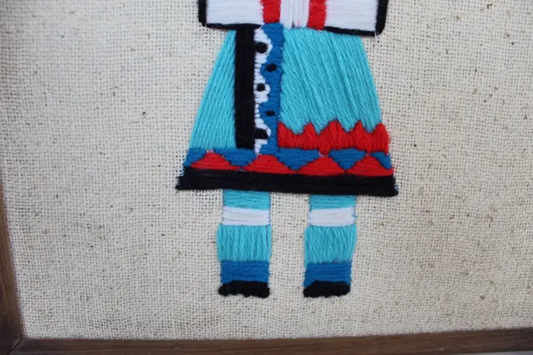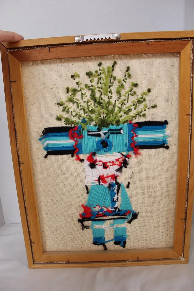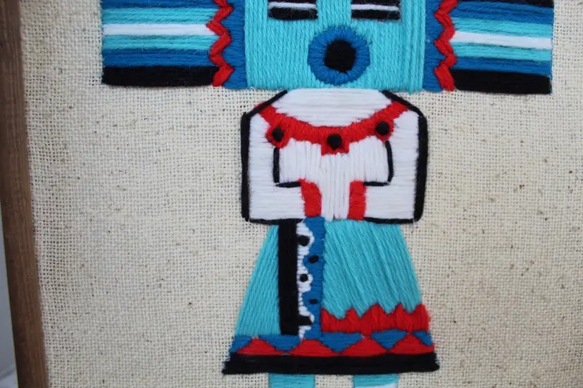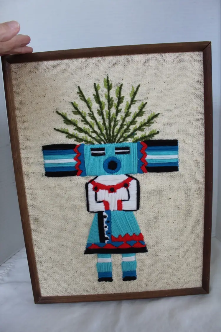 This vintage Native American Kachina Crewel and embroidery yarn art is a unique and handmade framed needlepoint piece measuring 15x11.5 inches. This is a piece of vintage handmade crewel embroidery wall art featuring a Native American Kachina figure. The figure represents a Kachina (or Katsina), a spirit being in Pueblo cultures. Kachinas are believed to act as intermediaries between humans and gods, often associated with natural blessings like rain and fertile crops. The artwork uses embroidery techniques to depict the figure's regalia and colors, which help to identify the specific spirit. The style is often described as having a mid-century modern or psychedelic feel due to its vibrant colors and bold design. The intricate embroidery showcases a traditional Native American design, making it a beautiful and authentic piece of art. The piece is original, with no reproduction, and is sure to add a touch of cultural significance and artistry to any room or collection.