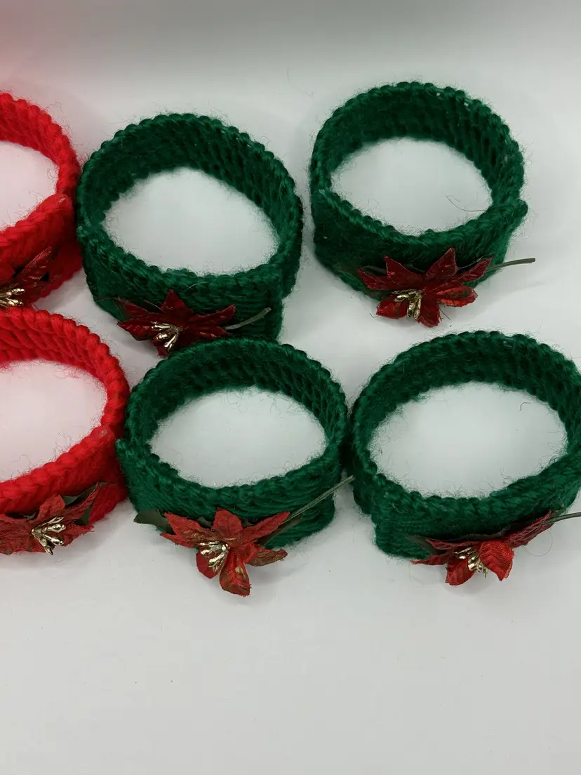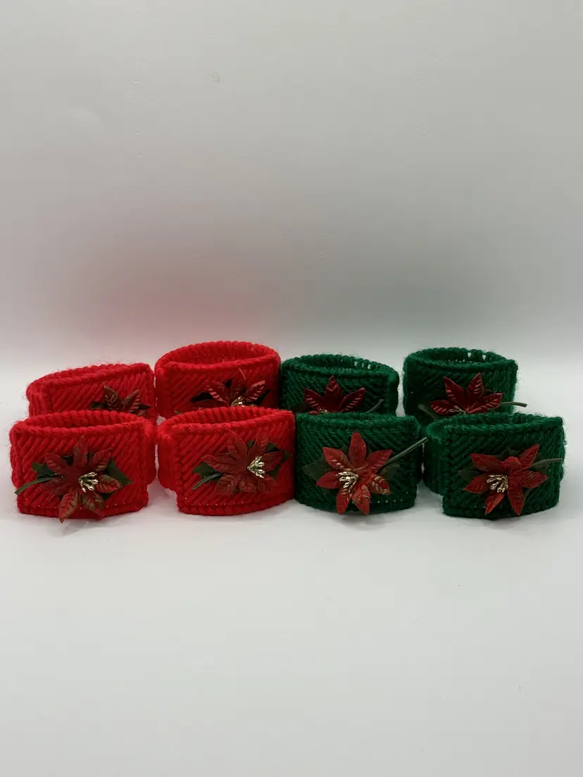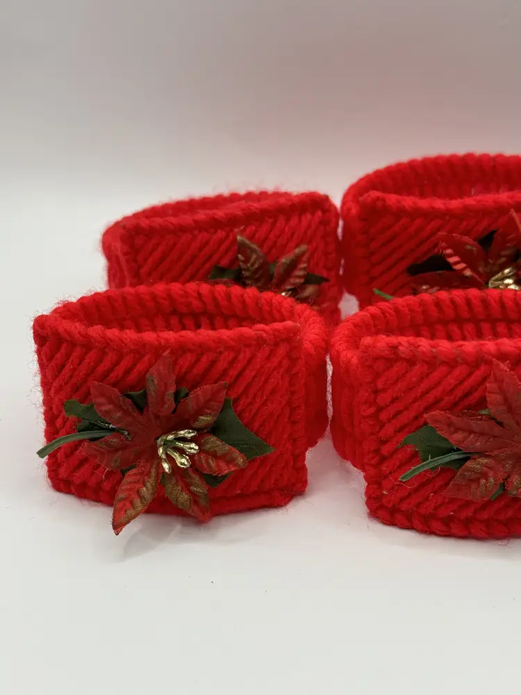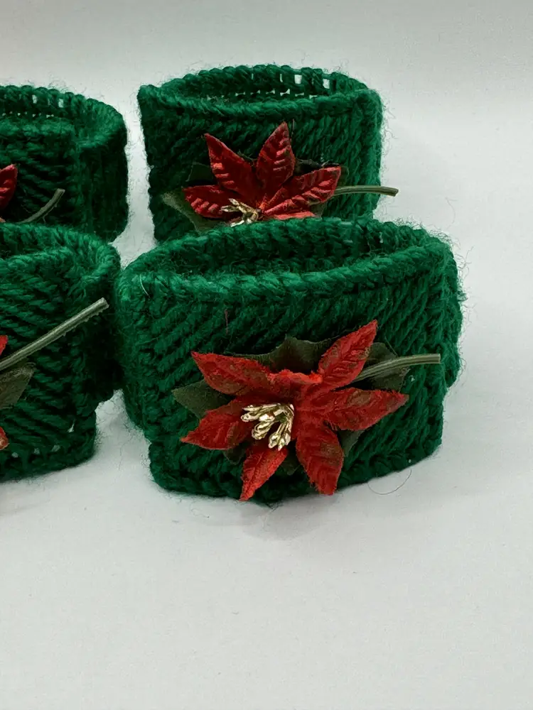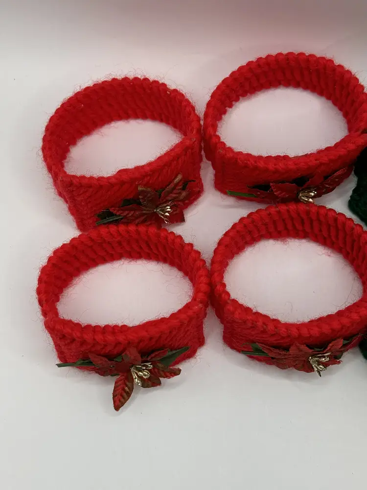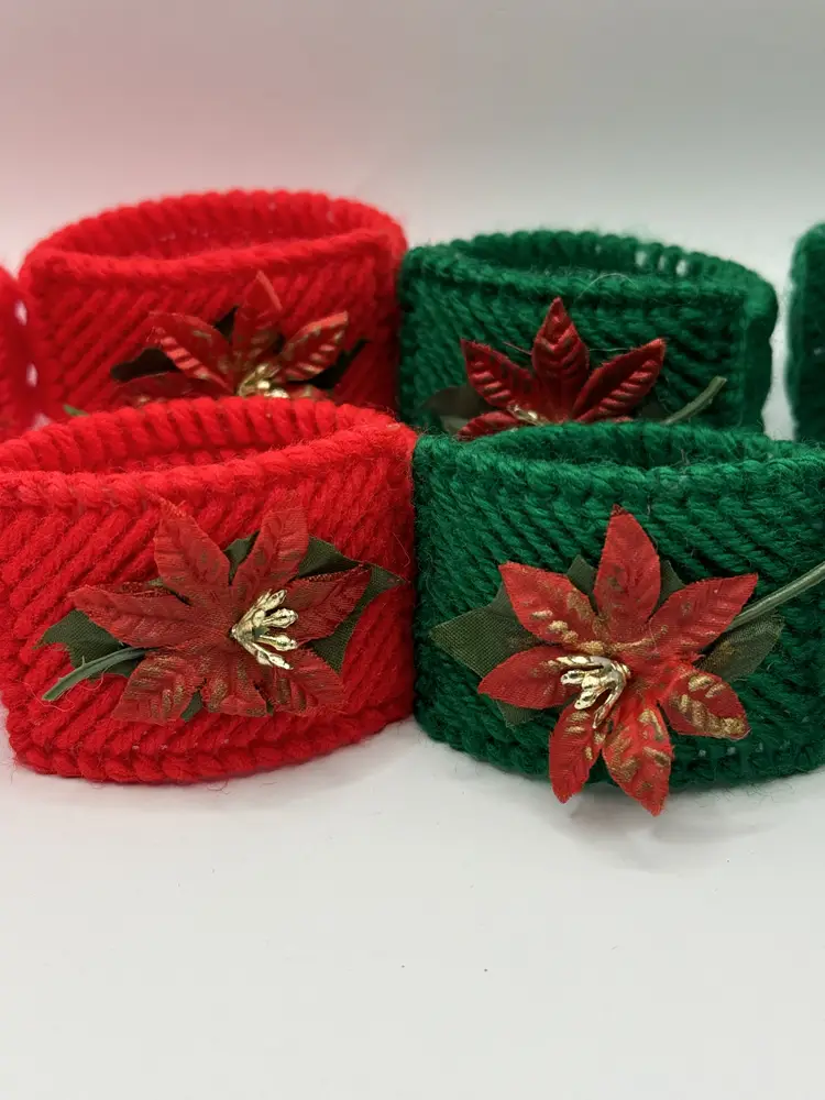 Add a festive touch to your holiday table with this set of vintage homemade crochet Christmas poinsettia napkin rings. Featuring vibrant red and green colors with charming poinsettia accents, these napkin rings are perfect for your Christmas gatherings. Each ring is crafted with care, bringing a nostalgic feel to your holiday decor. Excellent condition, ready to enhance your festive celebrations. Measures 2.5x1.5 inches. Weighs 6oz.