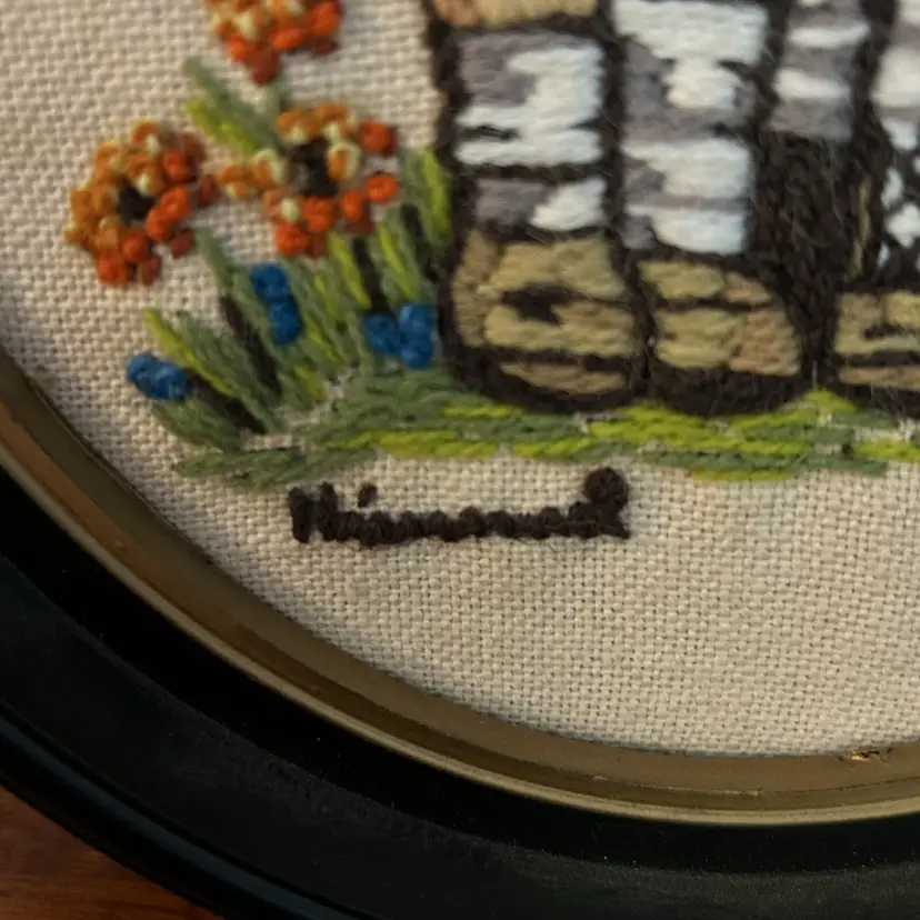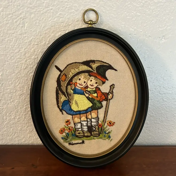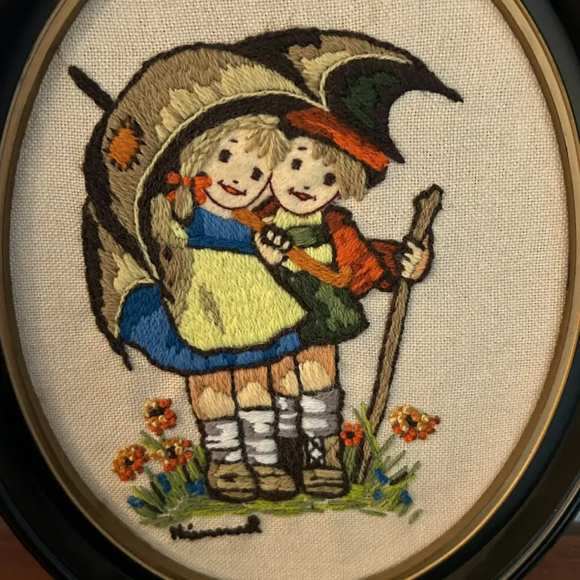 Vintage 1970s Hummel Crewel Handmade Boy And Girl Under Umbrella Framed