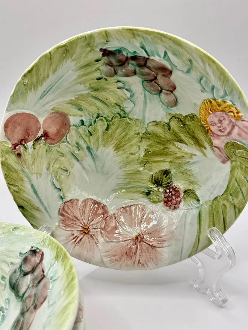 Elevate your dining experience with this set of 4 vintage majolica angelic botanical bowls, featuring a delicate pastel floral embossed design. Each bowl showcases a unique blend of soft-hued flowers and leaves, adding a touch of nature's serenity to your meals. Ideal for collectors or as a charming addition to any kitchen. In excellent condition with no chips or cracks. Measures 6.5”. Weighs 3lb.