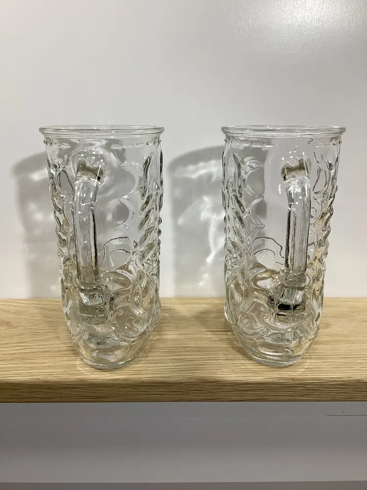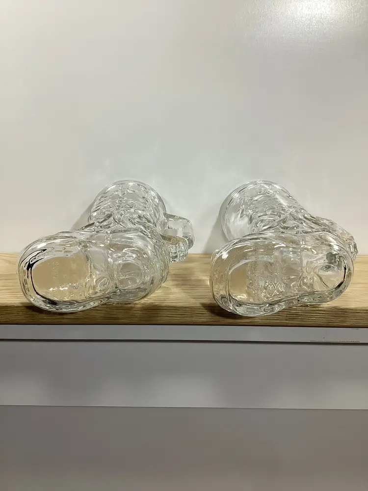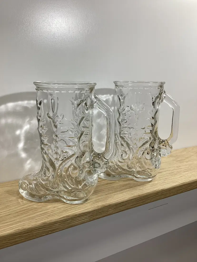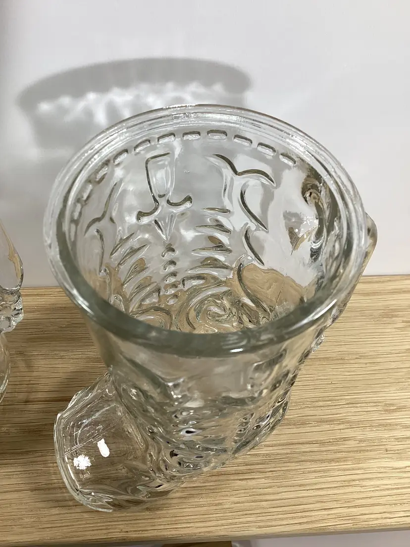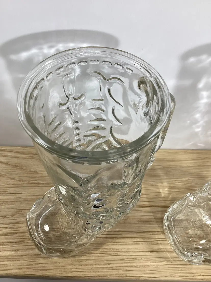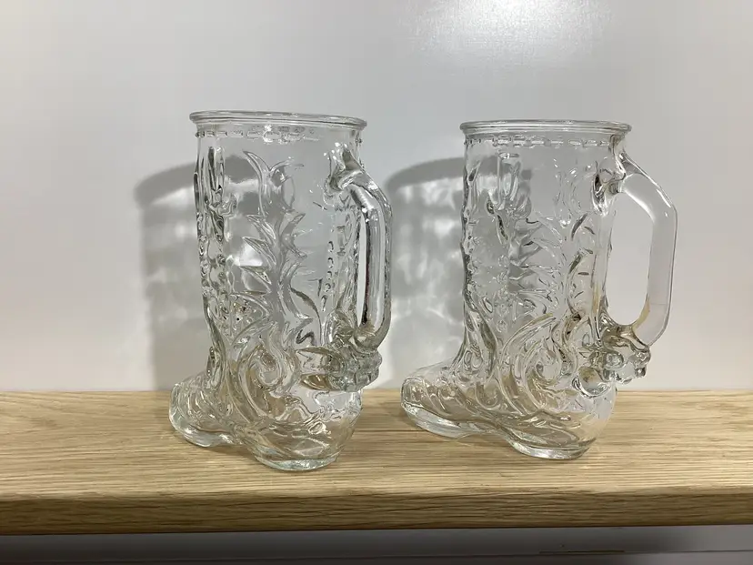 Two glass cowboy boot mugs. I believe they are Libbey Glass mugs. Both mugs are identical and both read “Canada” on the bottom. Approx. 6.5” tall and 3” diameter at the top. Excellent vintage condition with no chips, cracks, or scratches. These two mugs have been cleaned and inspected. Great western themed embossed designs around the mugs. Please review all of the pictures. Shipping via USPS. Thanks.