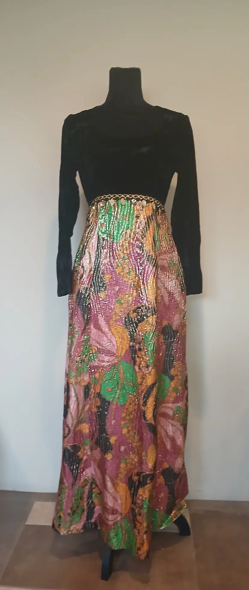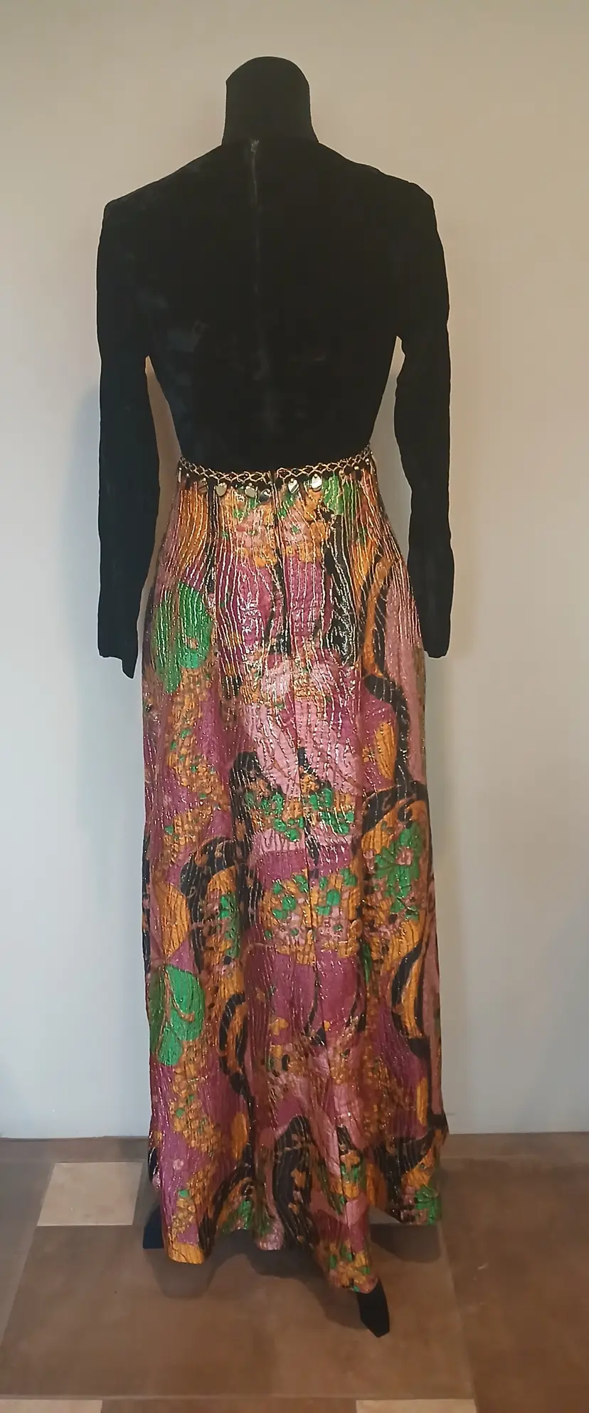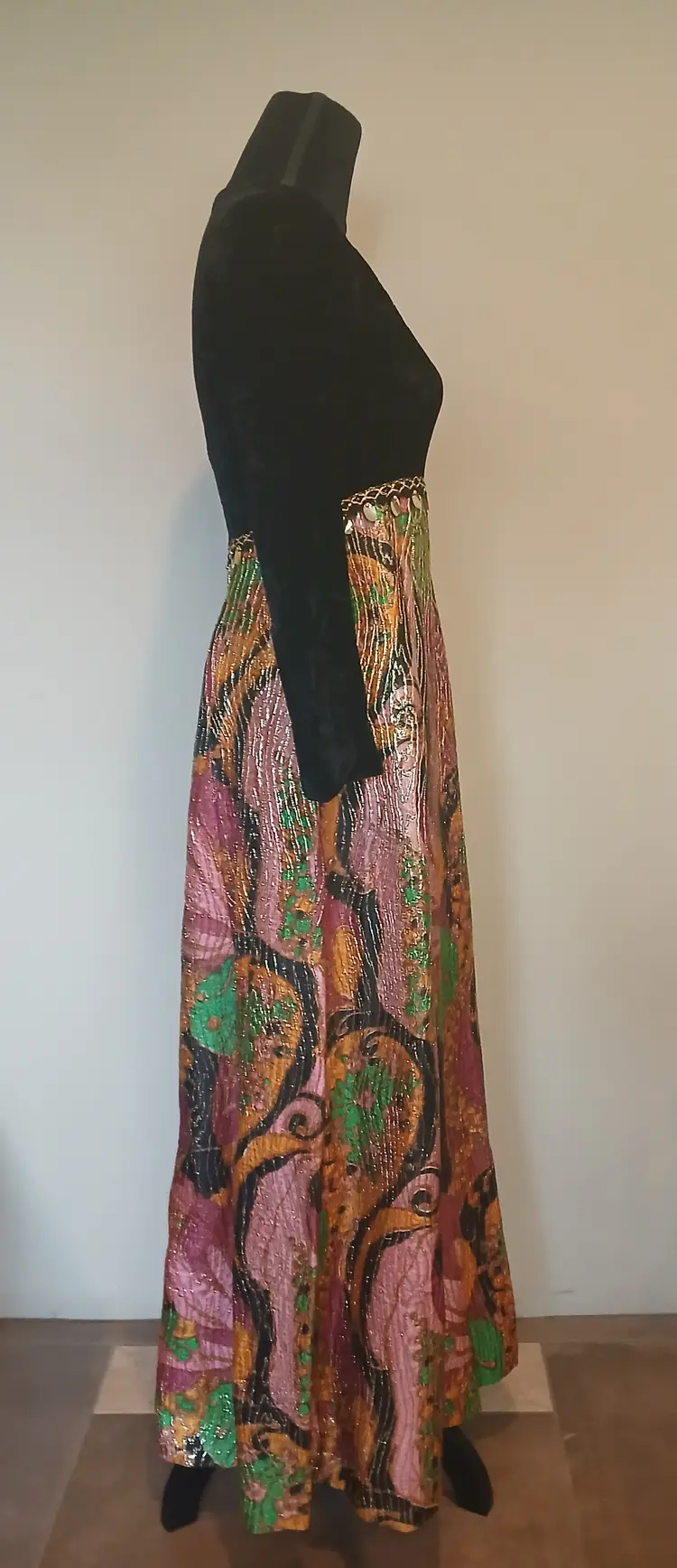 Stunning 1970s Lurex and crushed velvet Maxi Dress In excellent condition! missing one gold embellishment under the armpit. Not noticeable buy worth noting! Label: Has been cut out but union tag is present. Bust: 34 inches Sleeve: 21 inches Length: 55.5 inches If you need more measurements or photos please message me! Check out my other listings as I will combine shipping.
