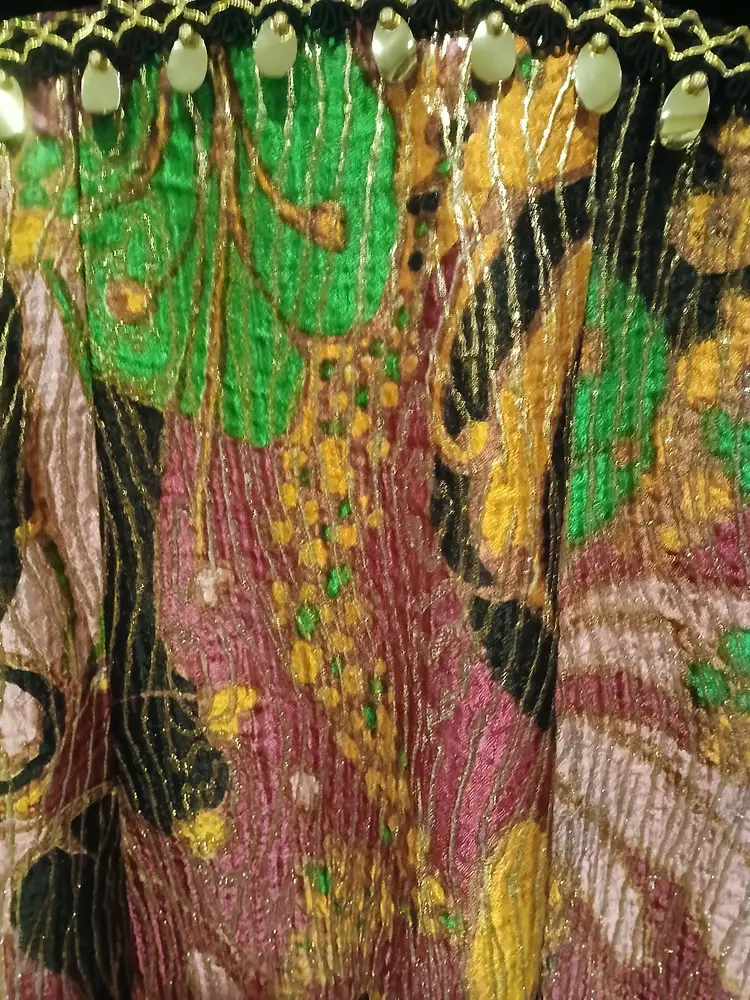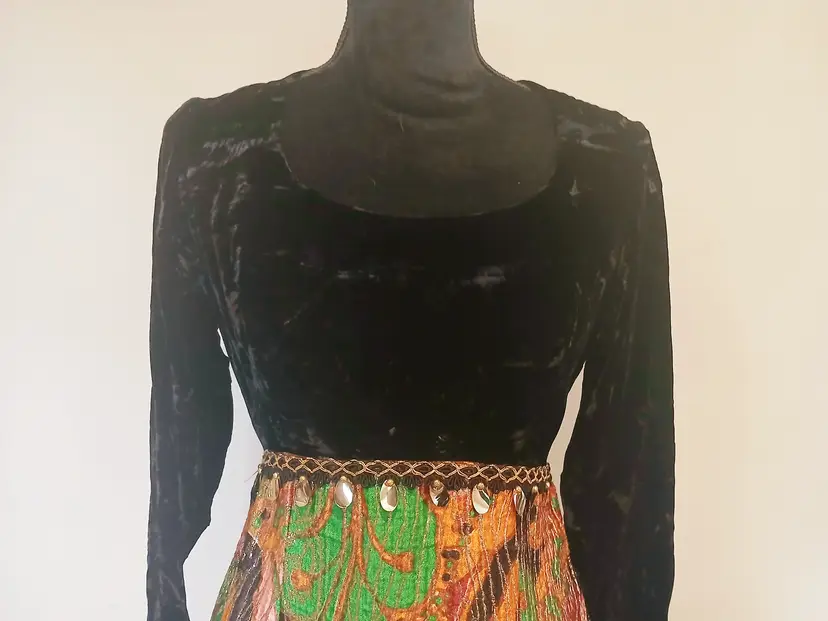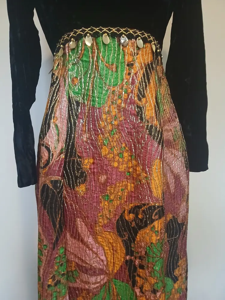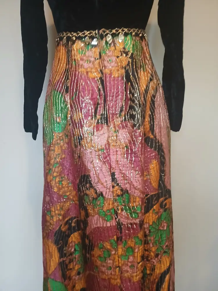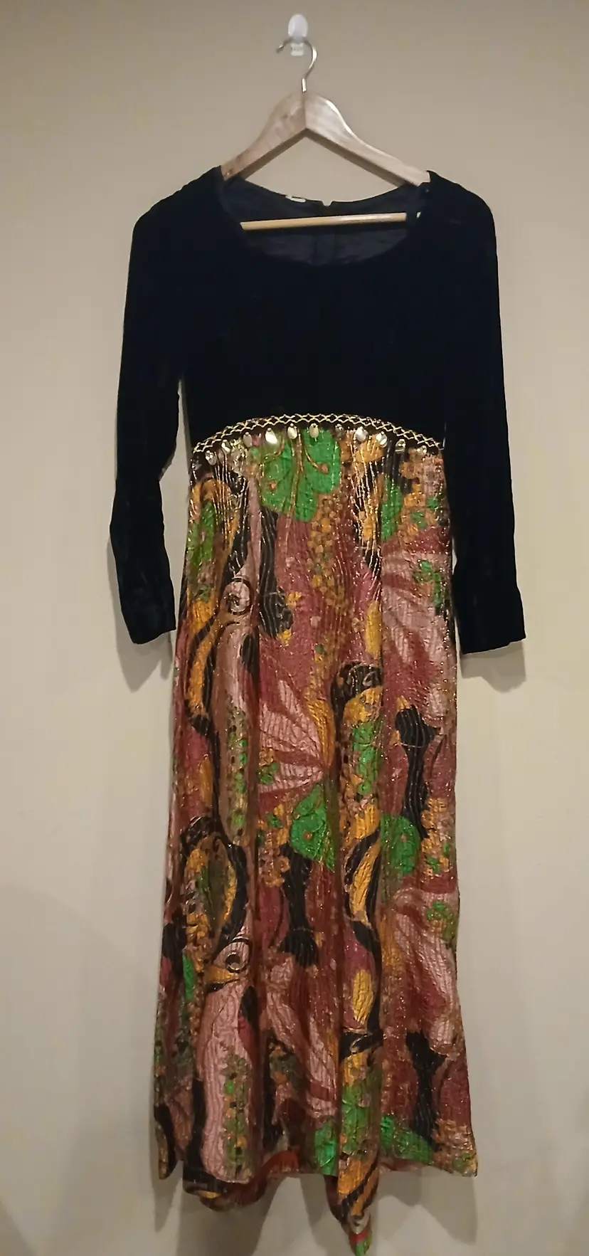 Stunning 1970s Lurex and crushed velvet Maxi Dress In excellent condition! missing one gold embellishment under the armpit. Not noticeable buy worth noting! Label: Has been cut out but union tag is present. Bust: 34 inches Sleeve: 21 inches Length: 55.5 inches If you need more measurements or photos please message me! Check out my other listings as I will combine shipping.