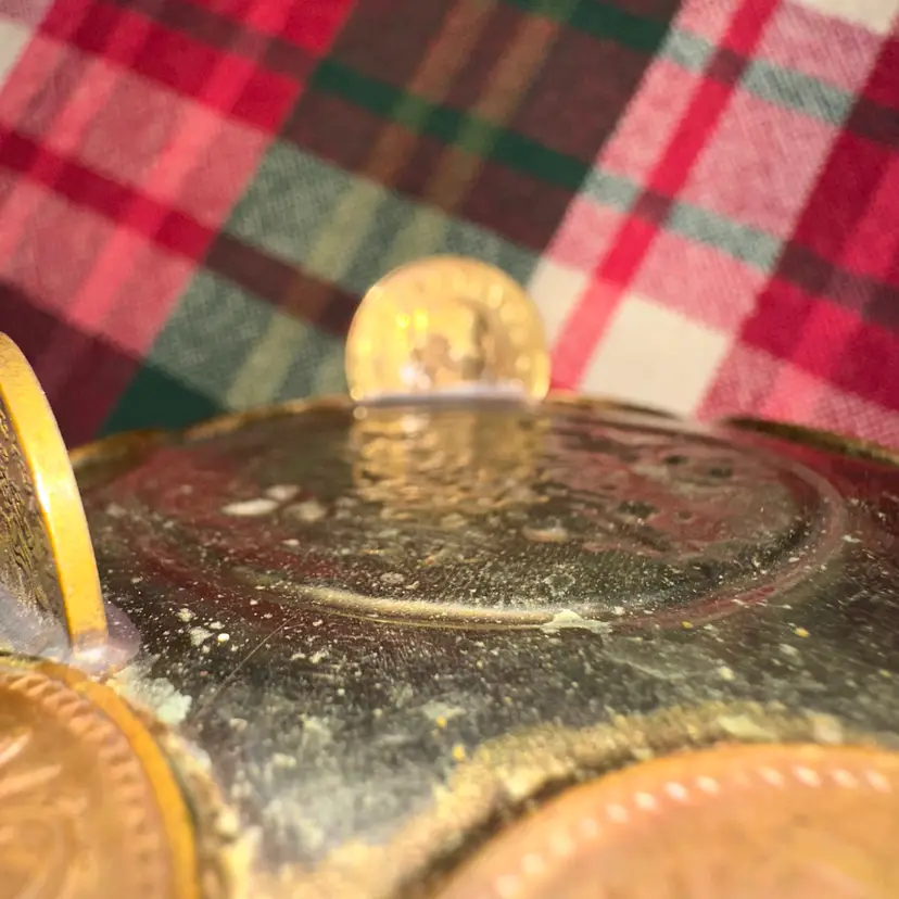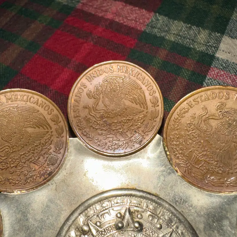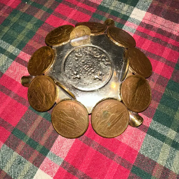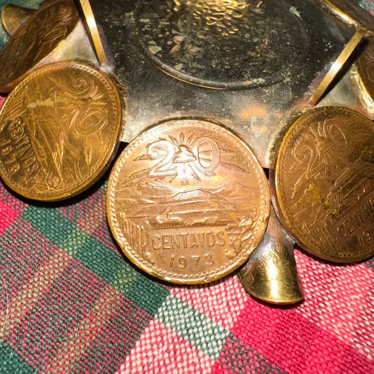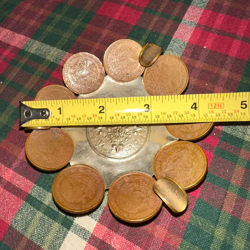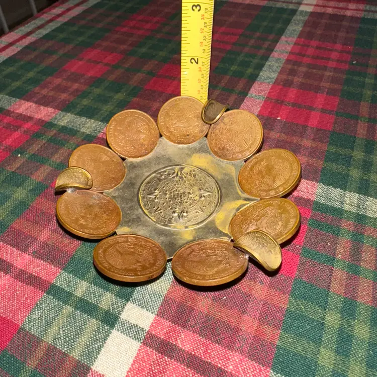 Mexican 1970's ashtray with 5 and 20 centavo's. Not marked. 4 1/4" across and 1" tall.