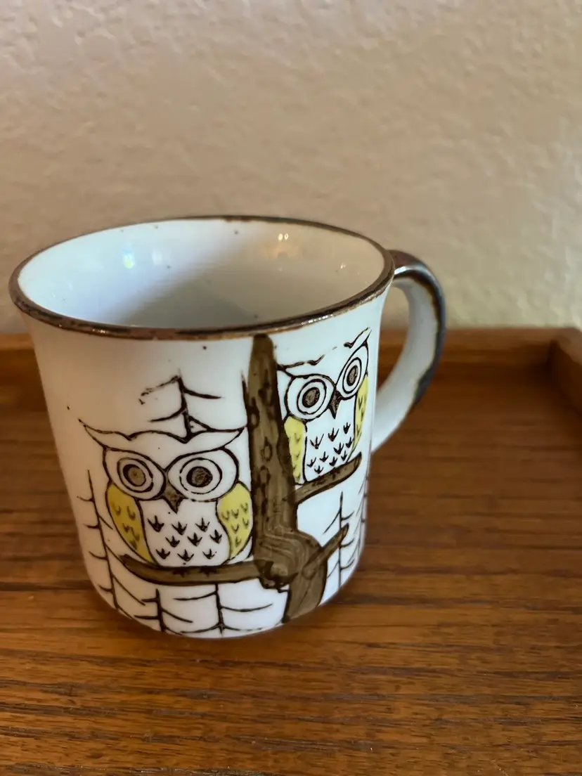 The mug features two owls perched on a tree branch, rendered in a folk art style. The owls are painted with yellow and brown accents, and the mug has a brown rim and handle. The overall design evokes a retro, mid-century modern aesthetic.