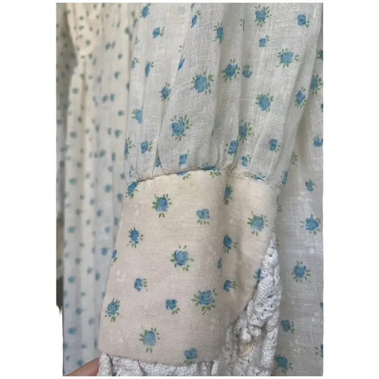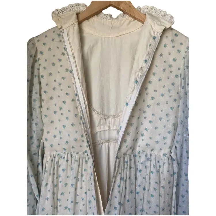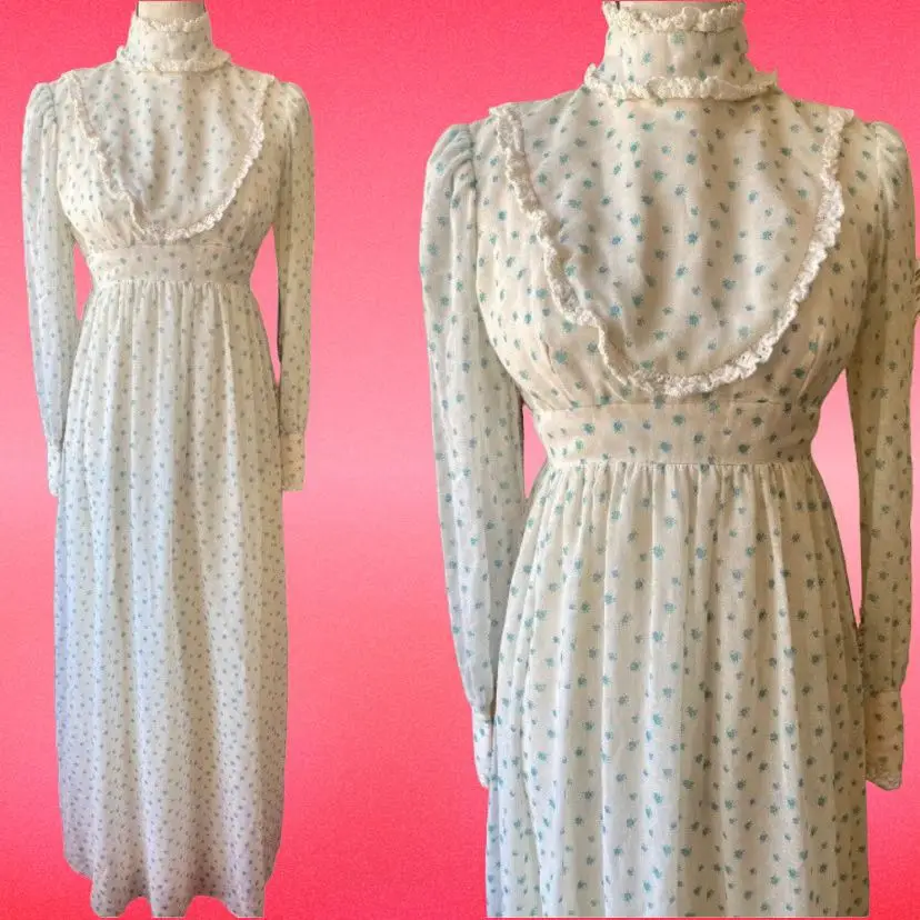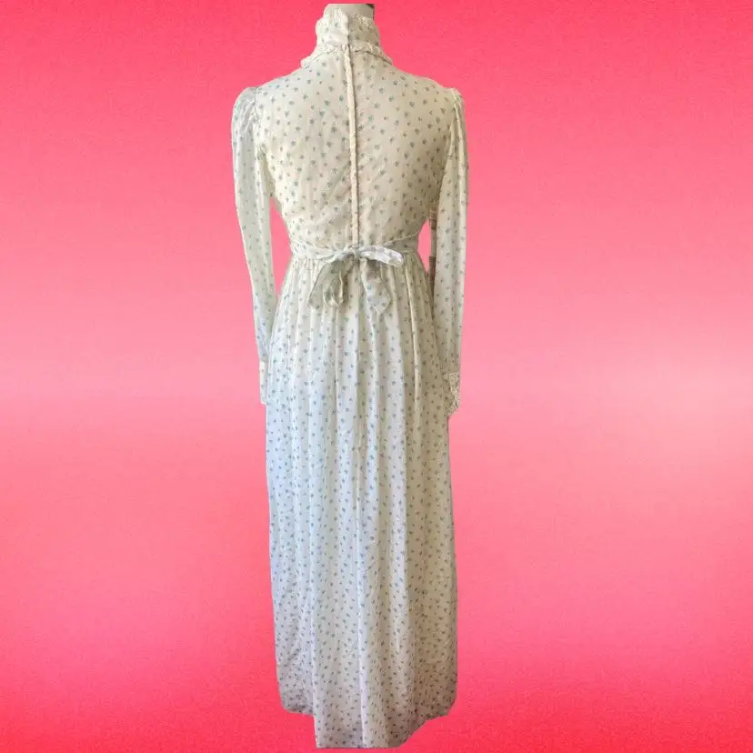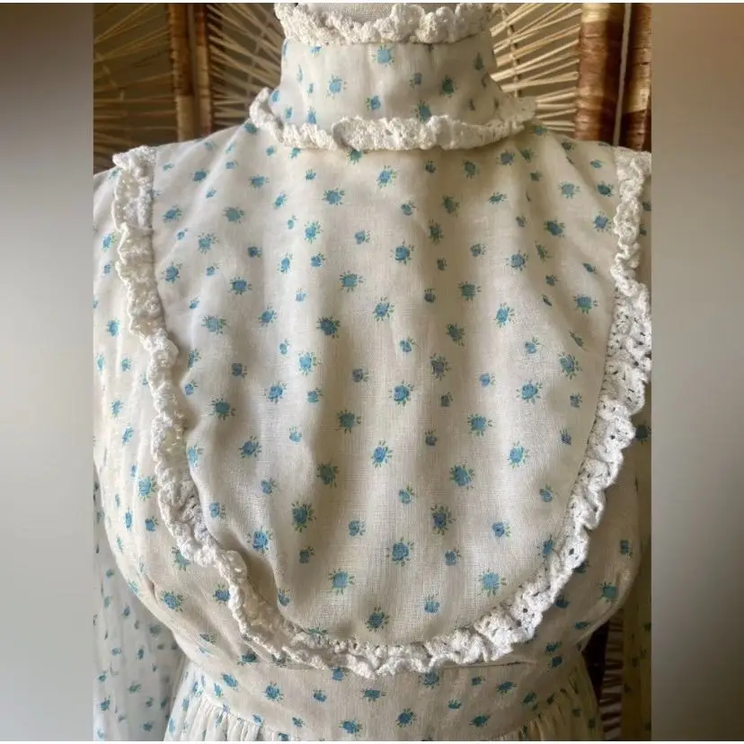 Vintage 1970s Prairie Maxi Dress with White and Blue Floral Print