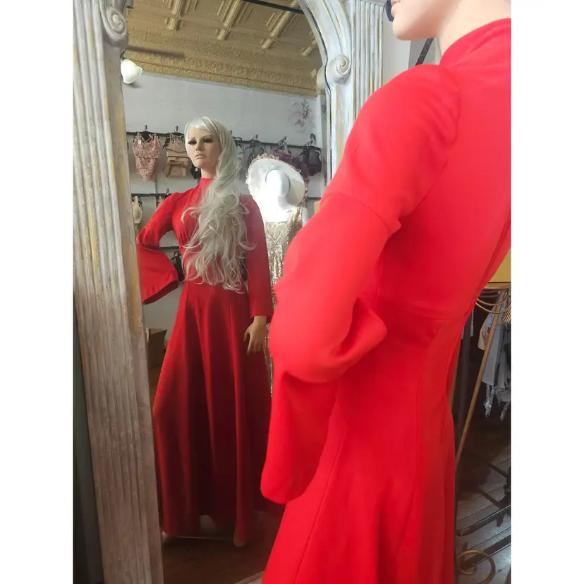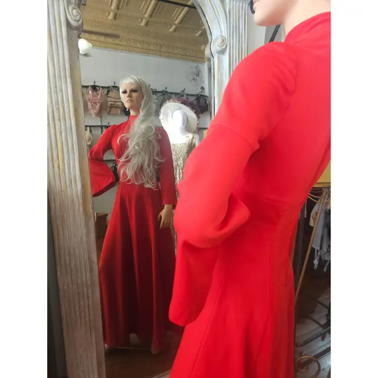 This Stunner features a mock neck collar, long bell sleeves, and gorgeous bodycon seams with a back zip closure. It is in excellent, wearable condition and has been fully cleaned