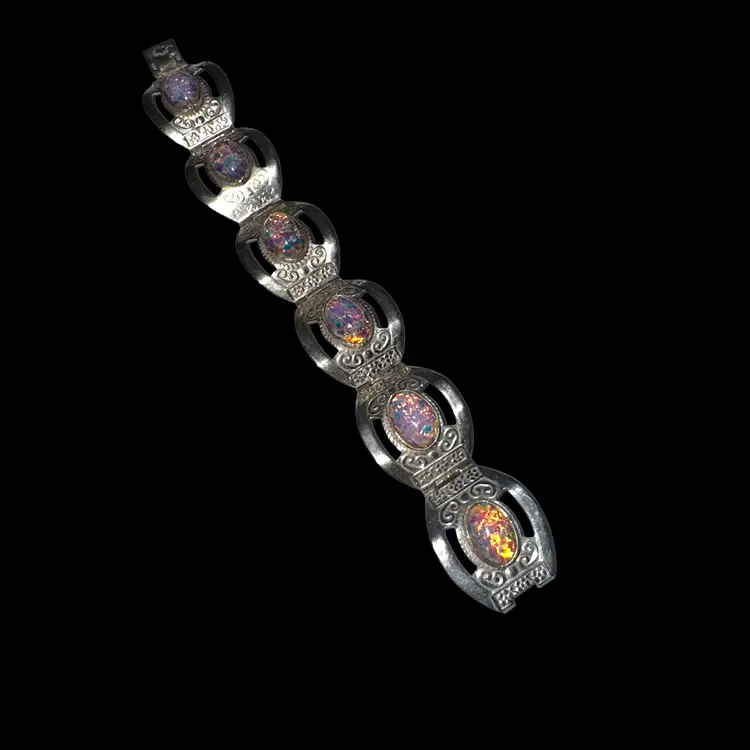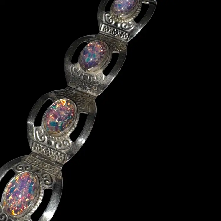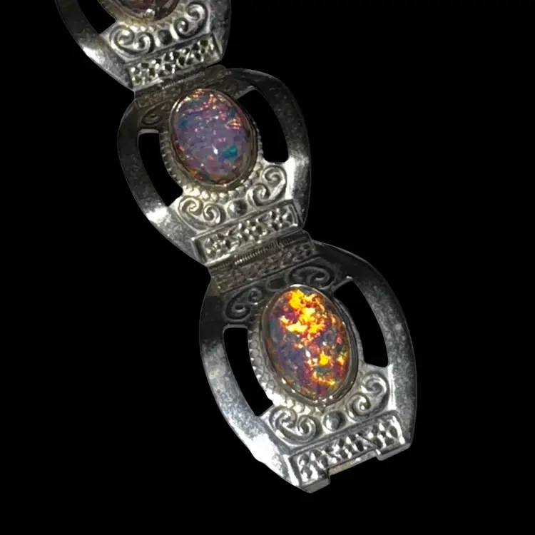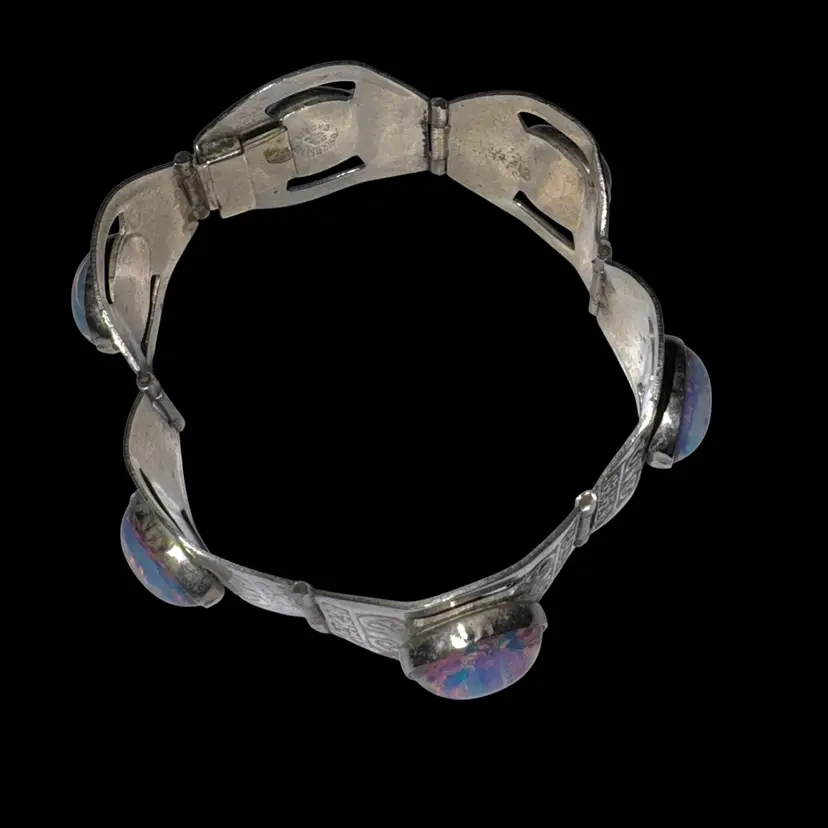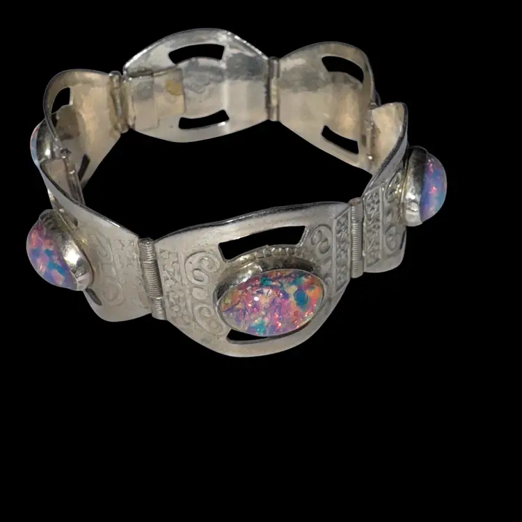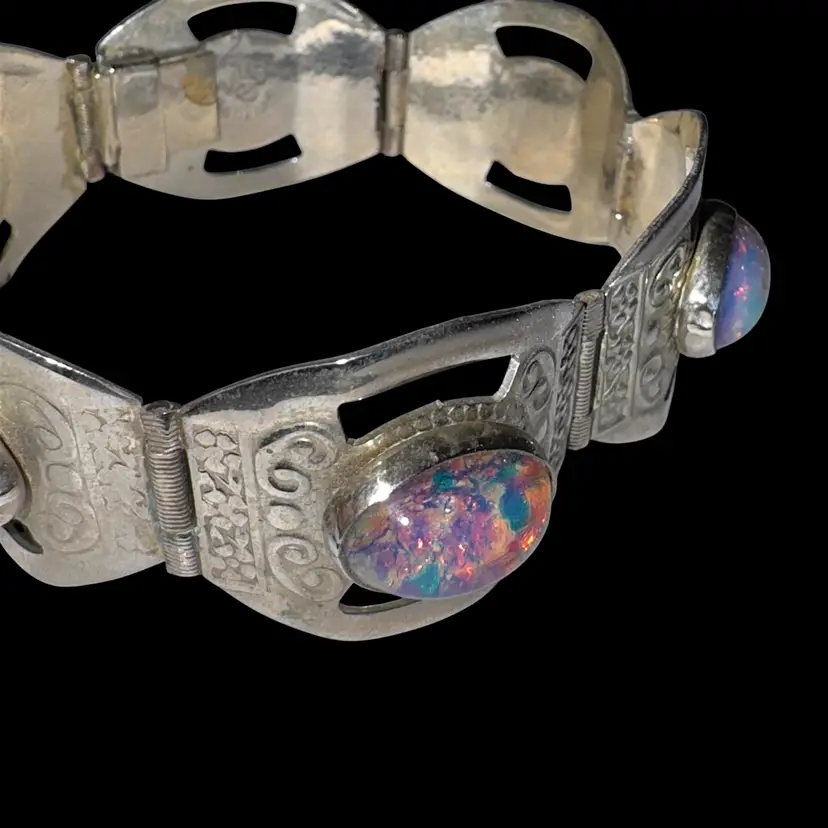 Vintage 1970s Silver 925 Stamped Panel Bracelet with Multicoloured Faux Opal Beads Cabochons Artisan Made in Mexico Has Natural Patina - will leave new owner to polish Measuring about 7 inches long. Duties and Tariffs are already included in the Shipping Price