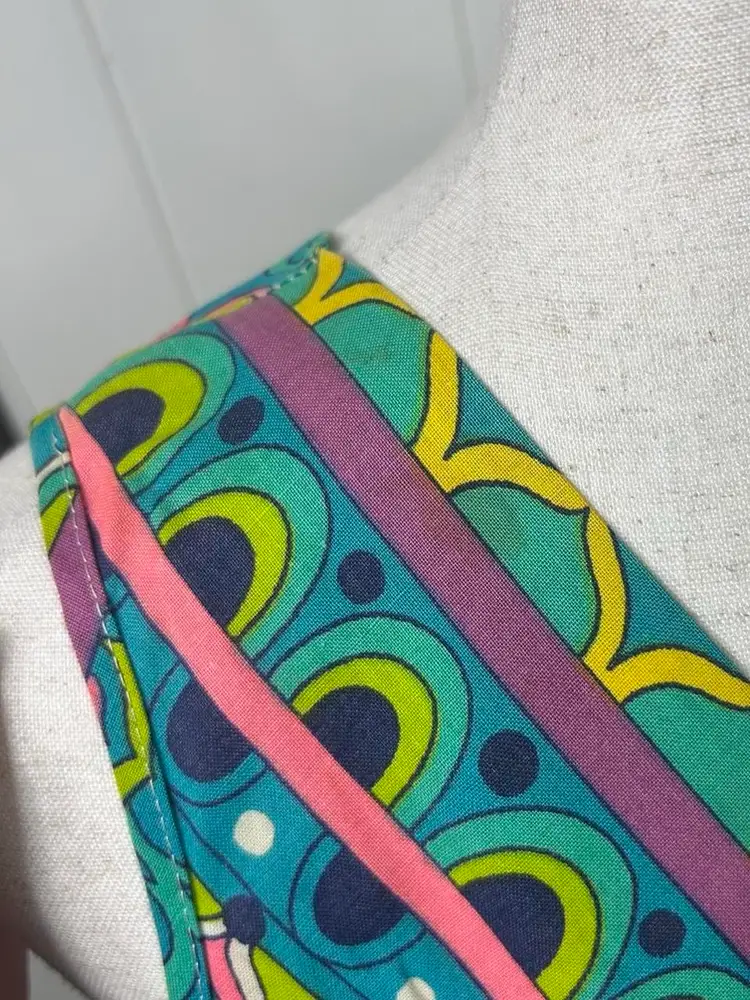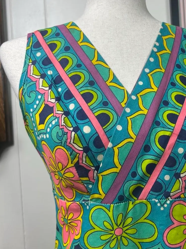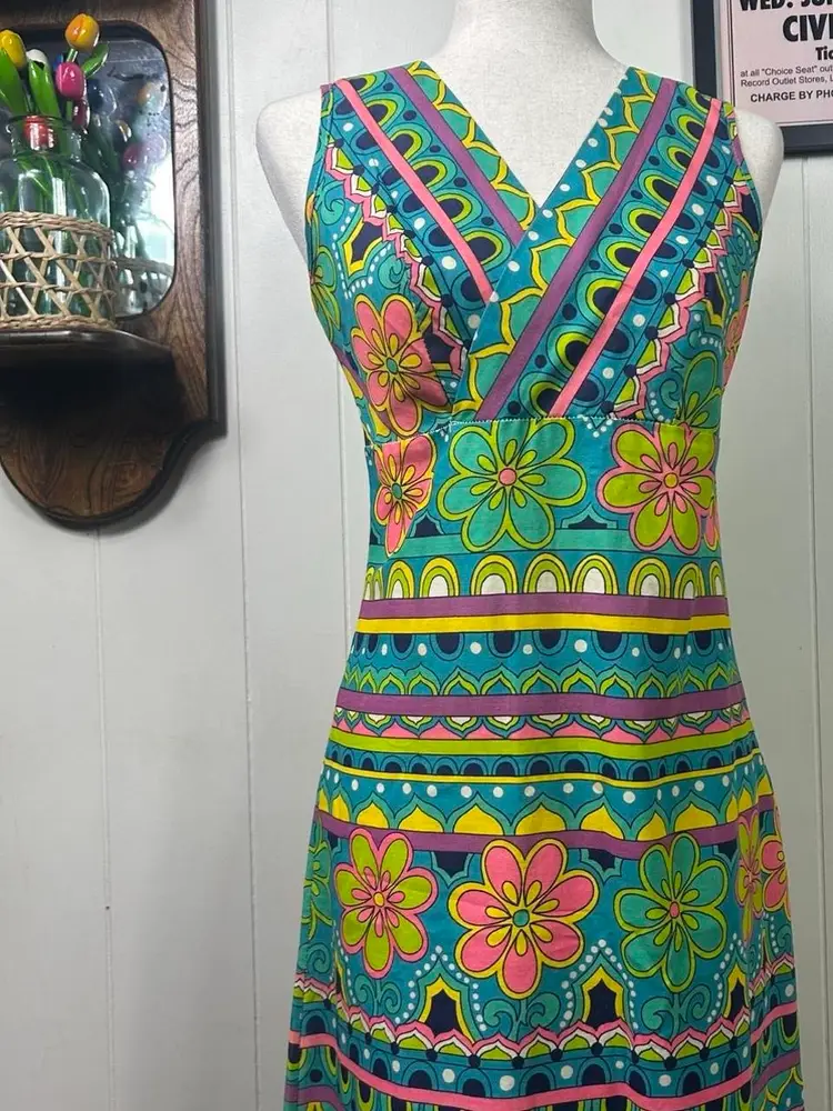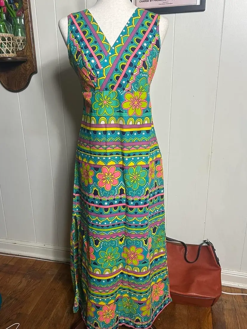 Vintage Maxi psychedelic geometric polka dot floral boho retro vintage 70’s dress. Gorgeous colorful signature 70s look. Original 1970’s Screen Design by M Lowenstein and Sons with V neck and zipper back. Small stain on upper shoulder. Slits at the bottom on both sides of the dress