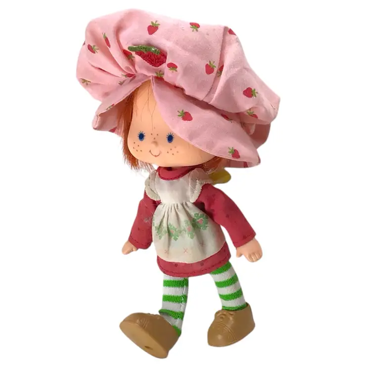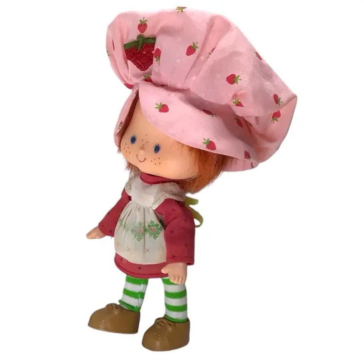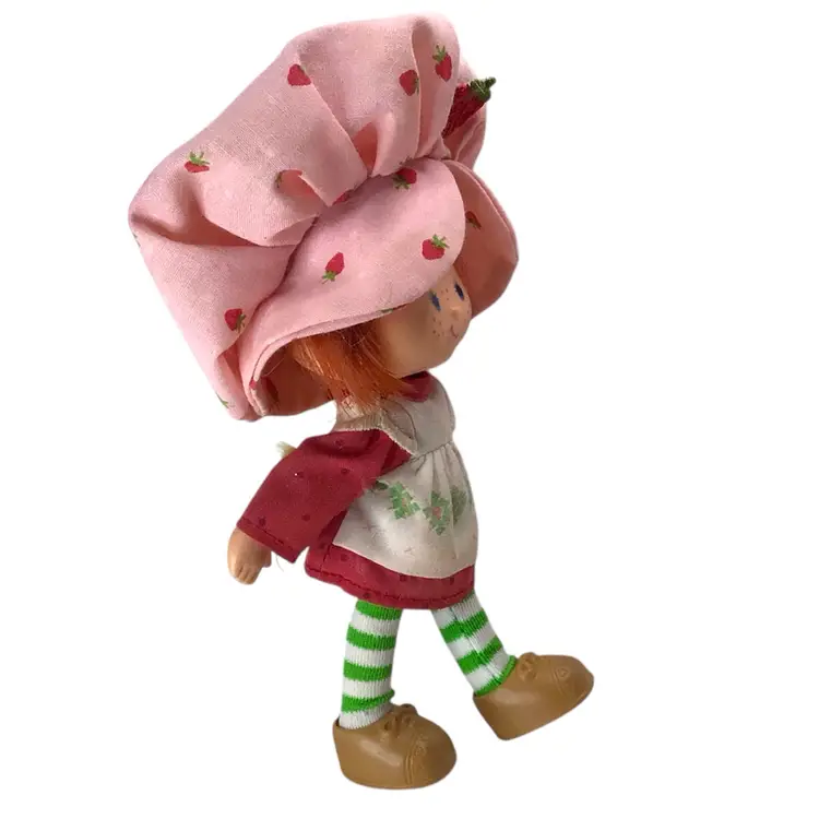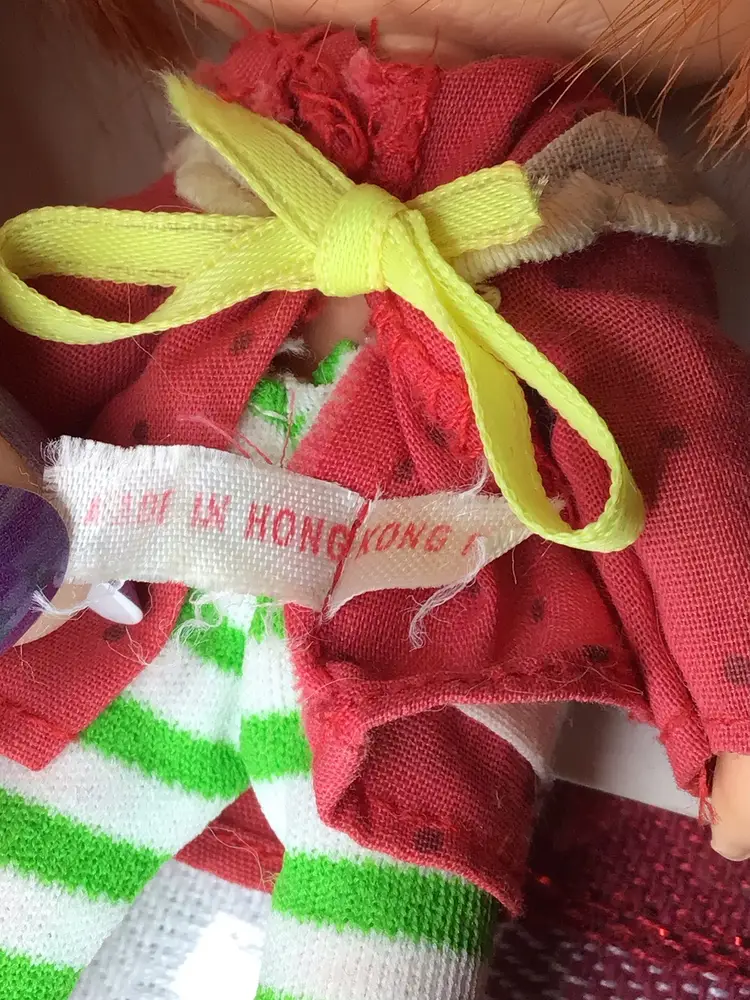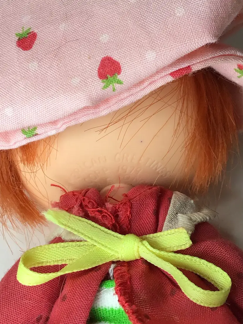 In 1979 Kenner produced the first five strawberry shortcake dolls. Except for Purple Pie Man, they all had flat rather than curved hands making them the most sought after dolls. They were each scented like their name. Unfortunately this doll no longer has any scent that I can detect. Dolls dress has some fading and apron yellowing from age. See photos for reference.