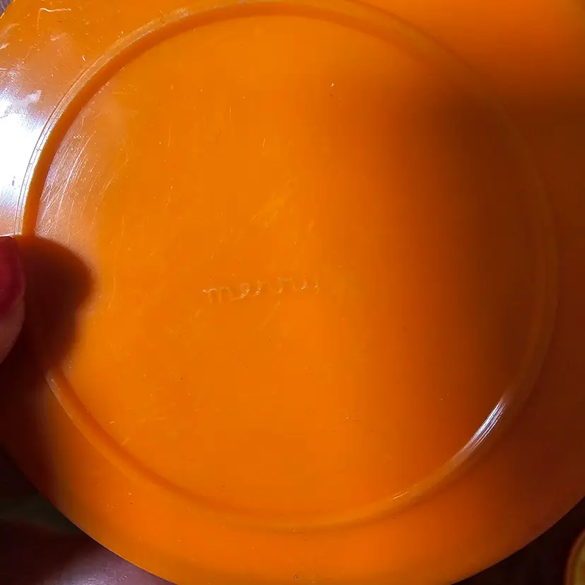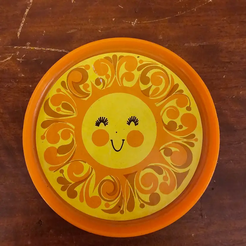Merry Toys: The four orange "Happy Sun" plates feature a smiling sun with retro scrollwork. These are marked "Merry" on the back.