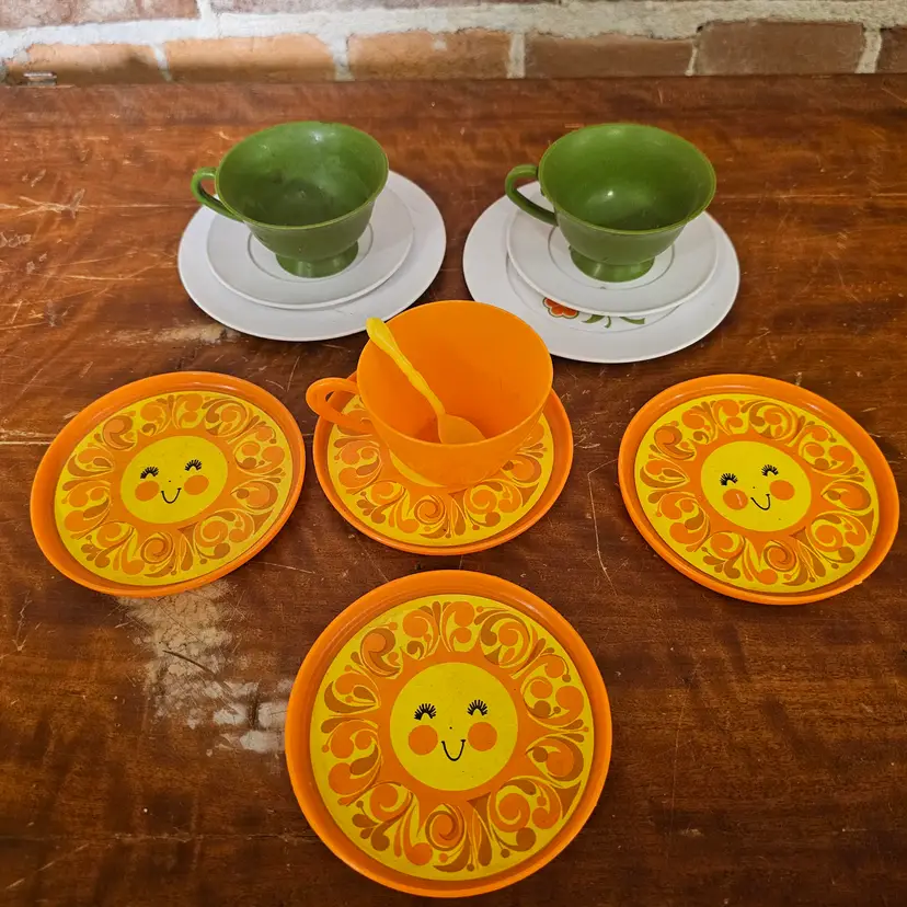 Lot Includes: 4 Chilton Toys white floral plates (2 large, 2 small) 4 Merry Toys orange "Happy Sun" plates/saucers 3 Plastic teacups (2 Green, 1 Orange) 1 Yellow plastic spoon