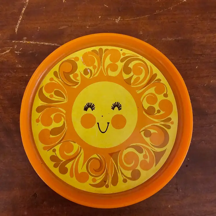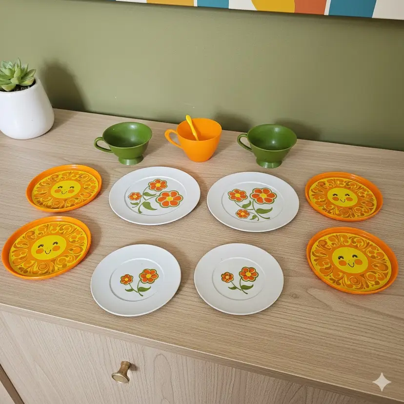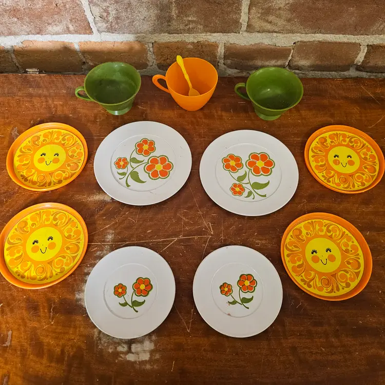 Bring some 1970s sunshine to your collection with this mixed lot of vintage plastic play dishes. This set features two distinct and highly recognizable patterns from the era: the "Happy Sun" design and a classic "Flower Power" floral motif.