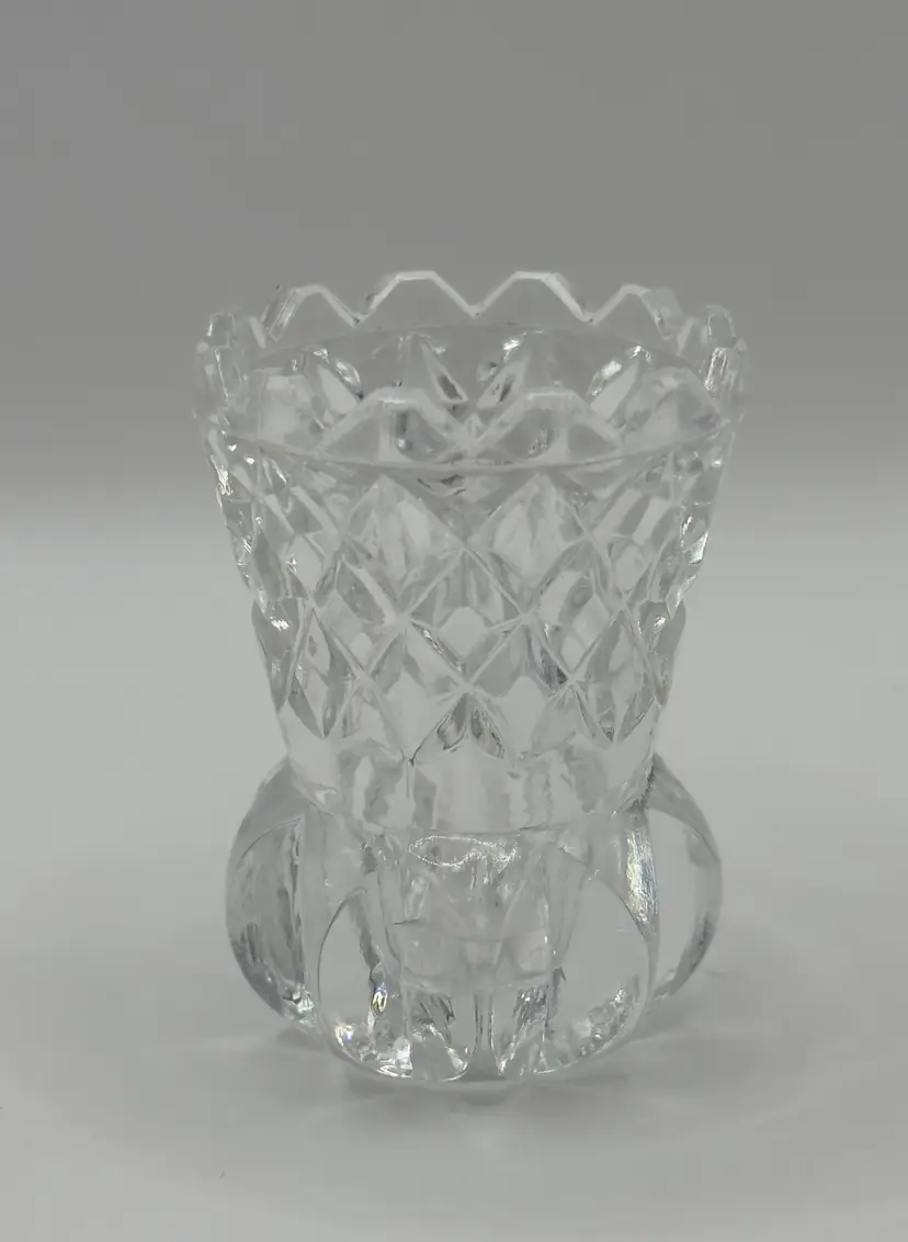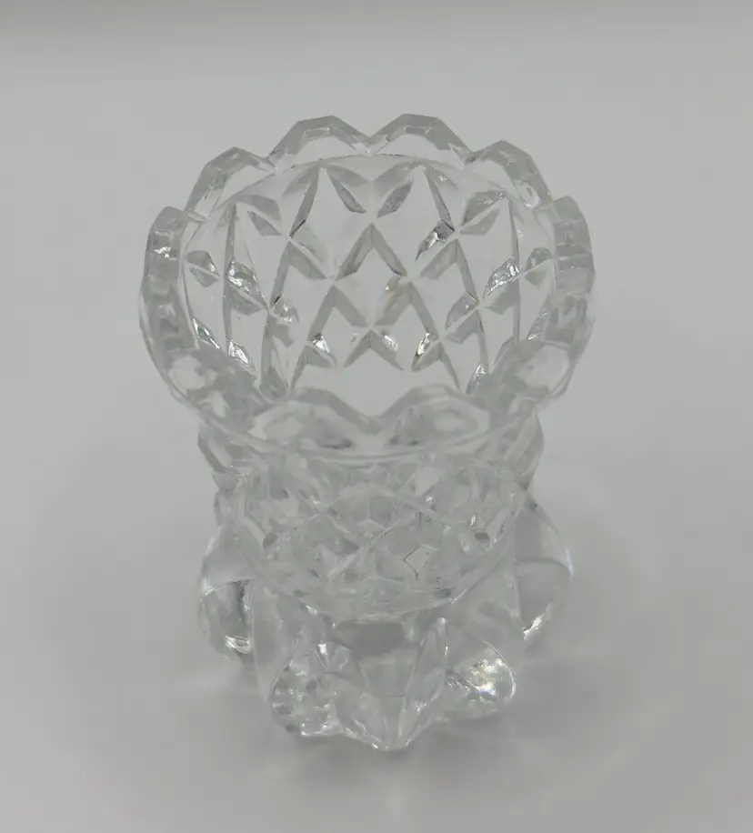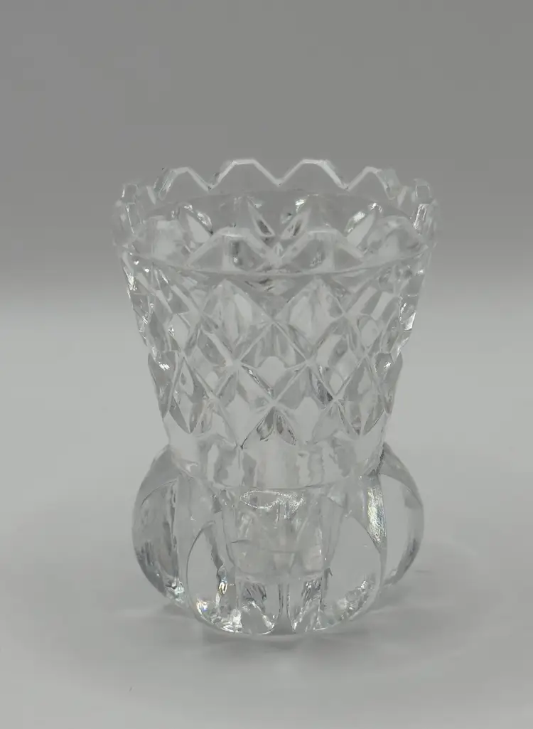 Add a touch of elegance to your home with this vintage lead crystal diamond cut, saw blade cut, oval cut bottom. The intricate design and crystal make it a perfect accent piece for any dining room or kitchen. Ideal for holding toothpicks. Excellent condition with no chips or cracks. Measures 1.5x2.5x2 inches. Weighs 6oz.