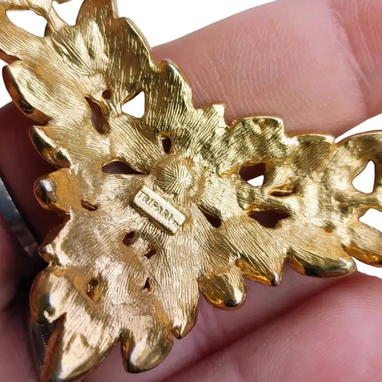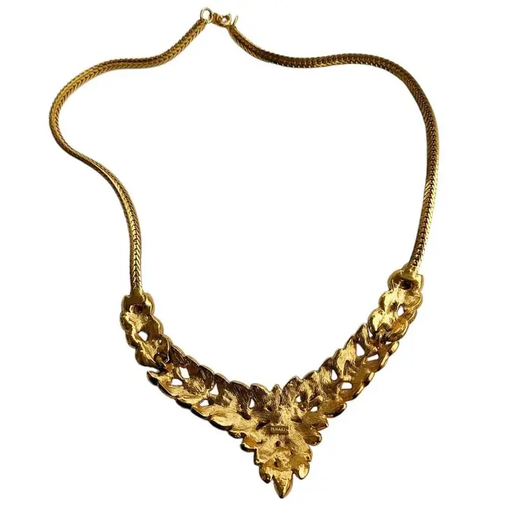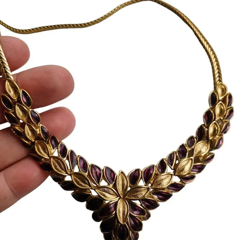 💜 Around 19" in length. Centerpiece- 5" wide with a 3" drop. 💜Amethyst Guilloche Enamel and gold plated leaves. 💜Excellent condition. 💜Signed Trifari on backside and near clasp.