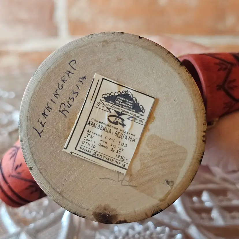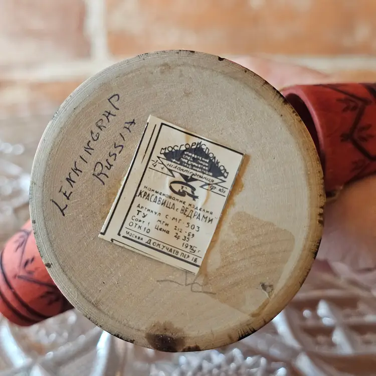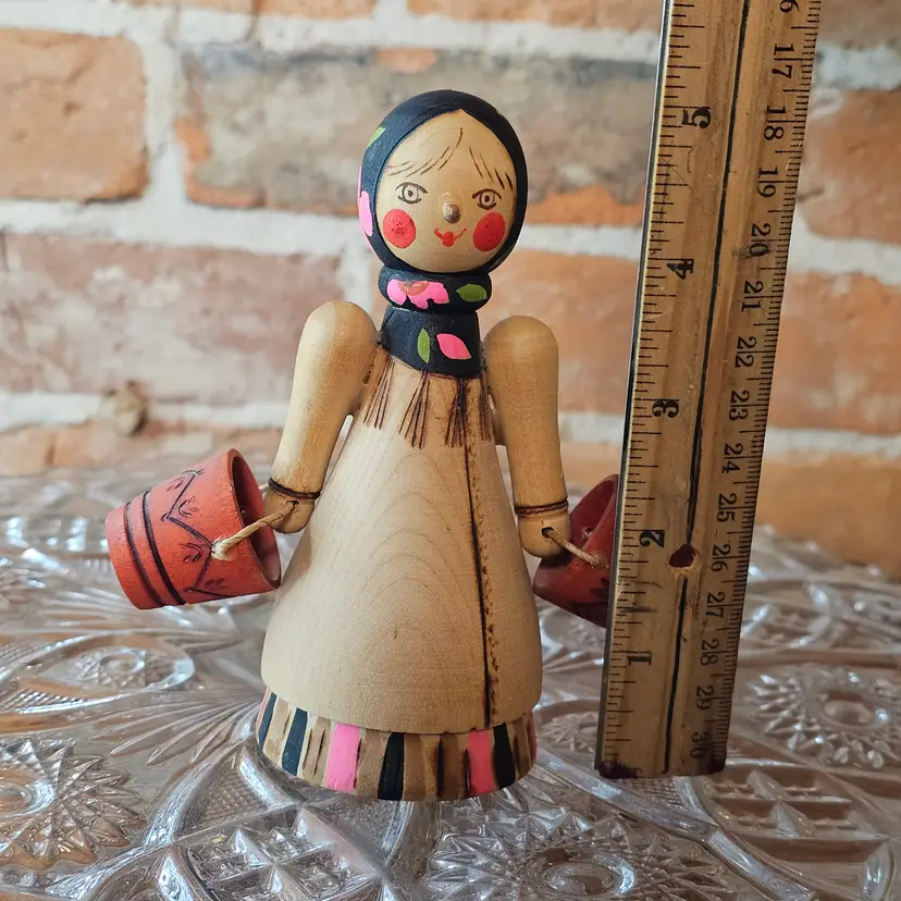 – Measures approx. 5.25" tall – Hand-painted wood – Original USSR paper label on base – Marked Leningrad, Russia – 1970s Soviet export piece – Buckets and arms intact and original