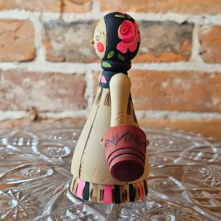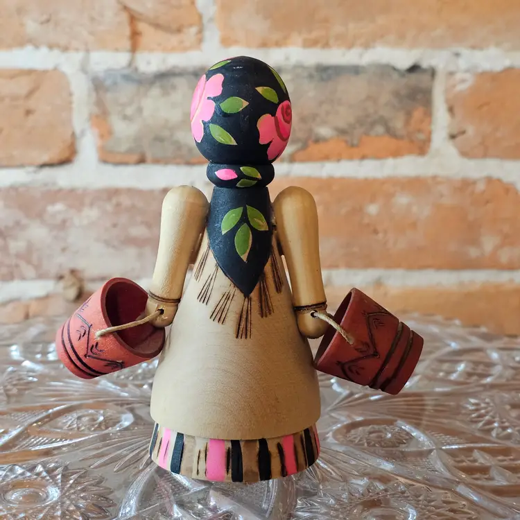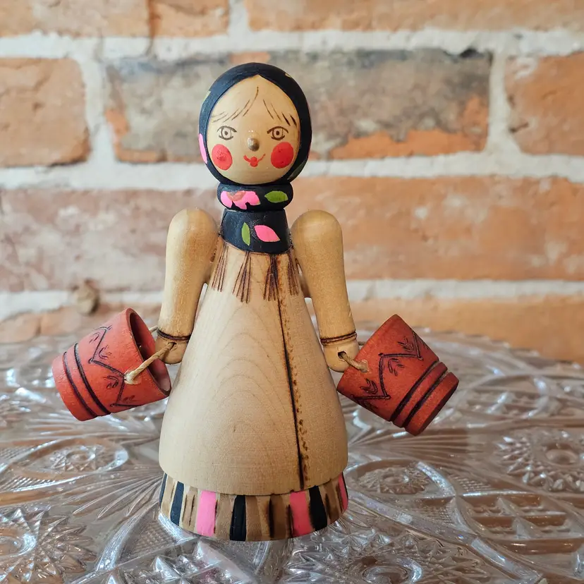 Darling vintage Soviet-era wooden folk art doll from the 1970s featuring the classic water carrier girl motif with painted wooden buckets. Hand-turned wood with original paper USSR export label on the base marked Leningrad. Beautiful bright paint, sweet rosy cheeks, and tons of charm for shelf styling, folk art displays, or matryoshka collections.