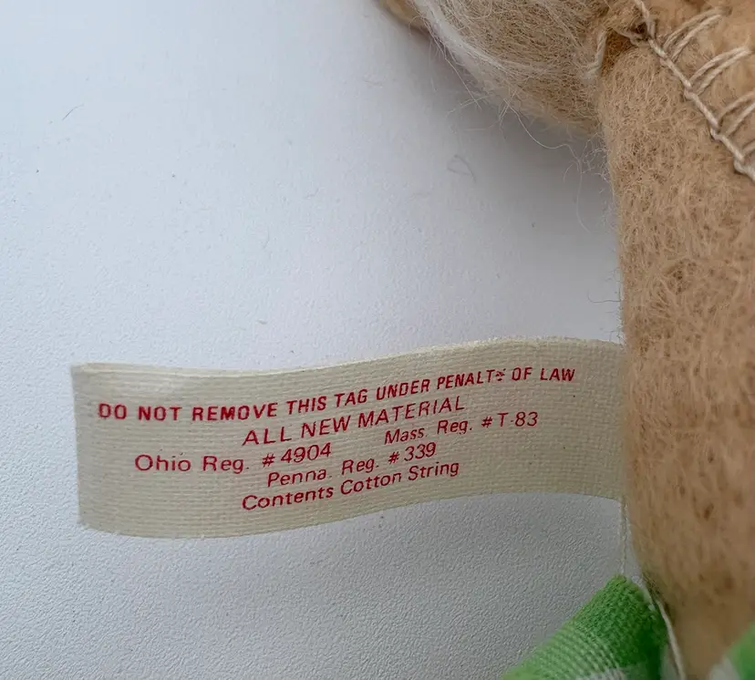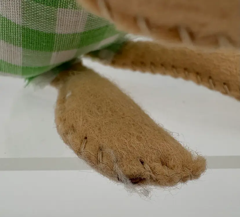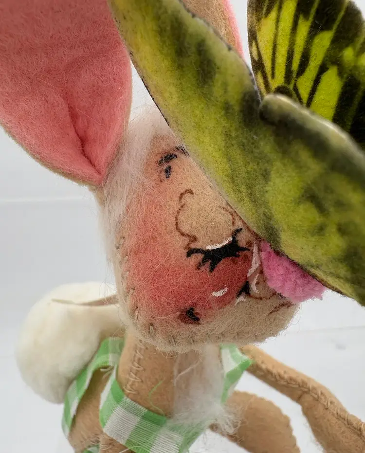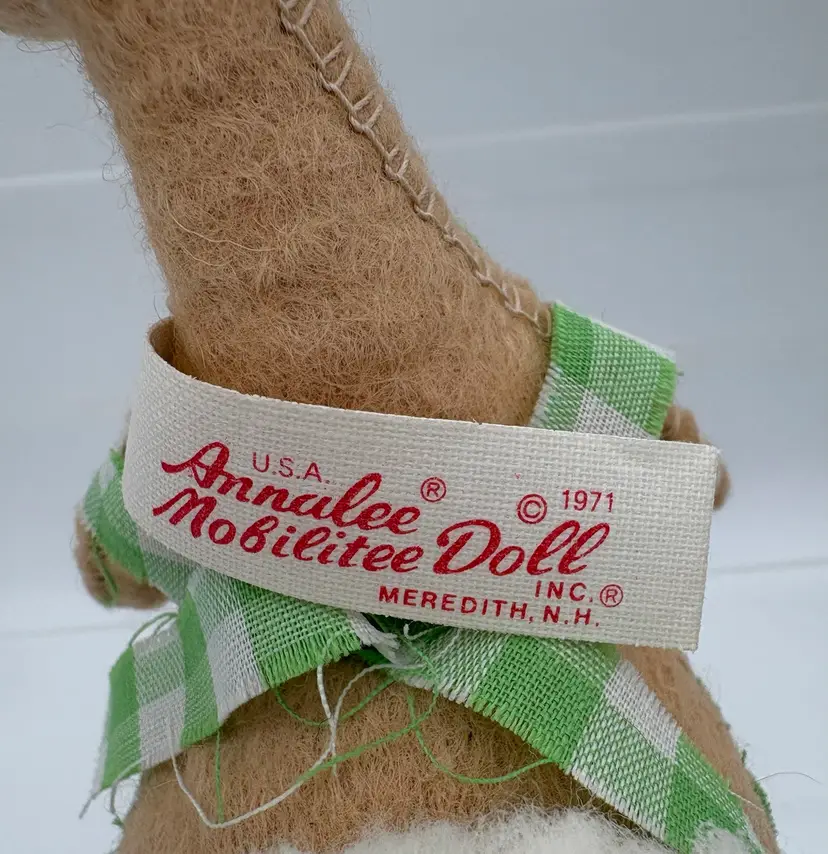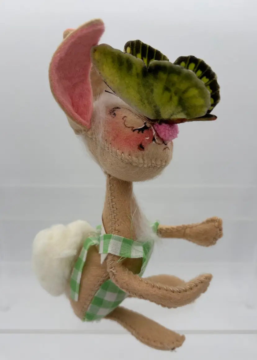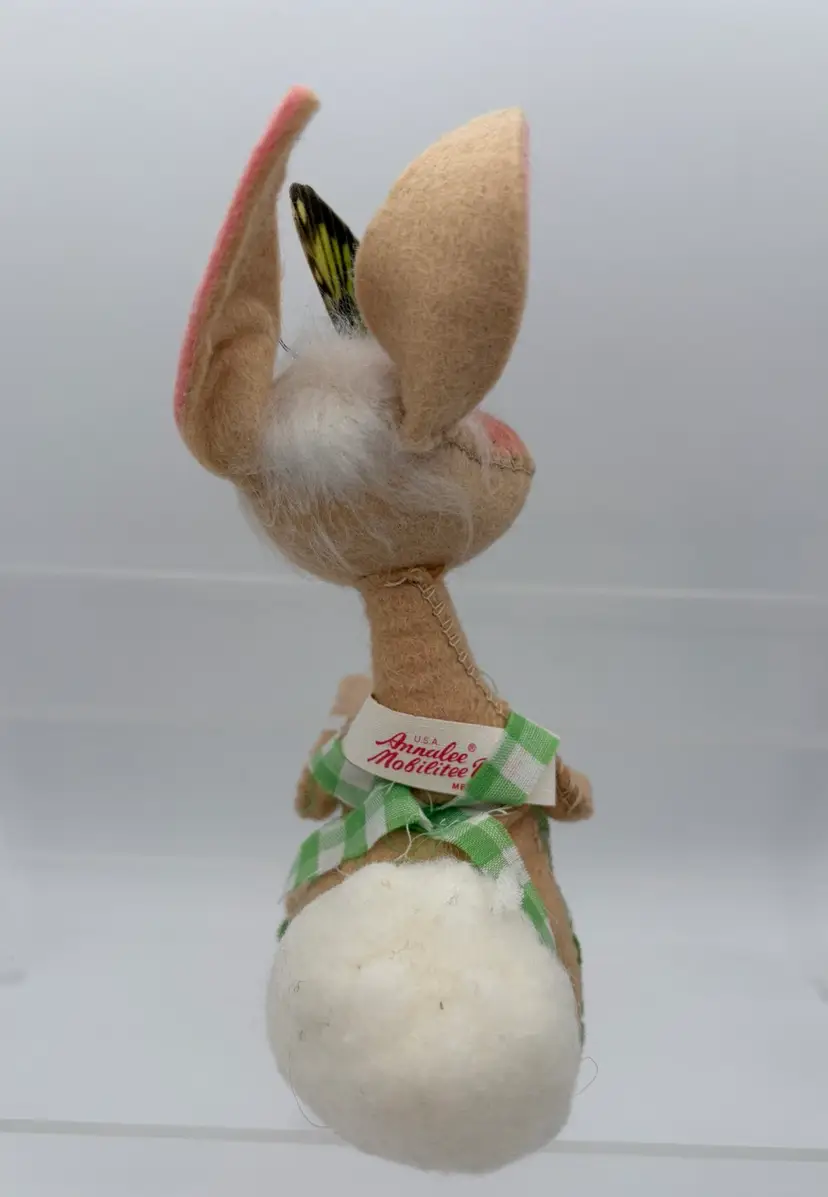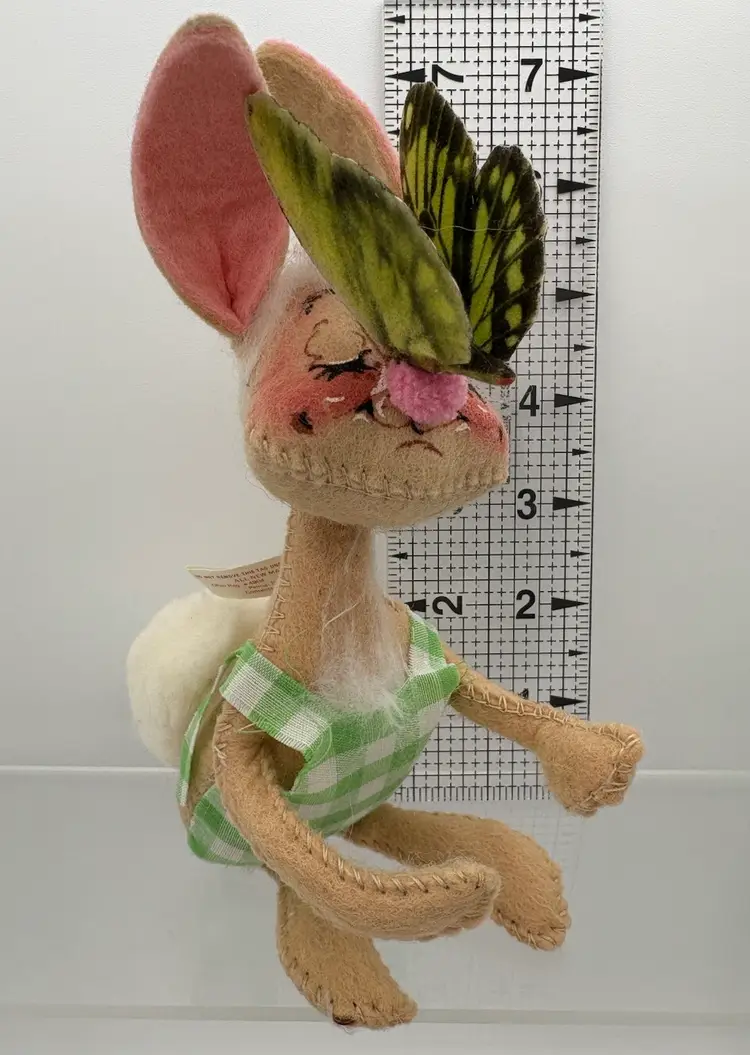 6 1/2”H x 4 1/2”D x 2 1/2”W Big fluffy white cotton tail. Green gingham romper with some fraying along the edges. Butterfly attached to his pink pompon nose. Annalee Mobilitee Doll tag dated 1971. His right foot wire is visible on the front edge of his foot. Good clean condition, no smells.
