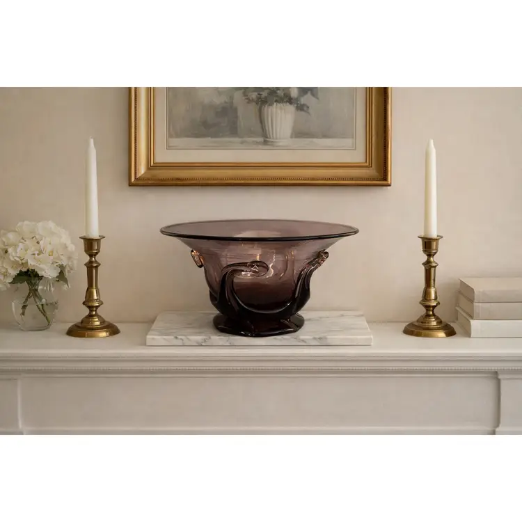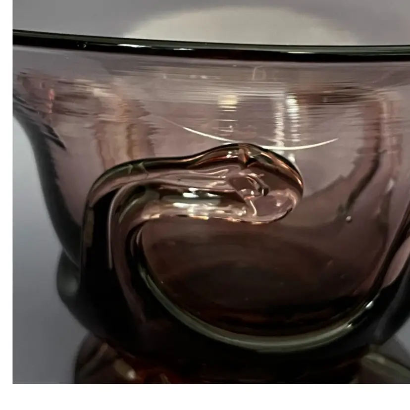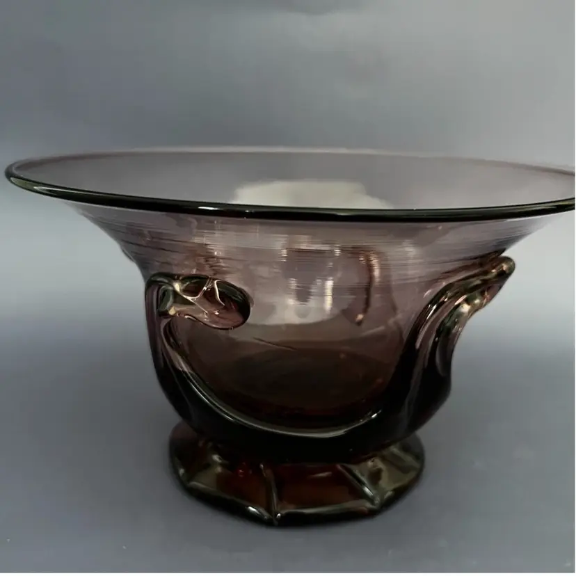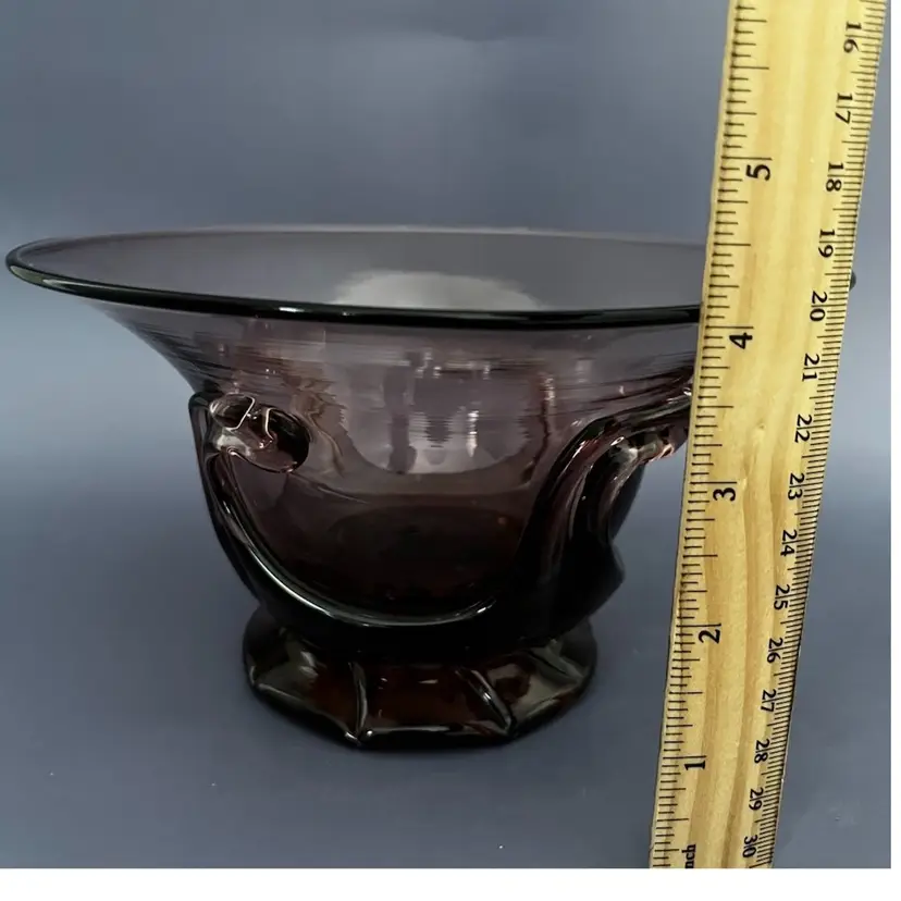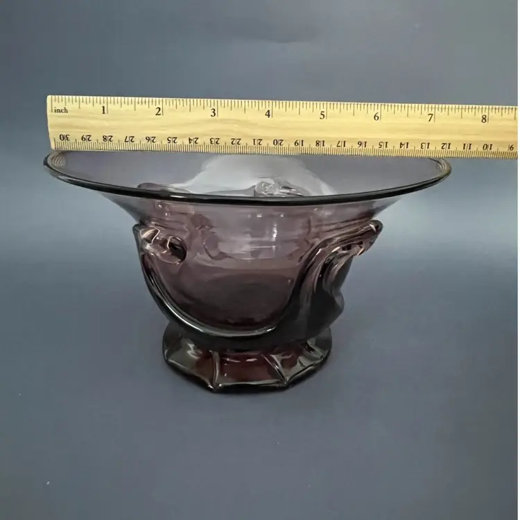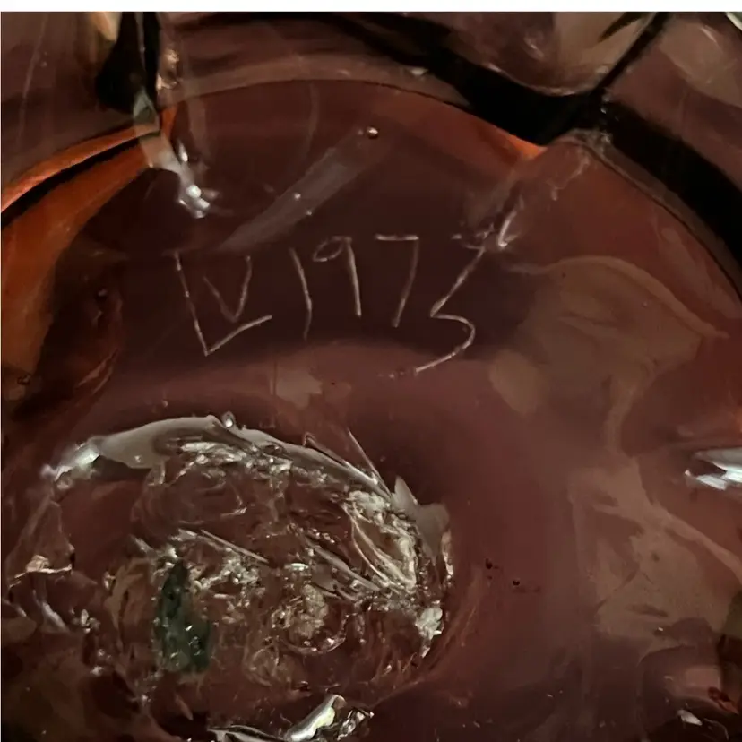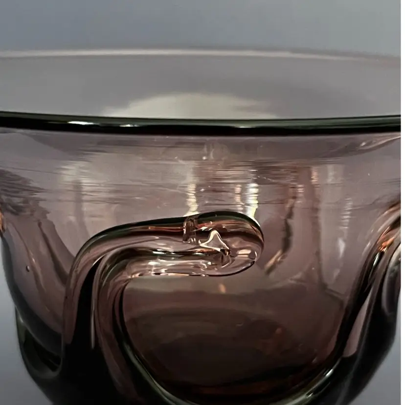 Fabulous Vandermark Signed Purple Waves Art Deco Vase. Signed LV 1973 this is the Doug Merritt Liberty Village marking. The vase's abstract art theme is beautifully expressed in its unique wave pattern and striking purple color. Measuring 7 1/2 inches at the mouth, and 4 inches high, this piece is the perfect size for displaying flowers or as a standalone statement piece. As shown there is a mark above a wave made at firing by the glass tongs. This does not detract from the beauty of this art deco style piece.