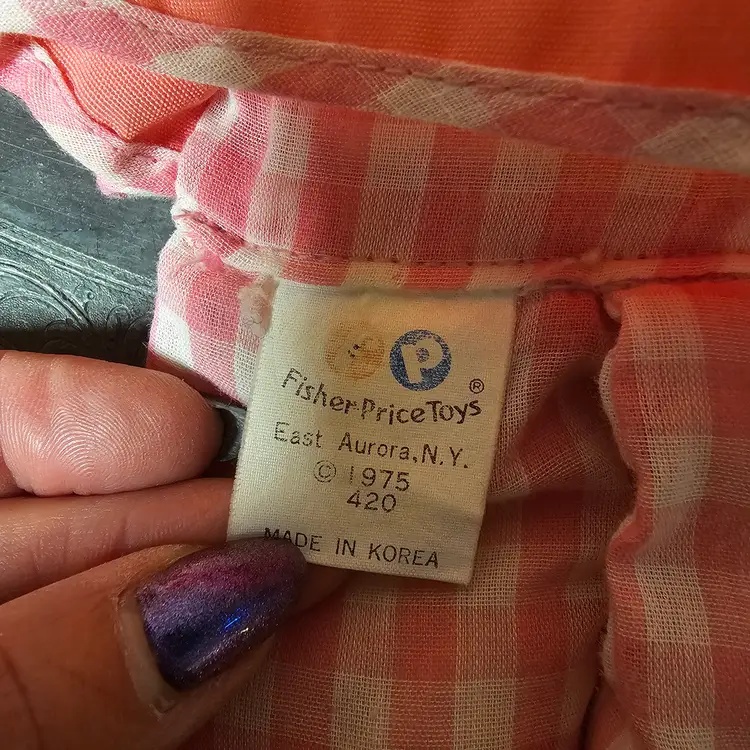 Manufacturer & Date: The tag clearly shows the doll was made by Fisher-Price Toys, East Aurora, N.Y.. It is copyrighted 1975.
