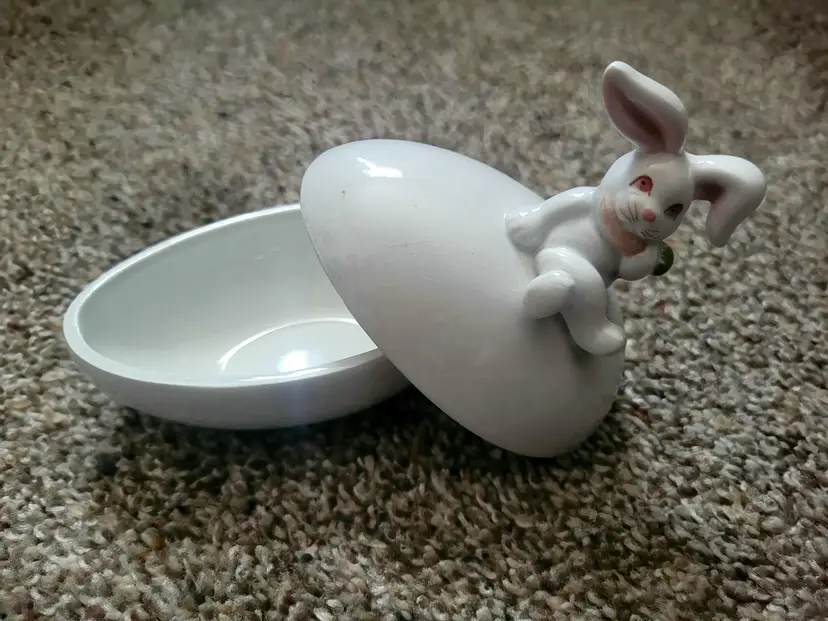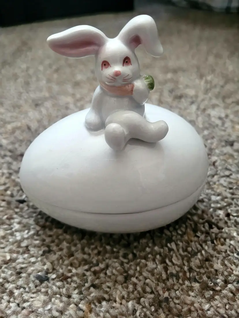 This vintage 1978 Easter egg from Fitz & Floyd features a charming bunny rabbit holding a carrot. Made from high-quality ceramic and porcelain, this collectible item is sure to delight collectors and enthusiasts alike. The white color and intricate design make it a beautiful addition to any home decor. Produced in Japan, this item is in excellent condition and is a must-have for any serious collector.