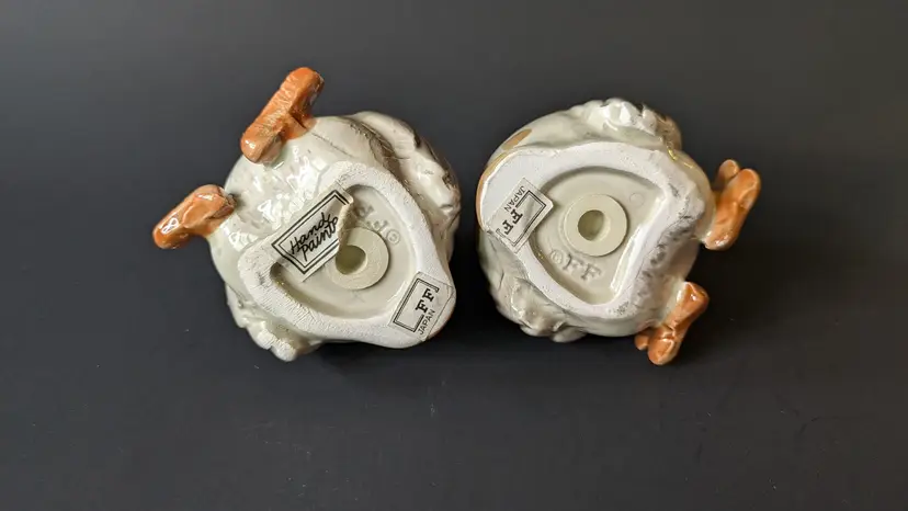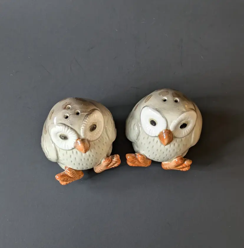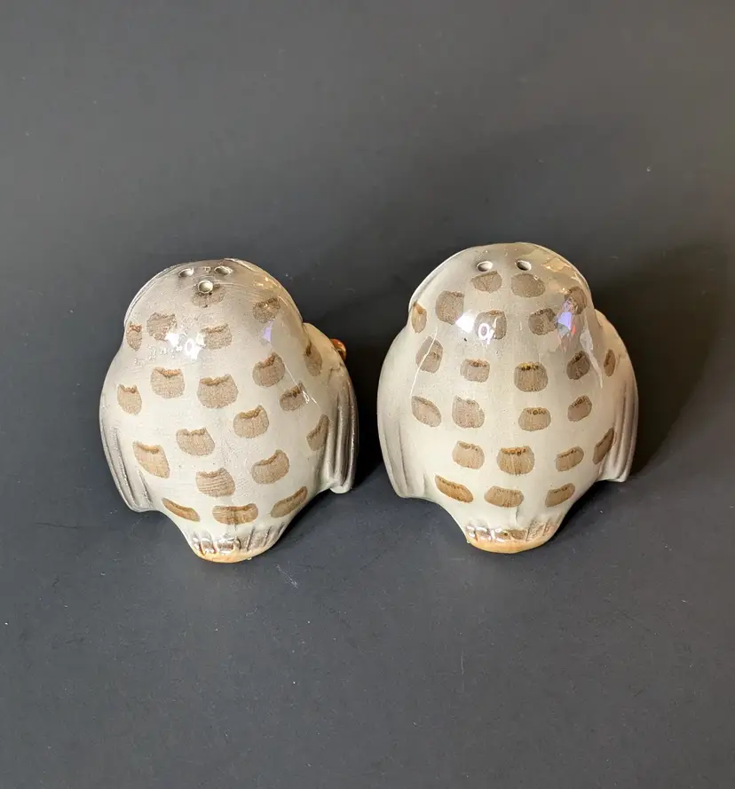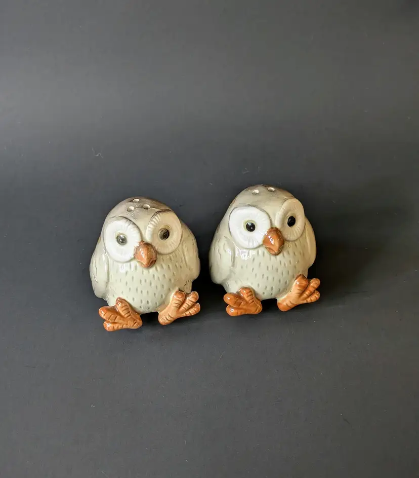 This vintage 1978 Fitz and Floyd FF Baby Owl Ceramic Salt Pepper Shakers Set from Japan features an all-over owl pattern, making it a charming addition to any kitchen or collection. The small ceramic shakers come in a set of two, including a pepper shaker and a salt shaker, both adorned with adorable owl designs. The cottagecore style and woodland creatures theme make it a unique and original piece perfect for all occasions. With its original stoppers and intricate details, this set is a must-have for collectors of Fitz and Floyd items and fans of vintage kitchen decor.
