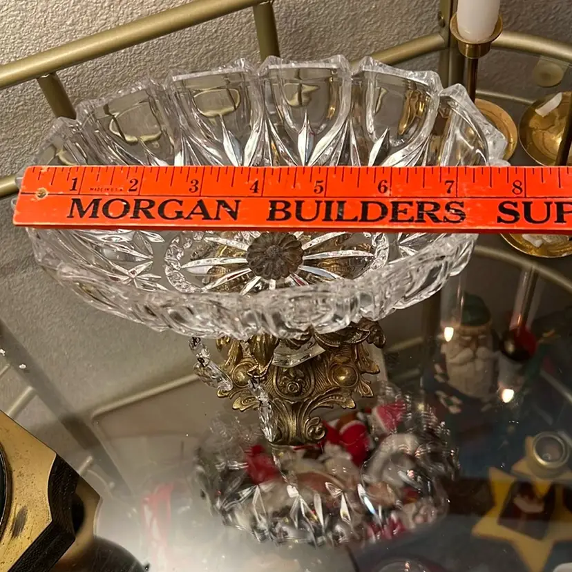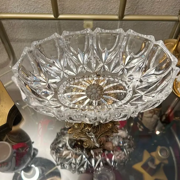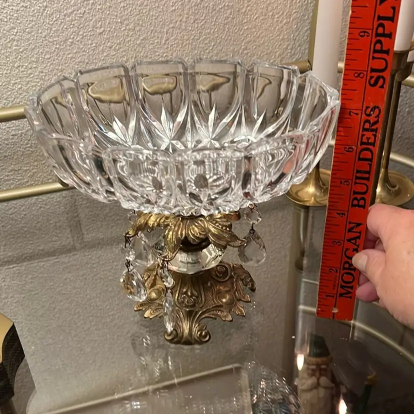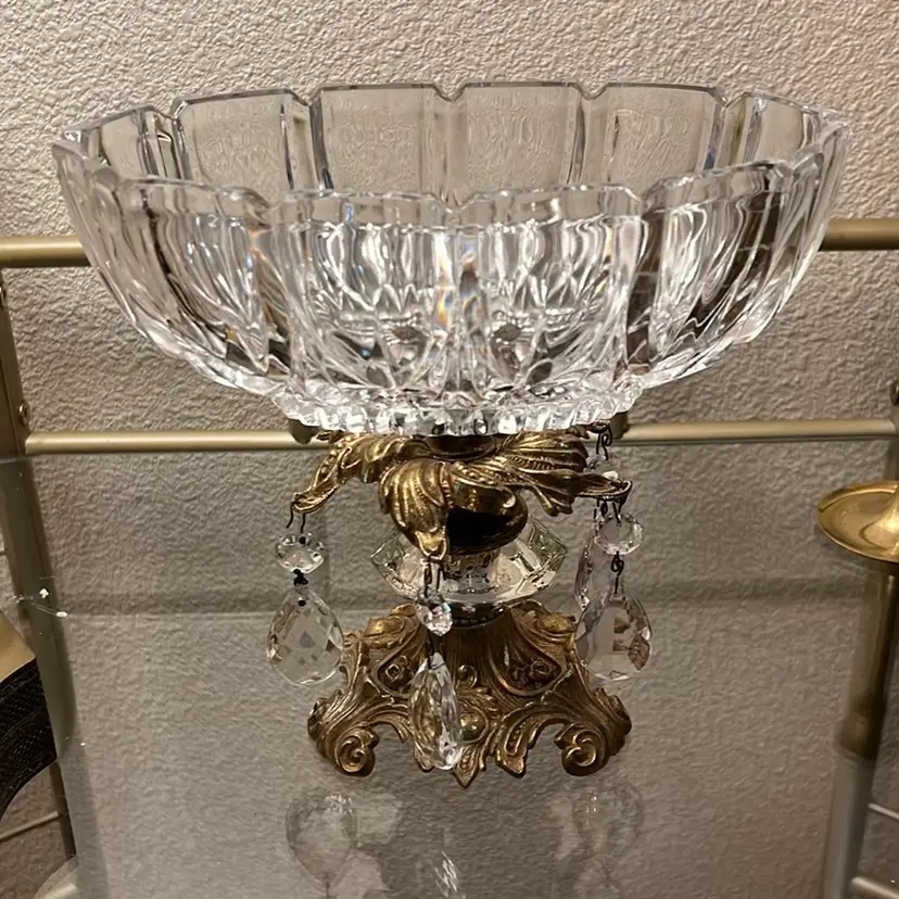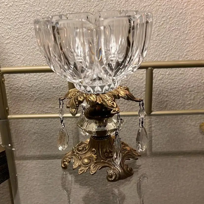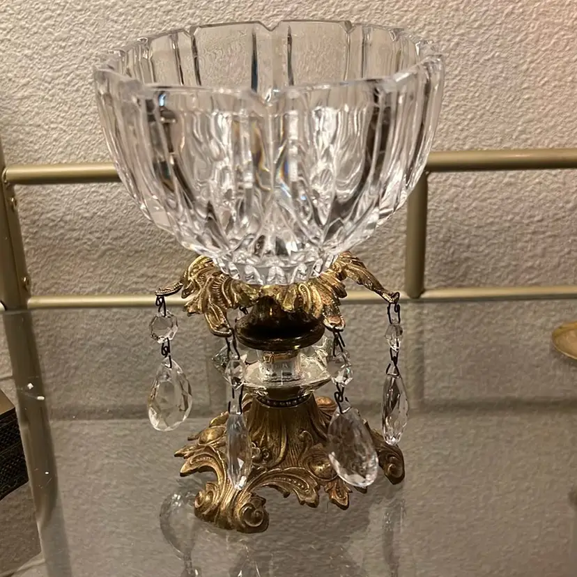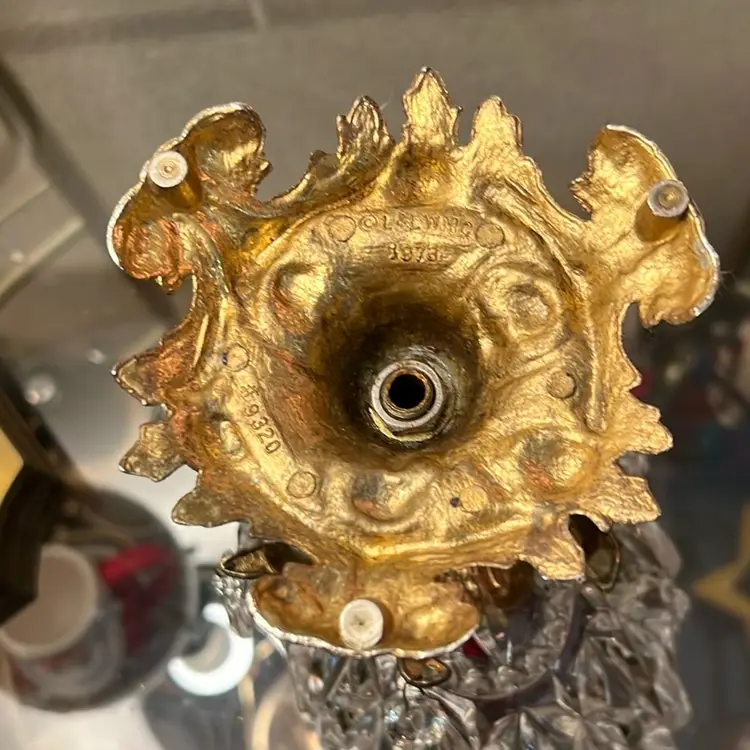 Very good condition, missing one hanging prism, no chips or cracks, tarnish consistent with age