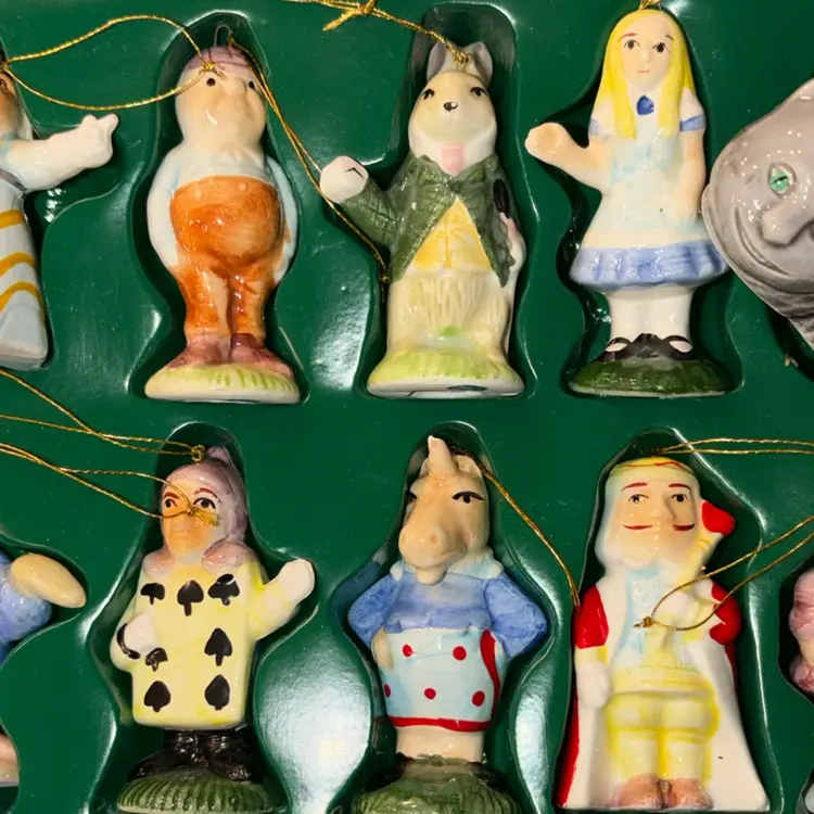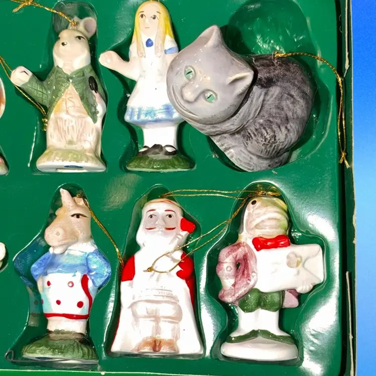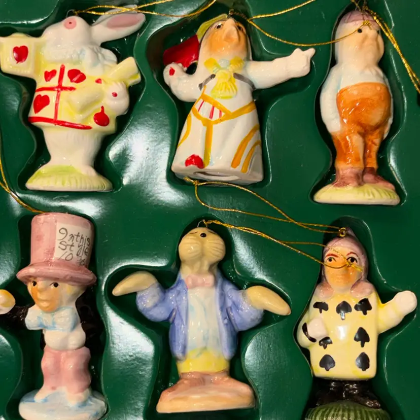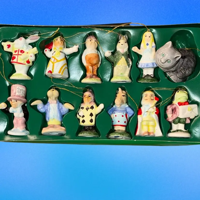 In original box. Lot of 12 1979 A Company Of Friends Alice In Wonderland Ornaments Japan Ceramic with original hanging cords.