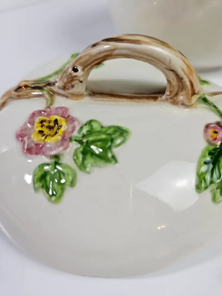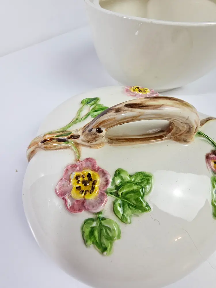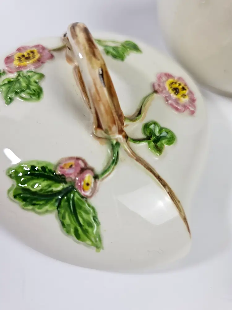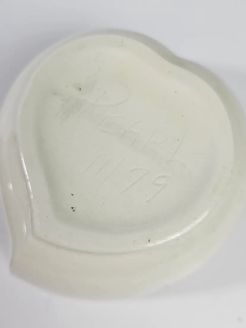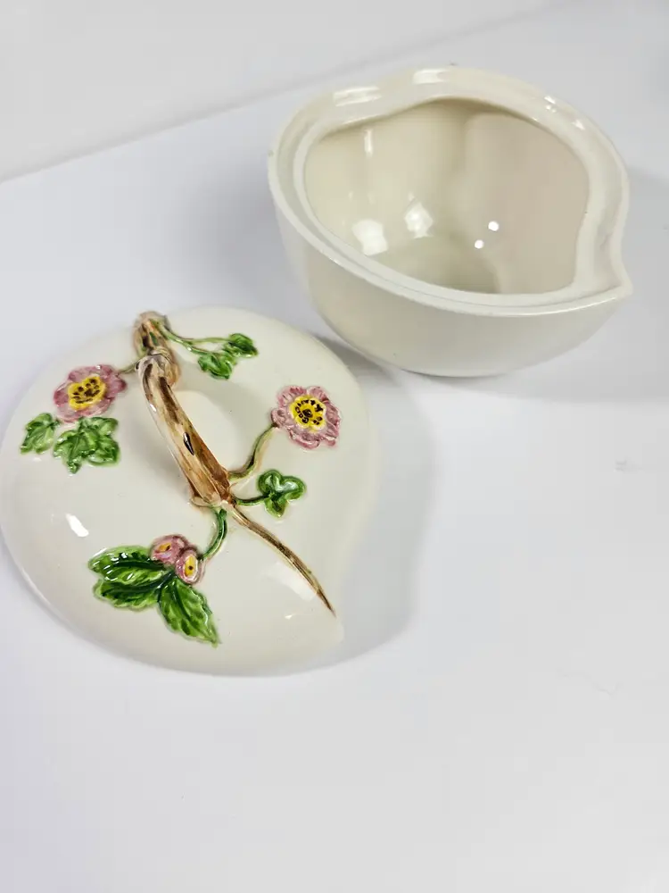 This charming ceramic trinket box, crafted by Pearl in 1979, is a beautiful example of late 20th-century decorative artistry. The heart-shaped base features a smooth, glossy off-white glaze, while the matching lid showcases a hand-painted, raised floral motif with pink blossoms, green leaves, and a twisting brown vine that doubles as a handle.