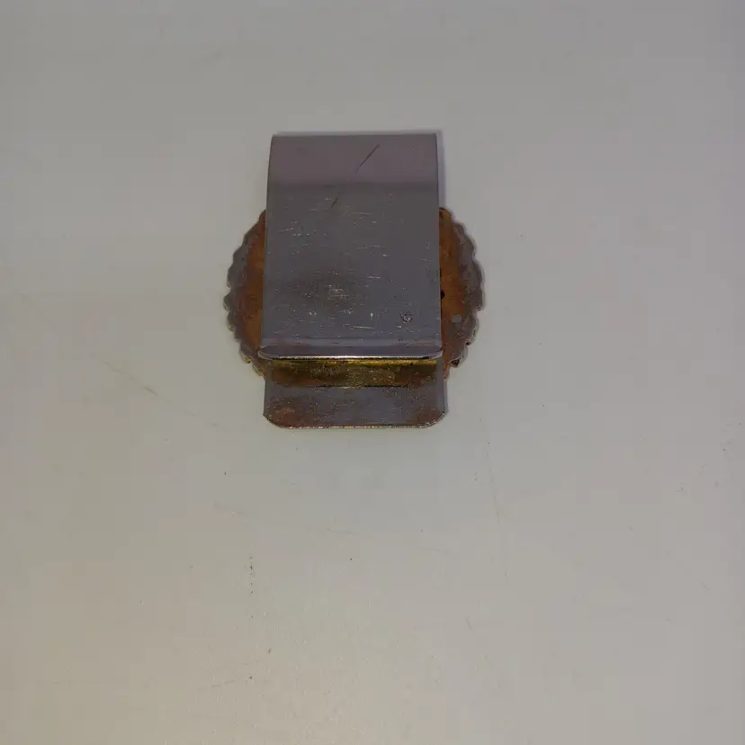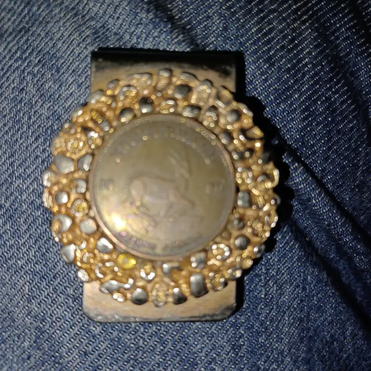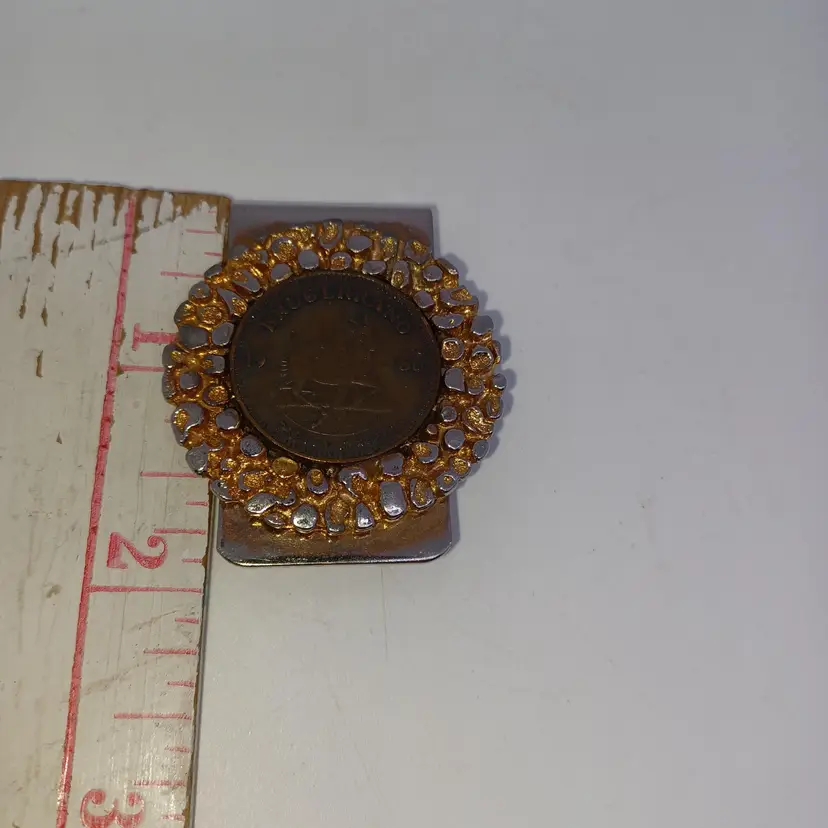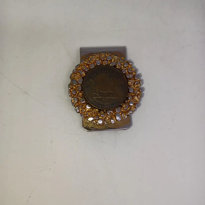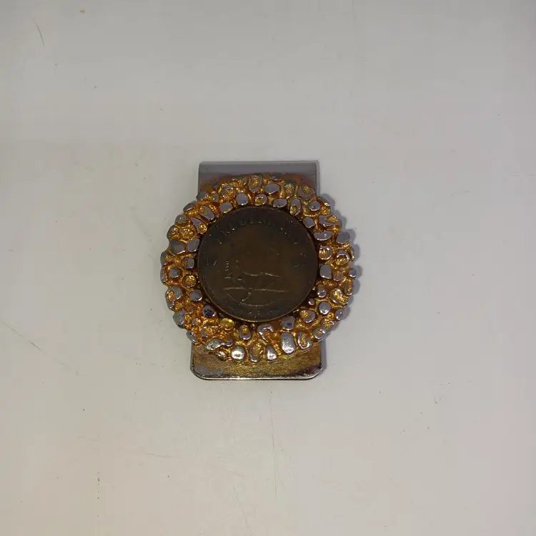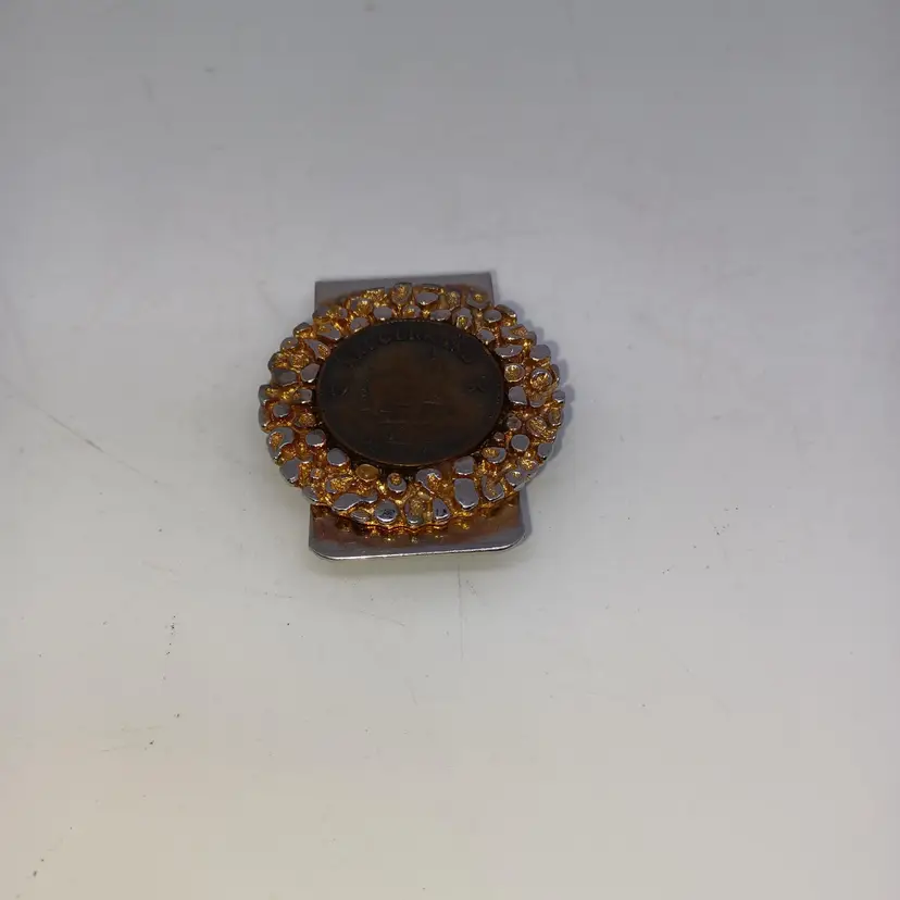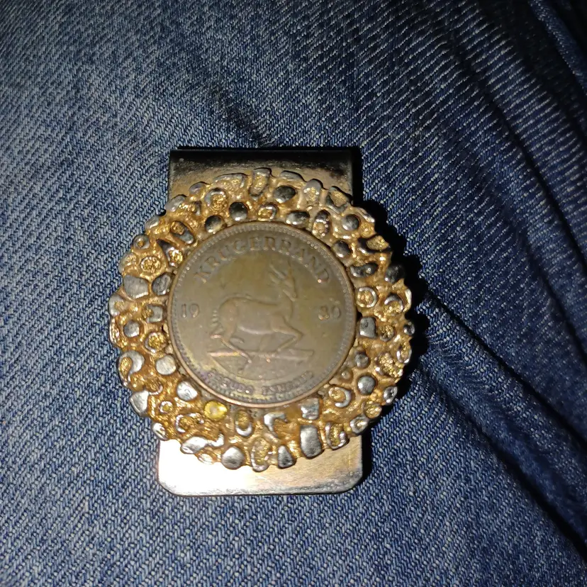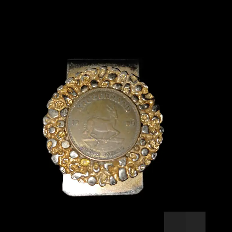 This is a fun 1980 krugerrand pseudo fyngoud coin with faux gold nugget design slide fold over style money clip. The shiny gold tone clip has a fake copper coin that is meant to look like a krugerrand. The wide border around the coin looks like gold nuggets.