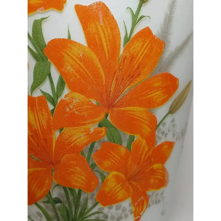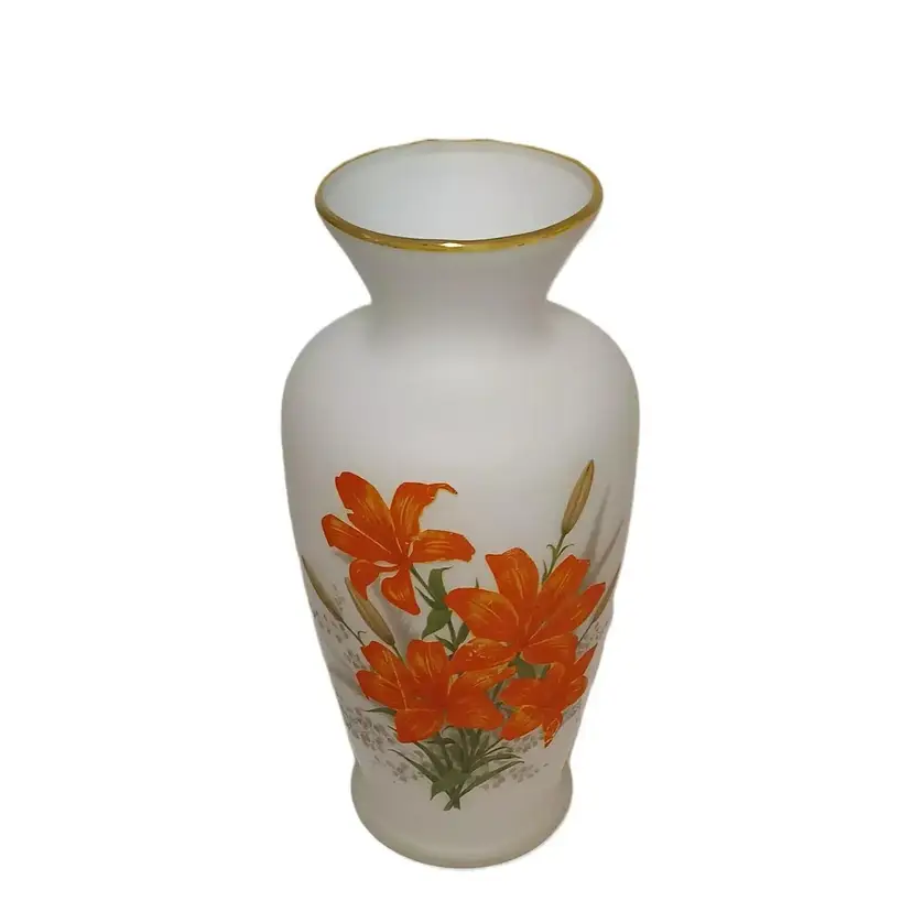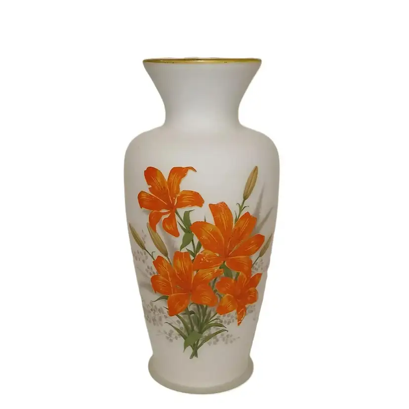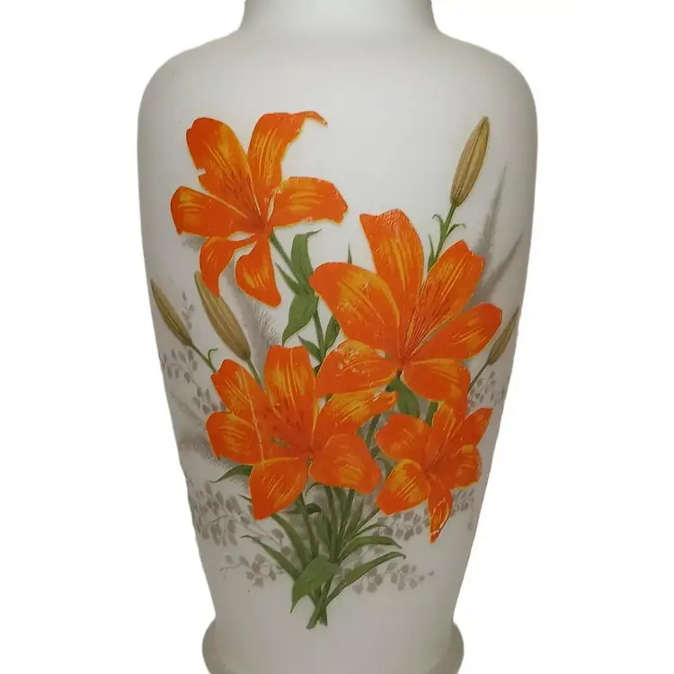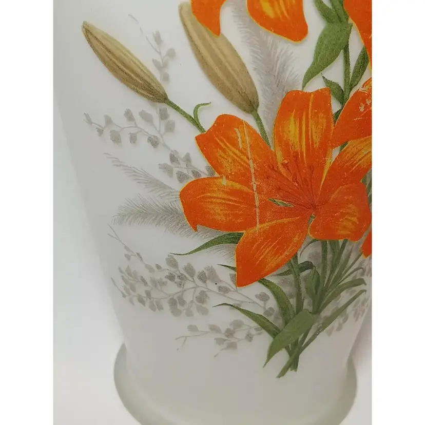 Enesco White Satin Glass Vase with orange day lily design. Gold trimmed rim and painted flowers on the front of the vase. All white satin on the back. Vintage from the 1980's. Pleasing colors for all seasons. Would incorporate easily into any style décor. Has some slight paint wear and a manufacture flaw on the rim. In good vintage condition. Please see photos for details. Approximately 8" tall and 3-1/2" wide.