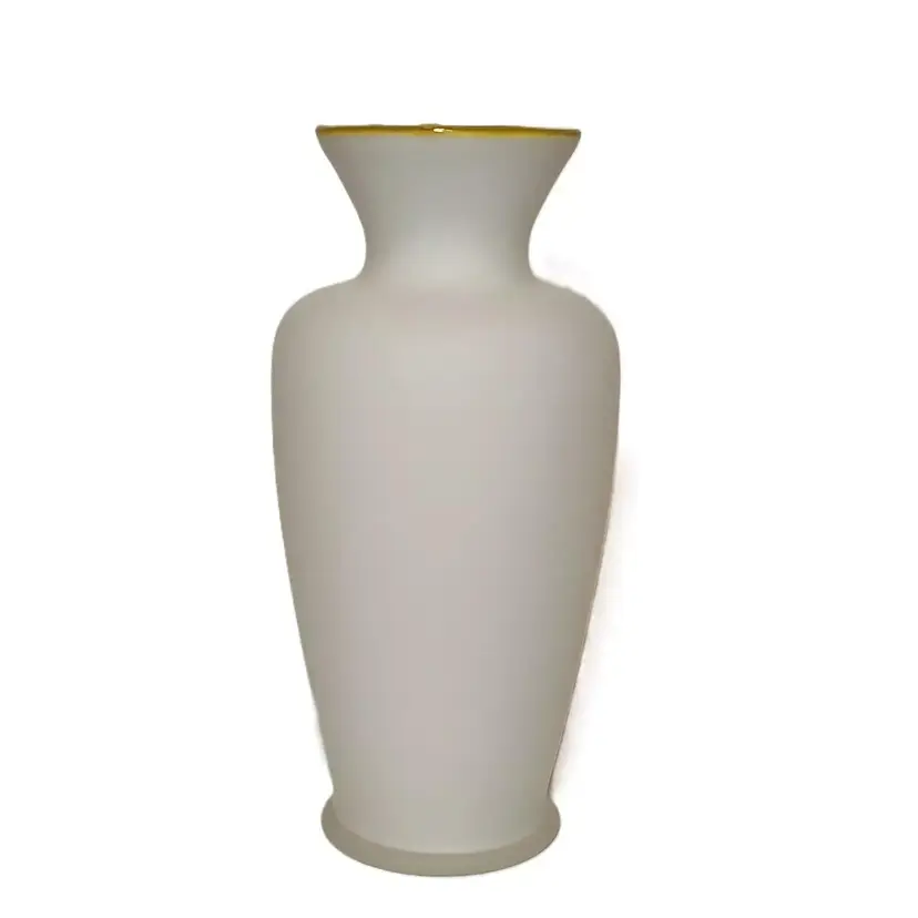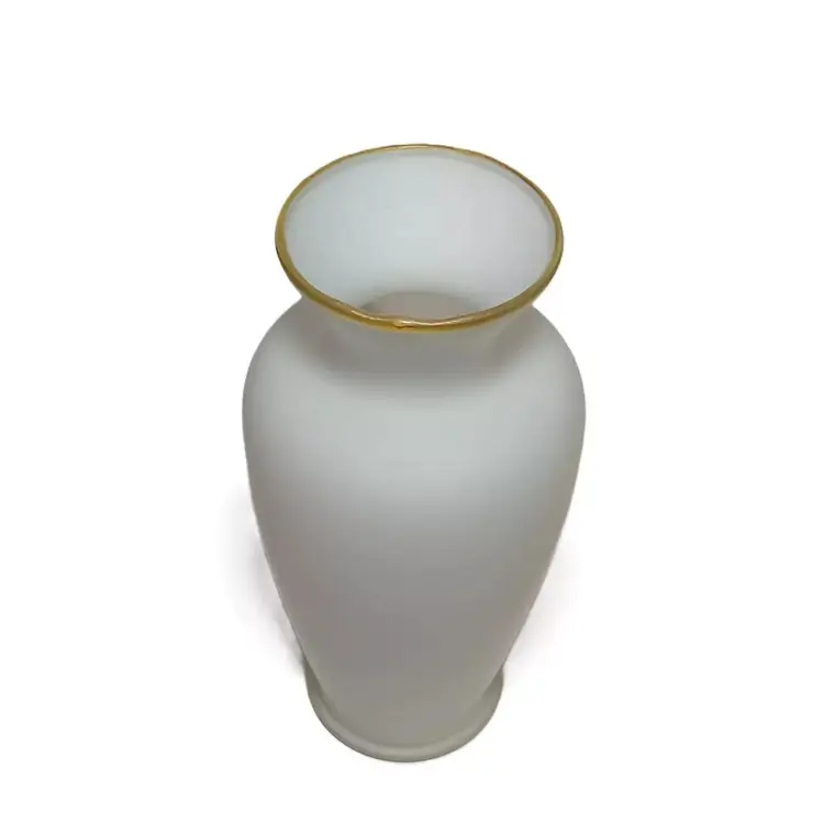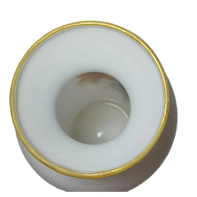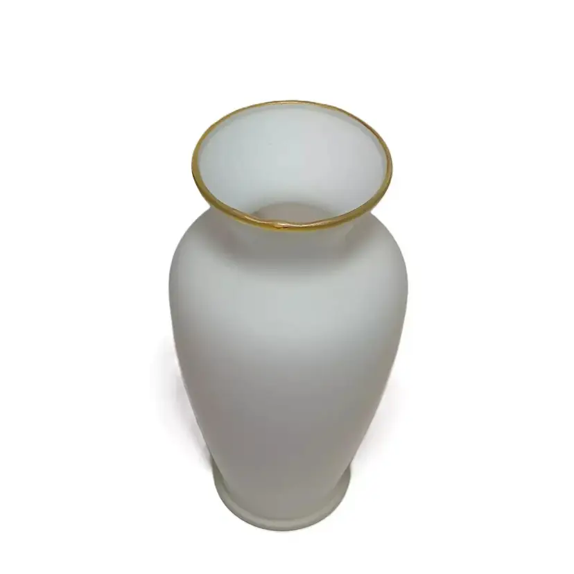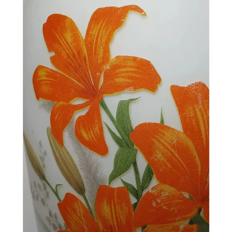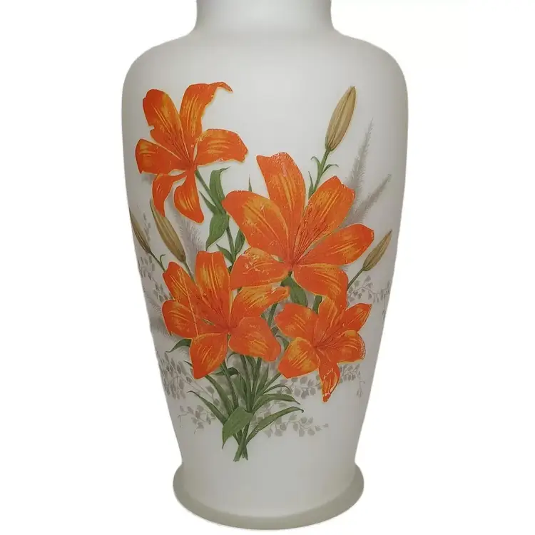Enesco White Satin Glass Vase with orange day lily design. Gold trimmed rim and painted flowers on the front of the vase. All white satin on the back. Vintage from the 1980's. Pleasing colors for all seasons. Would incorporate easily into any style décor. Has some slight paint wear and a manufacture flaw on the rim. In good vintage condition. Please see photos for details. Approximately 8" tall and 3-1/2" wide.